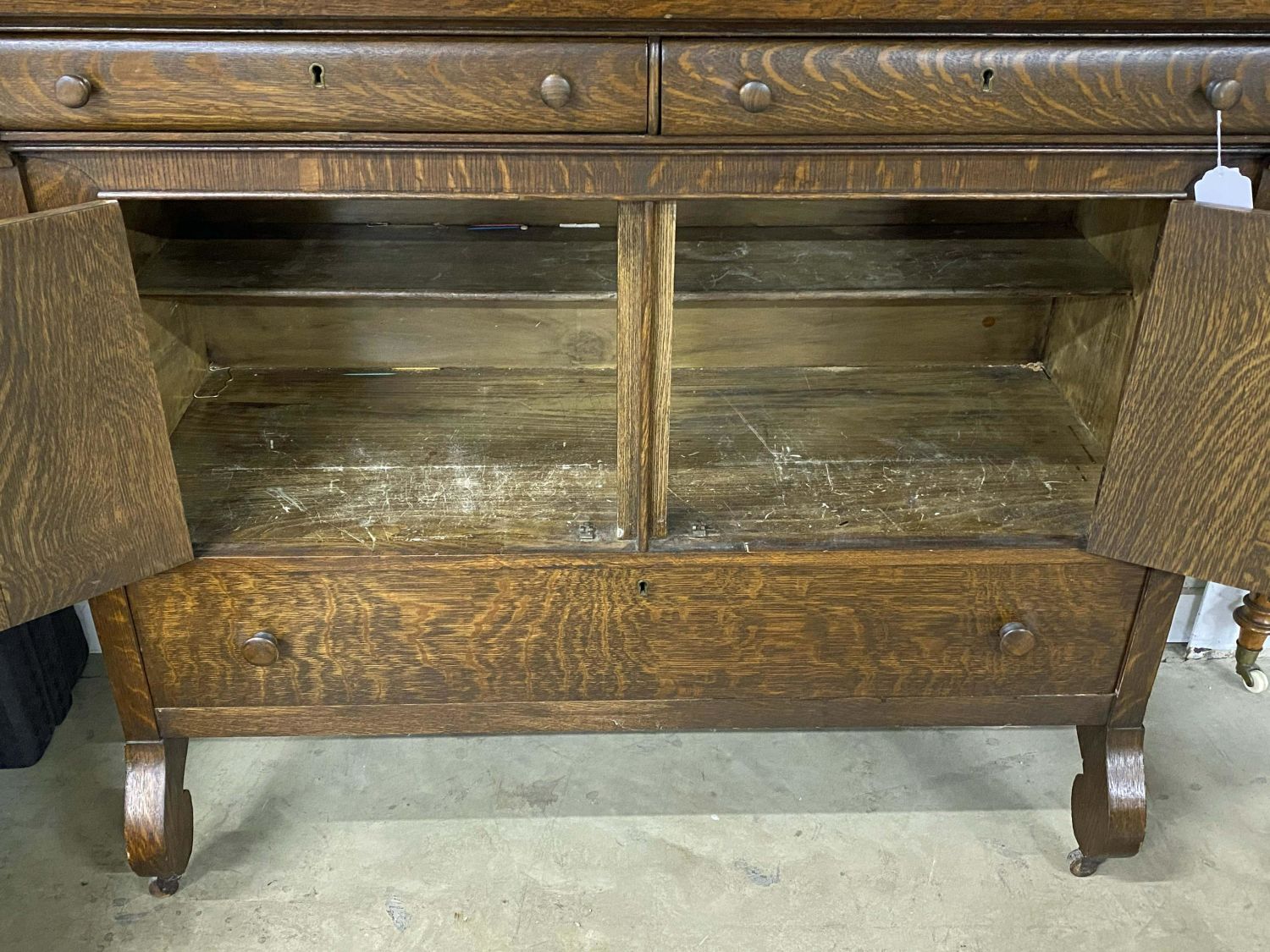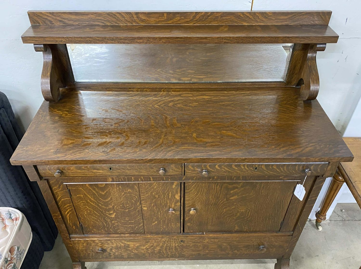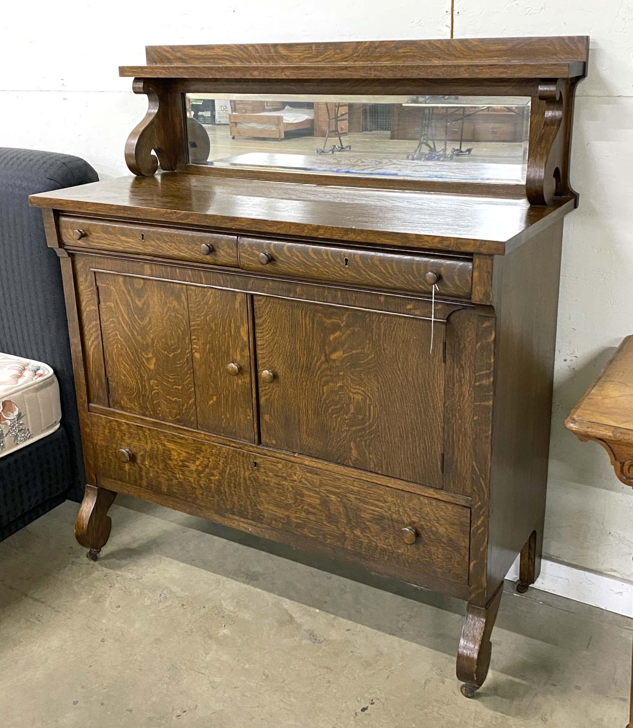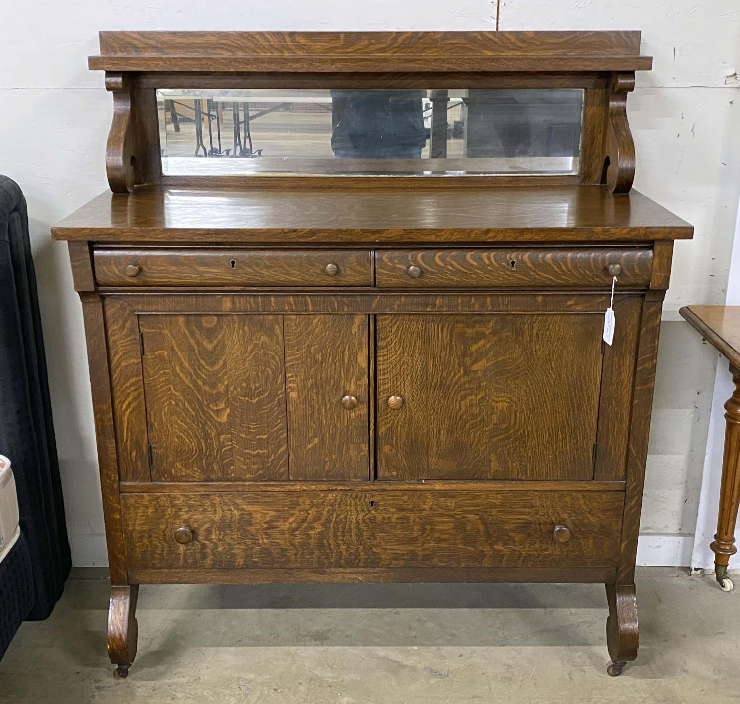 Oak Empire Sideboard w/ Beveled Mirror. Measures 53" high x 46" wide x 19" deep. Condition- Sideboard is in overall good condition. See photos.