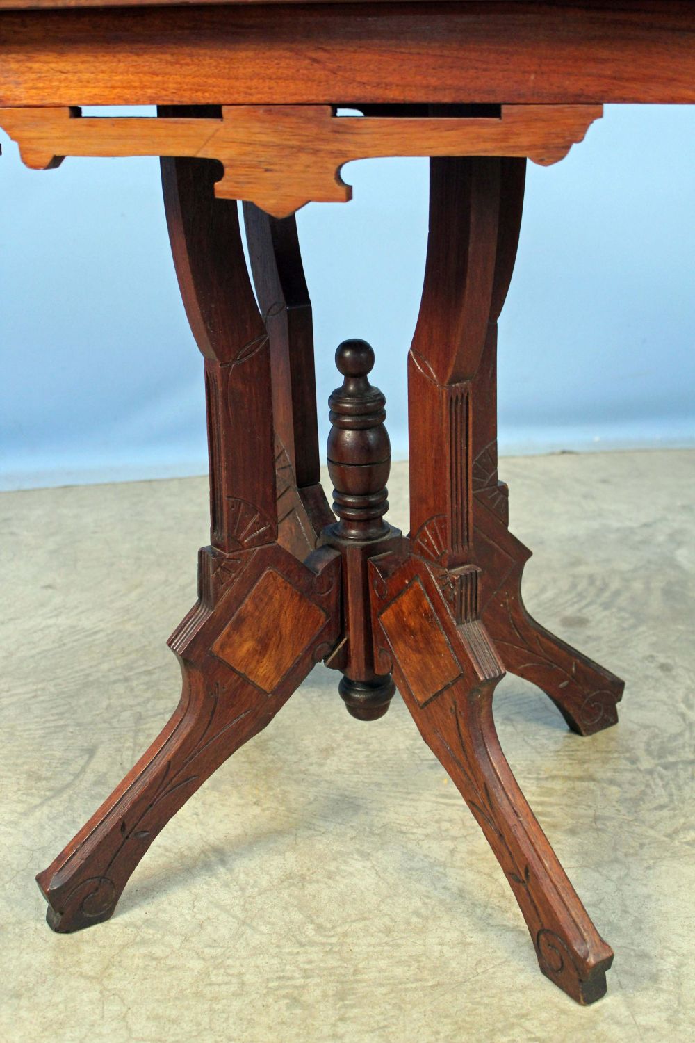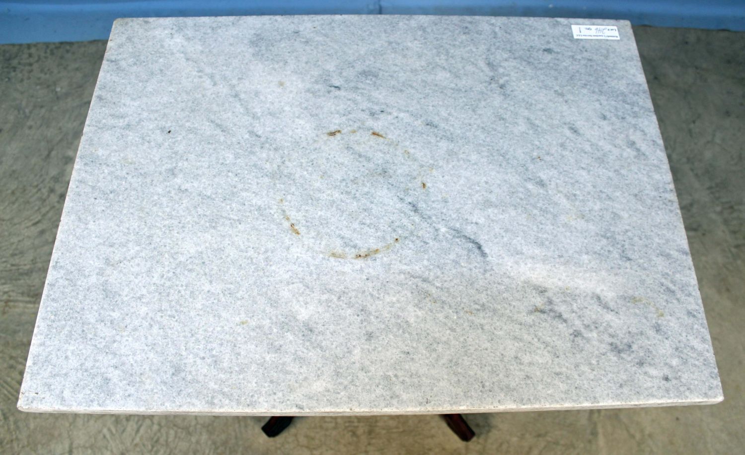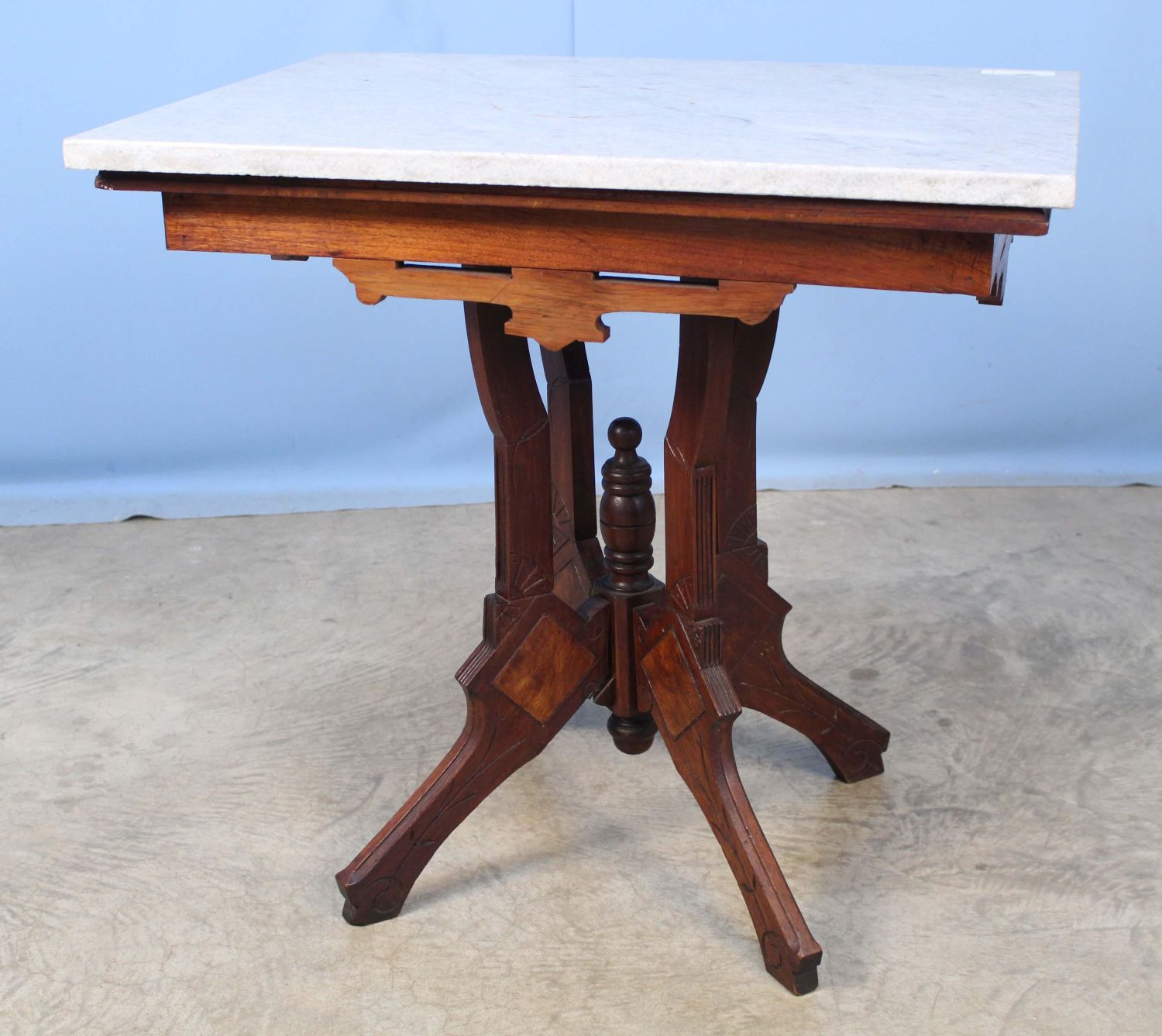 Victorian Granite Top Center Table with Walnut Finish. Measures 27 3/4" x 21" x 29". Condition- Table is in overall good condition. Pedestal needs to be glued and repaired.