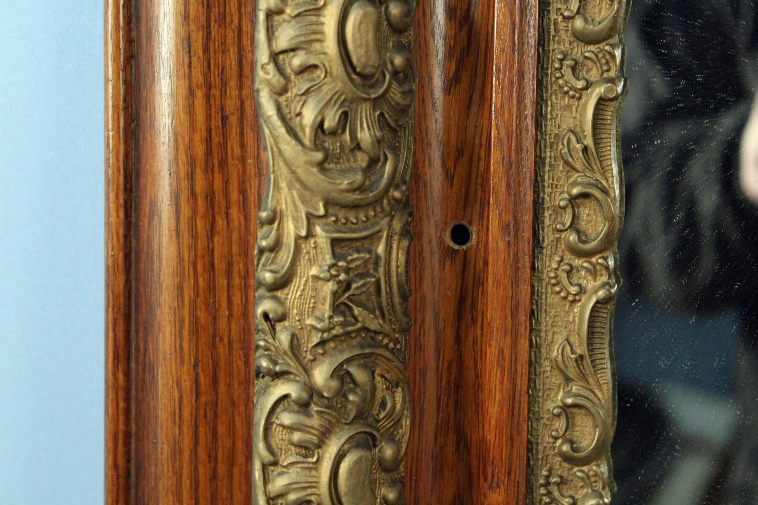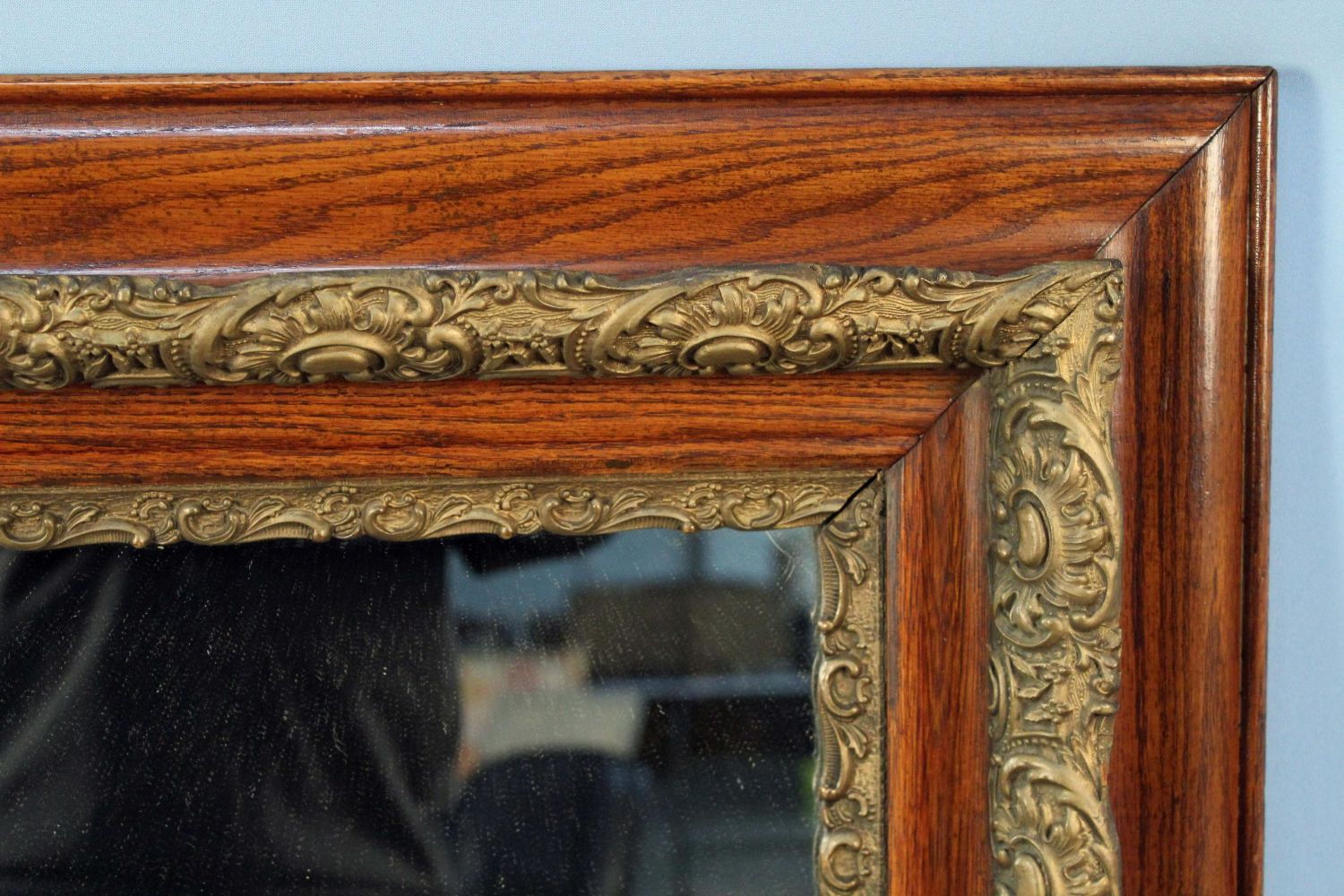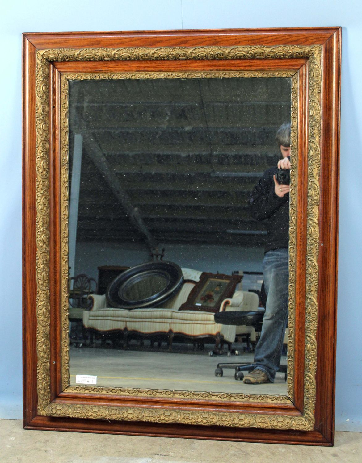 Oak and Gold Paint Gesso Wall Mirror. Measures 39" x 50". Condition- Mirror is in good condition. Does have three holes through wood to attach to wall.