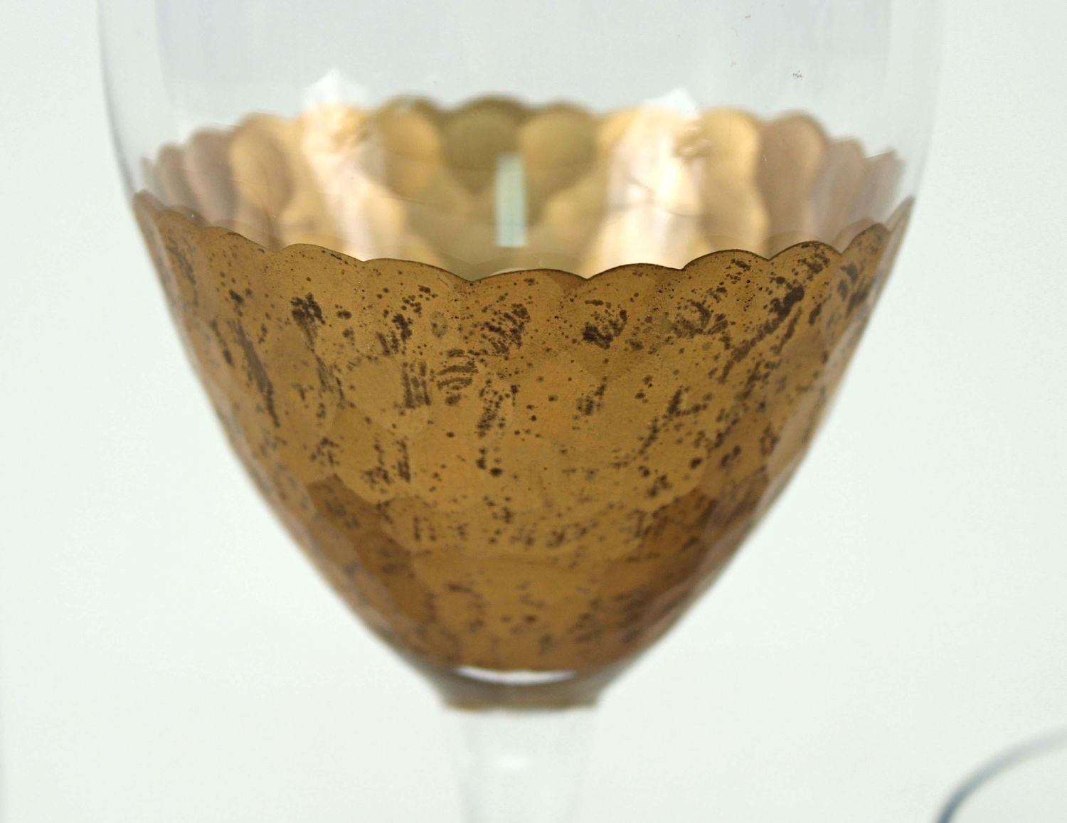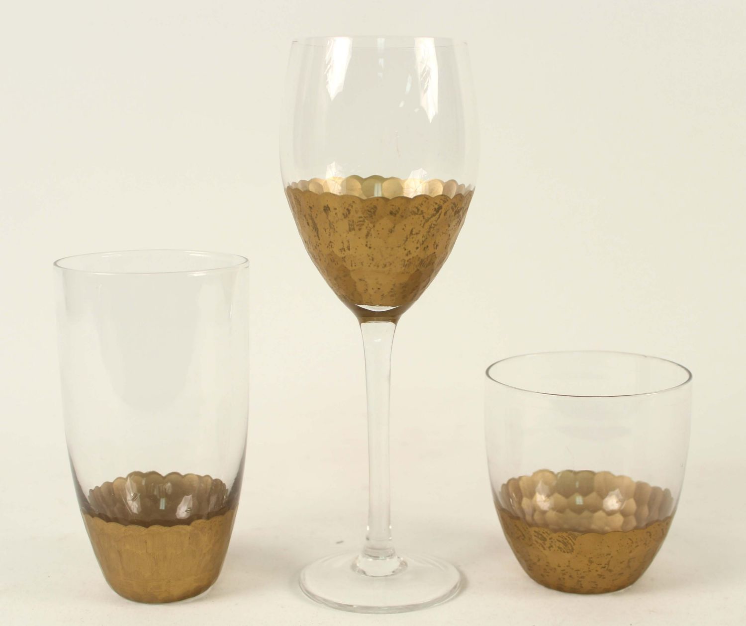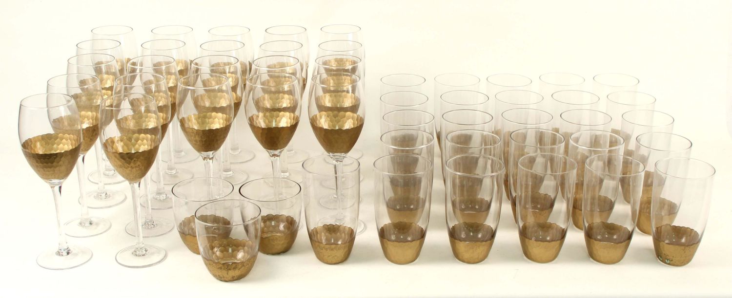 Set of Vittorio Style Stems & Glasses, 51 Pieces. Glasses have a faux hammered metal base with an antique gold foil overlay. (22) Wine glasses. Measure 9 1/8" high. (26) Water glasses. Measure 5 5/8" high. (3) Highballs. Measure 3 5/8". Condition- The color on the bases of these glasses may or may not be original, could have been a bright gold but have tarnished by wear, use, etc. Glasses are damage free. See photos.