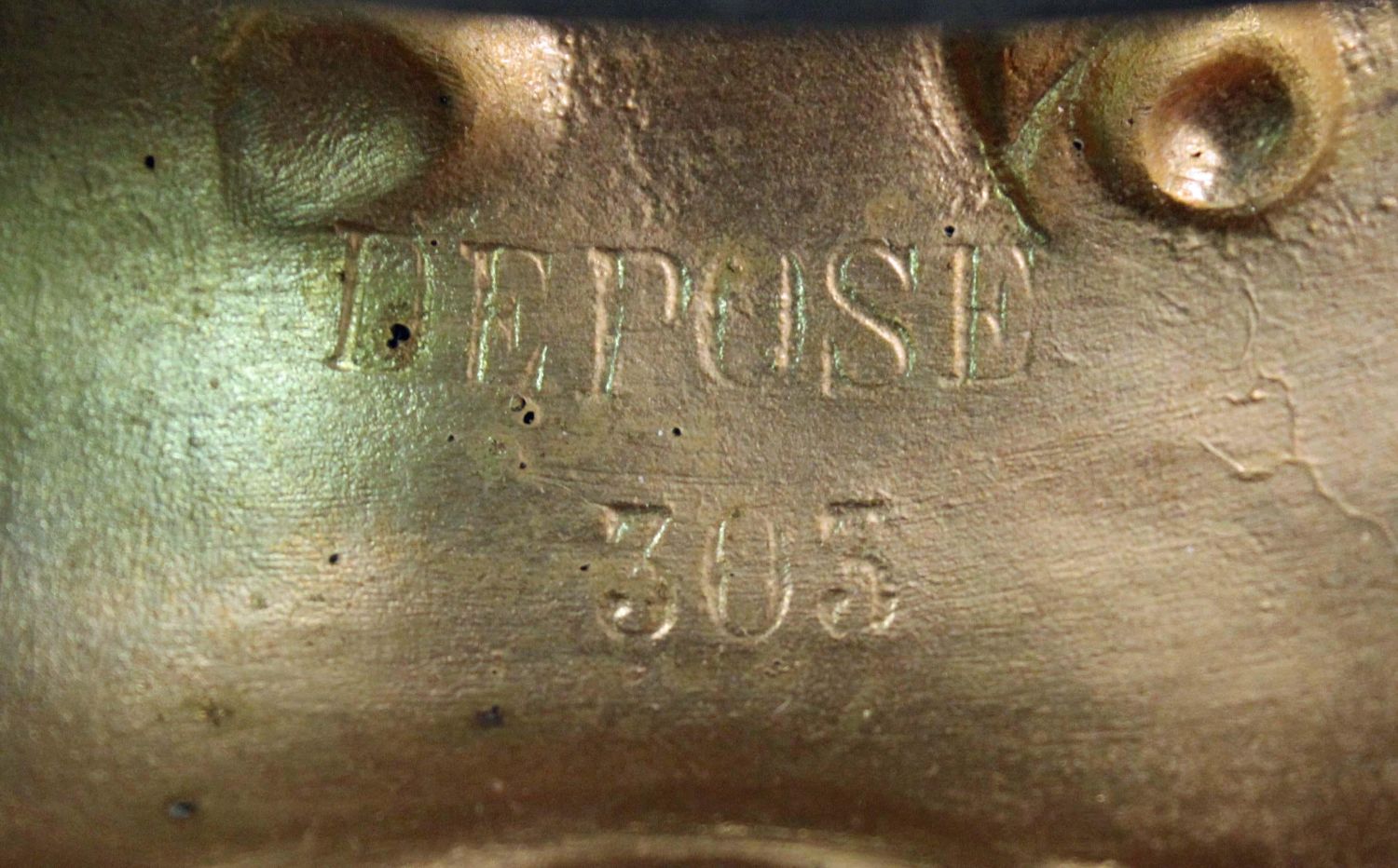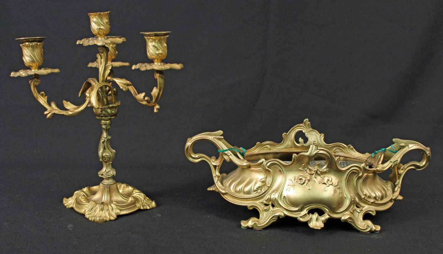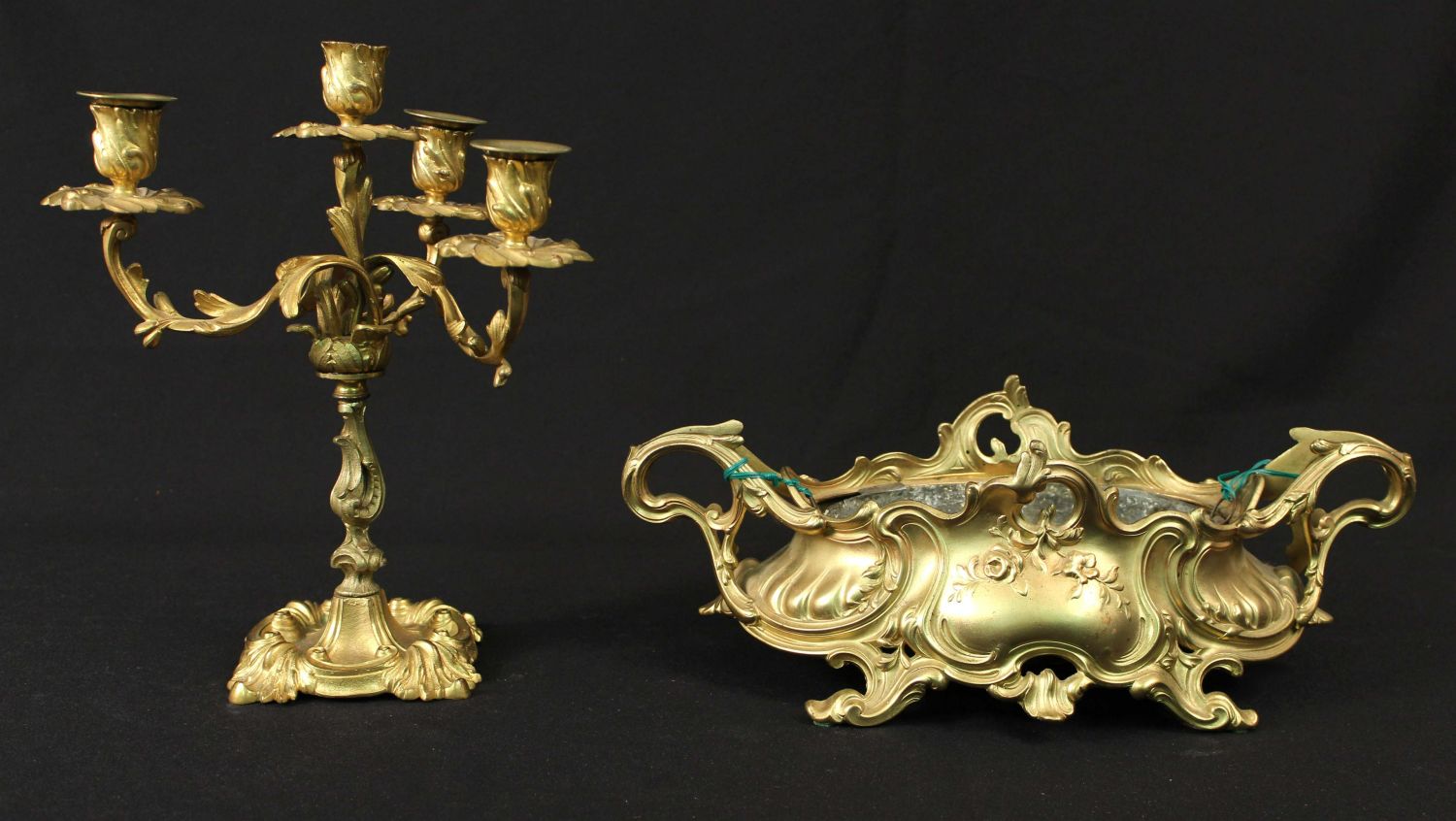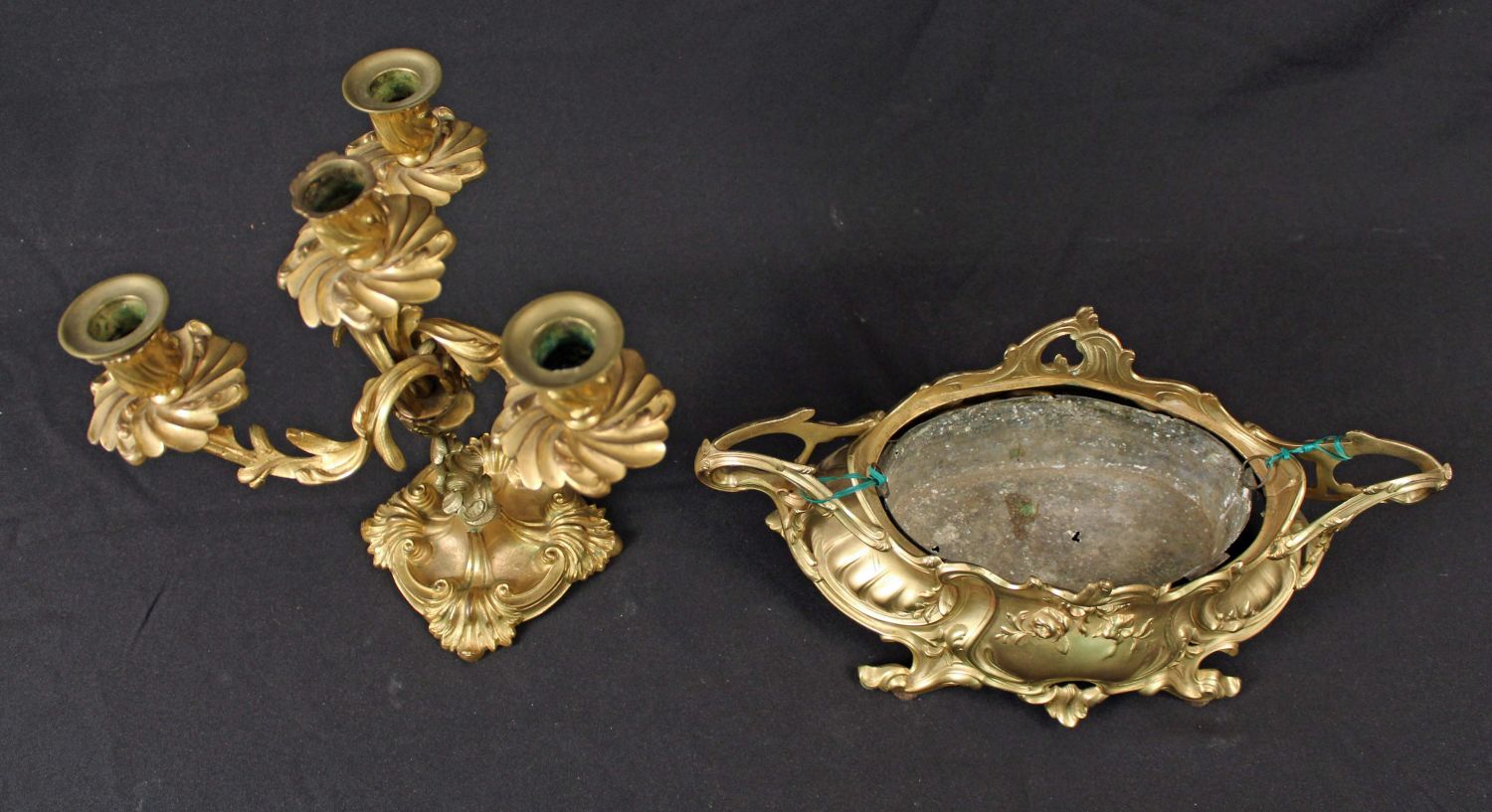 (1) Rococo gilt bronze four light candelabra. Measures 11 1/2" high x 9 1/2" dia. (1) Rococo planter with insert. Marked, "Depose 303." Measures 7" wide x 14 1/2" long. (1) Antique French Art Nouveau Depose #303, heavy spelter metal jardiniere/centerpiece or planter. The jardiniere measures 5 1/4" high x 14 1/2" long. Condition- Candelabra has some wear to gilt and is missing one candle ring insert. Jardiniere is in good condition. The tin insert/planter has a hole and is missing two to three tabs that hold it in place. See photos.