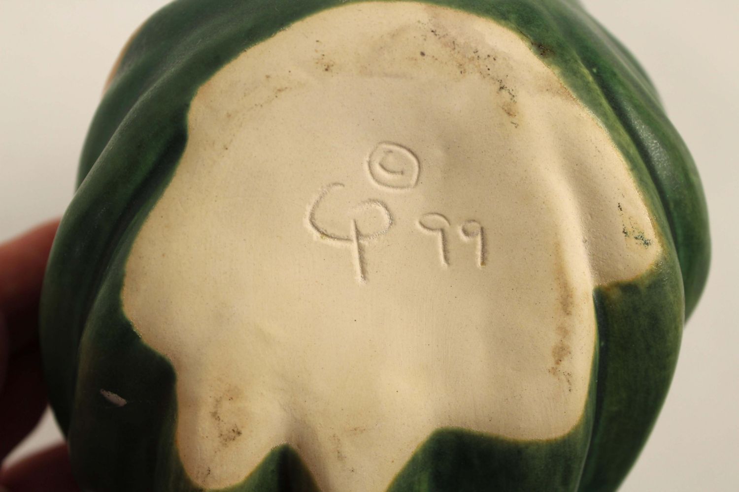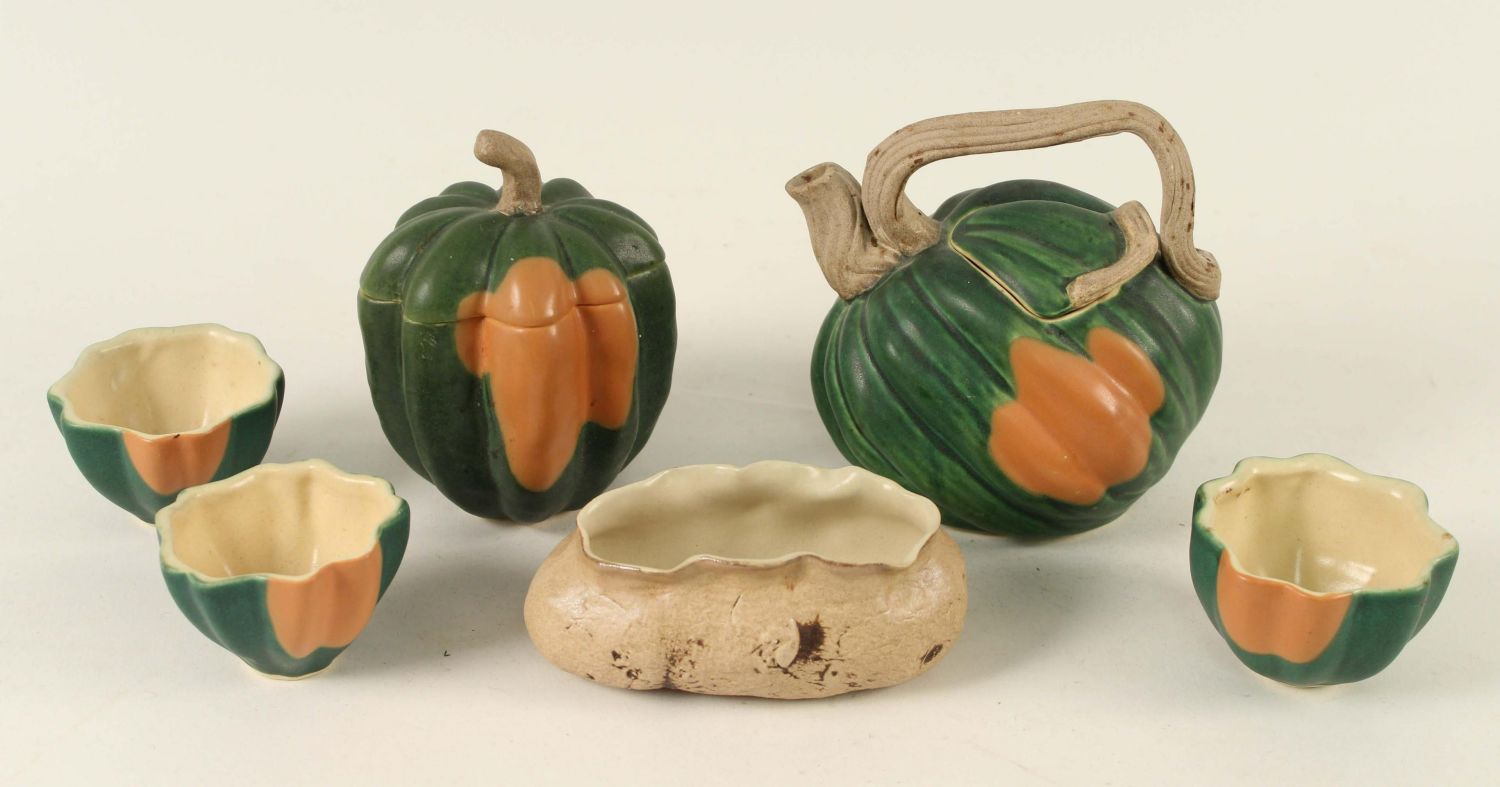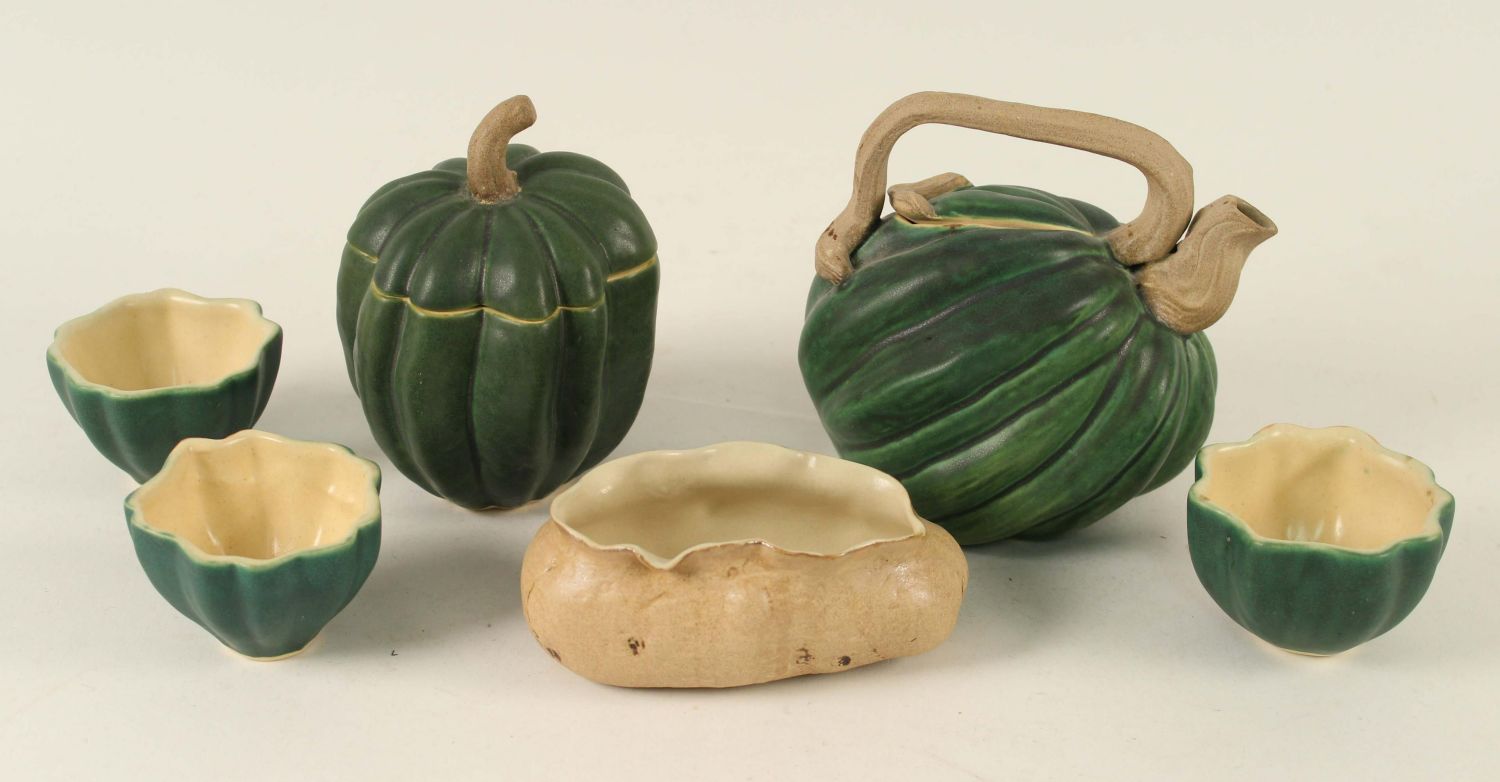 John Bauman Stoneware Teapot, Three Cups, & Packet Holder. (1) Gourd teapot. Measures approx. 6" high. (1) Gourd sugar with lid. Measures 5 1/2" high. (3) Gourd cups. Measures 2" high. (1) Potato sugar substitute packet open holder. Measures 2 1/4" high. Condition- Stoneware is in good conditon. See photos.