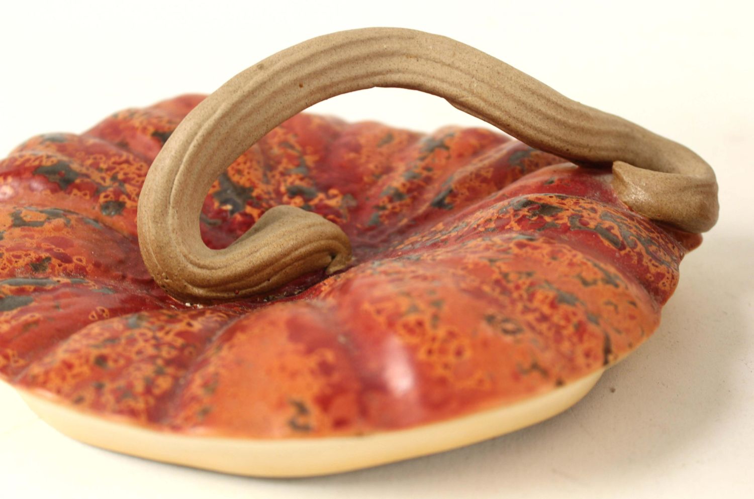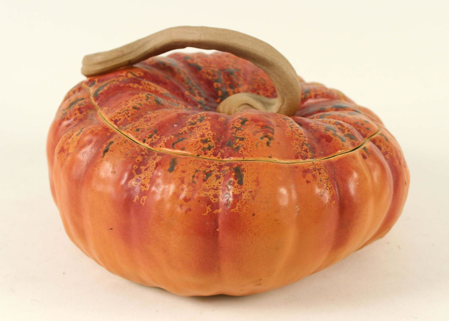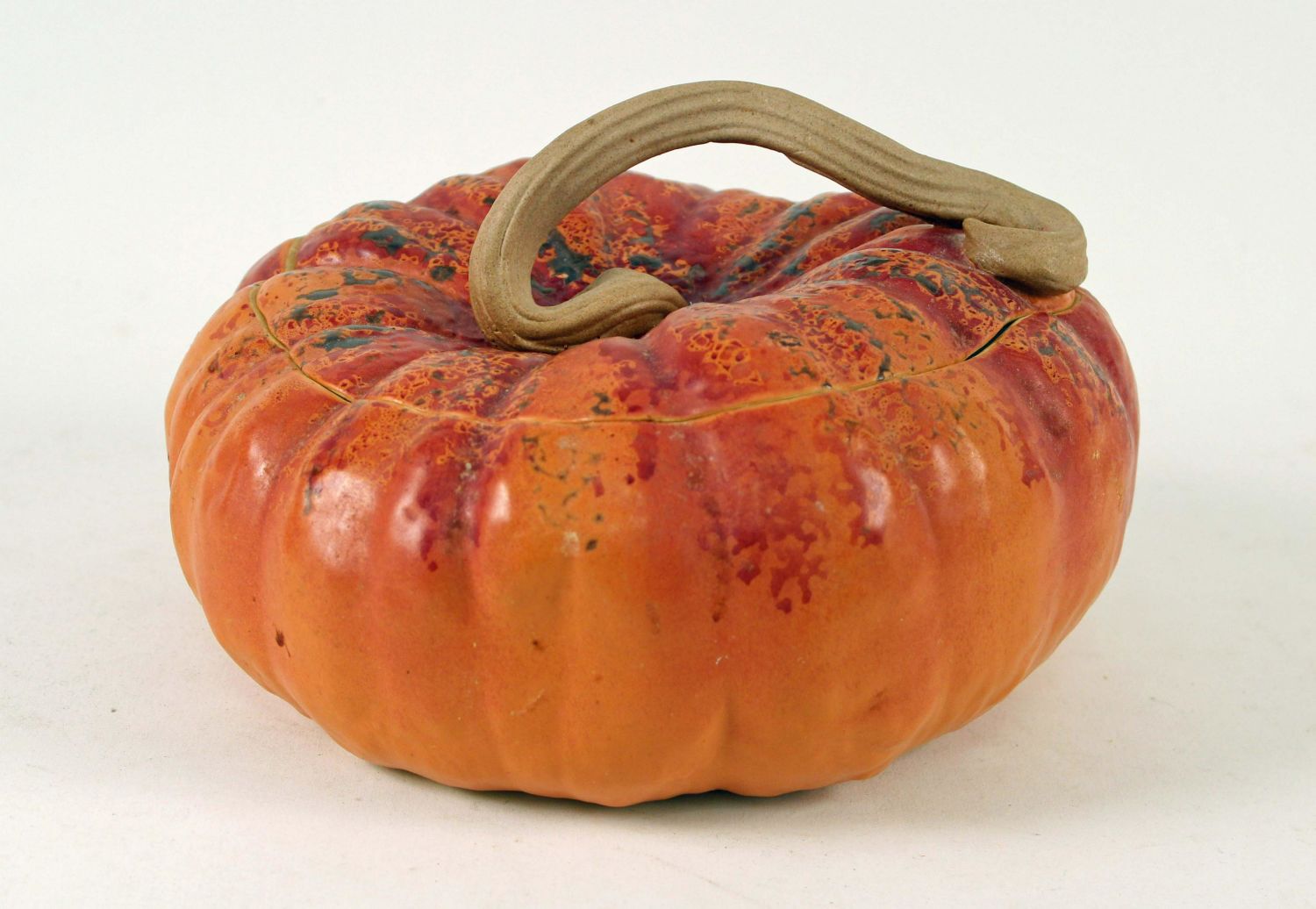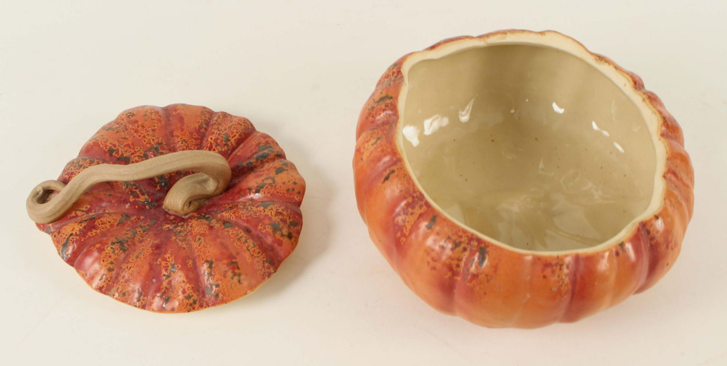 John Bauman Stoneware Pottery Large Pumpkin Cookie Jar. Measures 6" high x 10" dia. Condition- Cookie jar is in good condition. See photos.