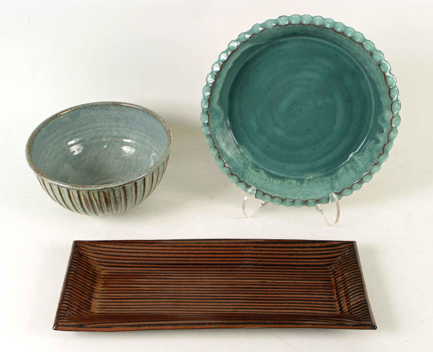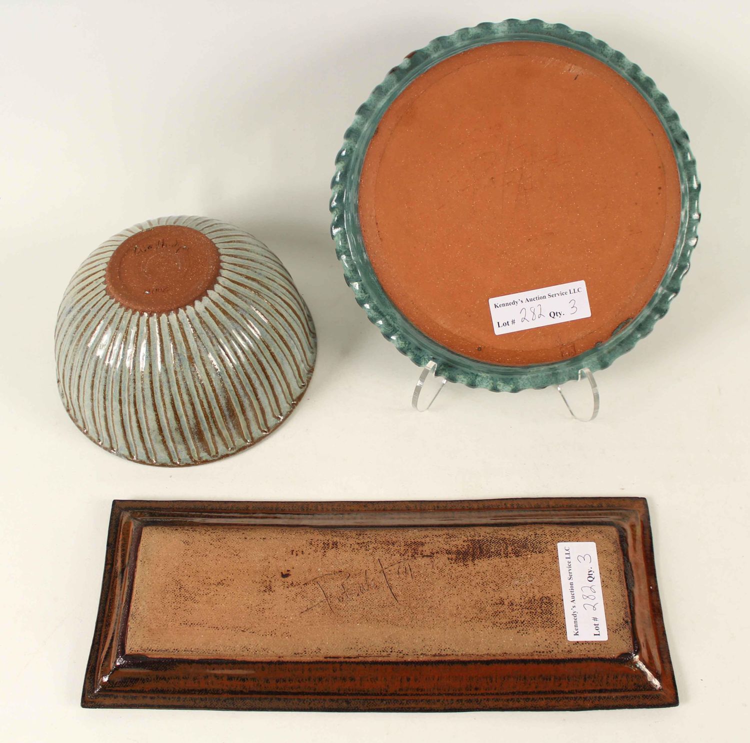 Three Pcs. of Modern Pottery Pie Dish, Etc. (1) Lots of Pots pie dish. Measures 10 1/2" dia. (1) Lots of Pots vegetable tray. Measures 5 3/4" x 14 3/4". (1) Mixing bowl. Undecipherable signature on bottom. Measures 4" high x 8" dia. Condition- Pottery is in good condition. See photos.