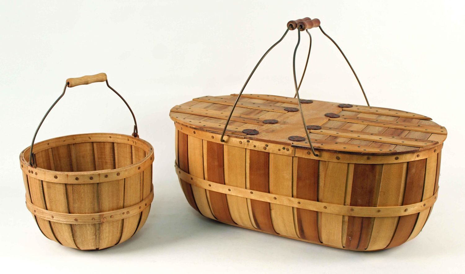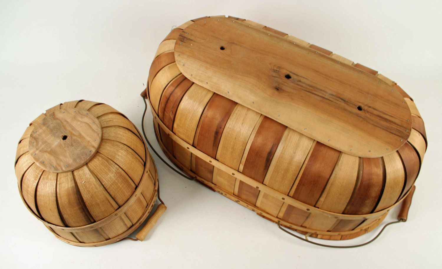 Myrtlewood Picnic and Apple Basket. These baskets are made with bentwood wraps, copper brads, leather hinges, copper handles, and wooden grips. These baskets are unmarked but are believed to be Barber’s Basket. (1) Double lid Myrtlewood picnic basket. Basket Measures approx. 10" high x 13 1/2" x 24". (1) Apple basket. Measures 7 7/8" x 10 5/8" dia. Condition- Baskets are in good condition. See photos.