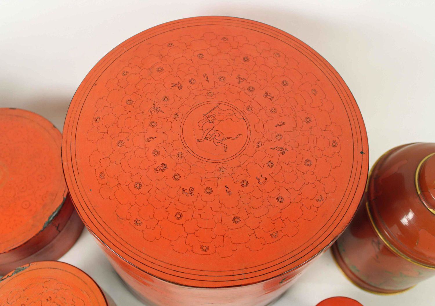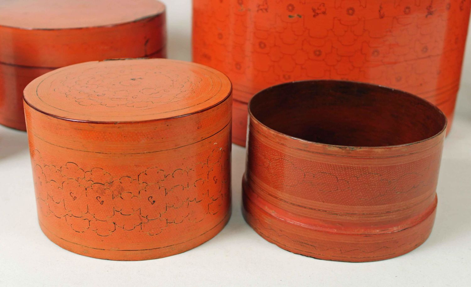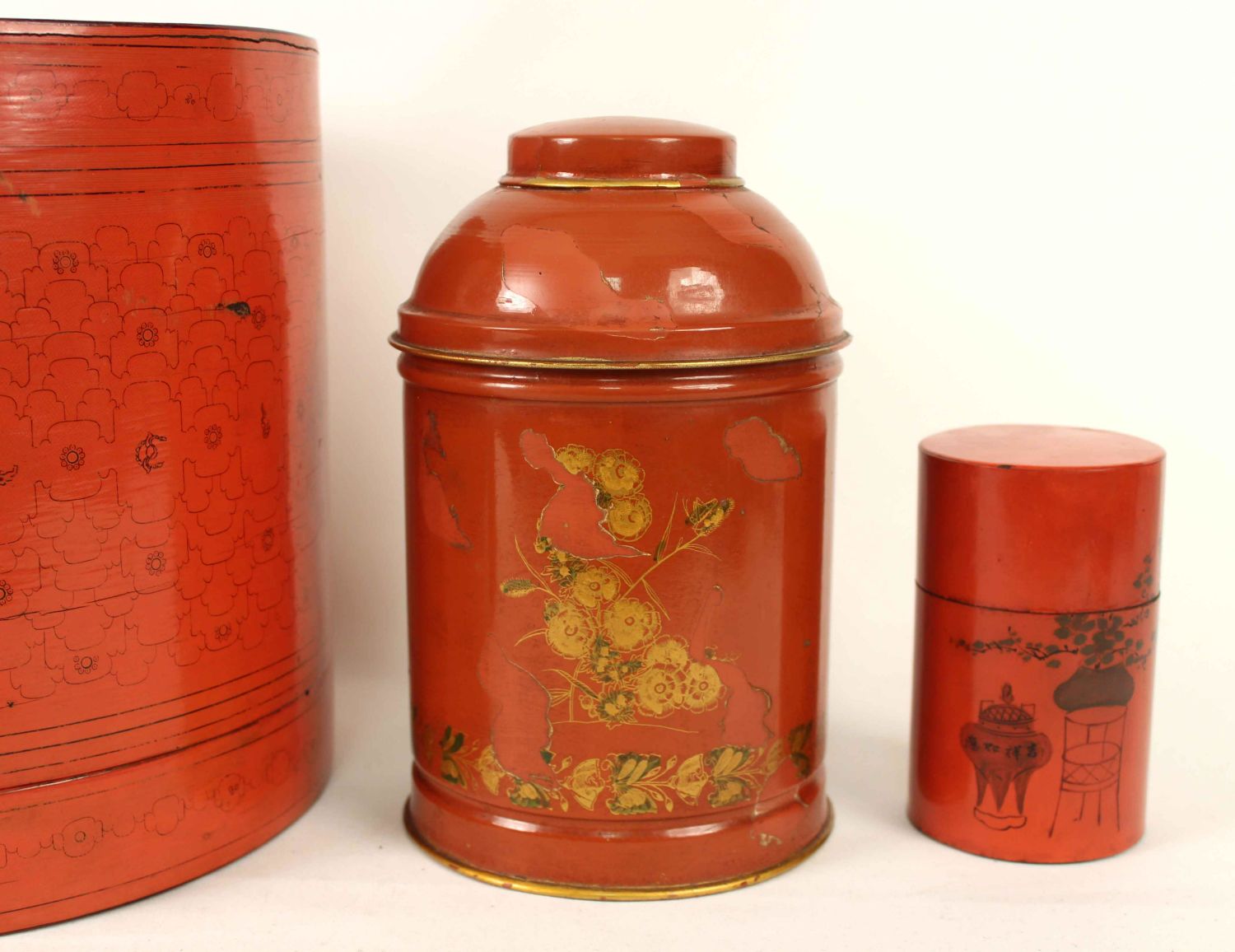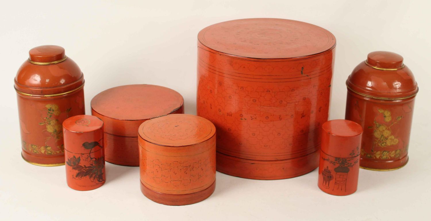 Italian Canisters, Chinese Paper Mache Boxes, and Two Painted Chinese Tin Boxes. (2) Italian tin canisters cinnabar with gold trim. Labels on bases marked, "Made in Italy." Measure 8 5/8" high x 5 1/4" dia. (2) Small Chinese tin canisters. Measure 4 5/8" high. (3) Chinese paper mache boxes. The largest measures 9 1/2" high x 10 1/2" dia. Condition- The paper mache has some small damages. The two Chinese tins have some paint loss and dents. The Italian canisters have considerable paint loss, exposing primer which is a very similar color to the exterior. See photos.