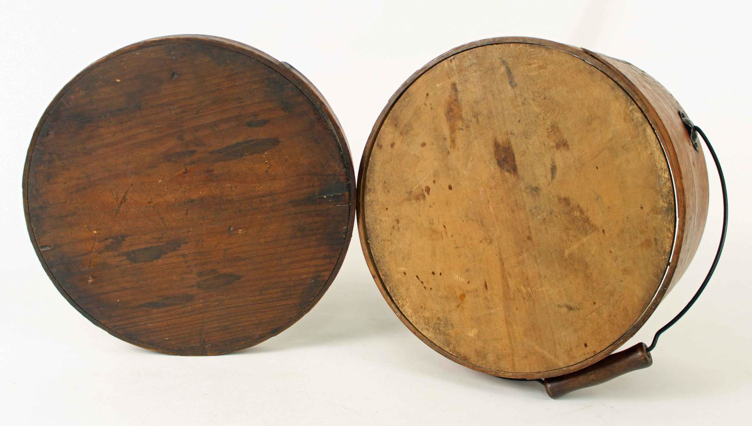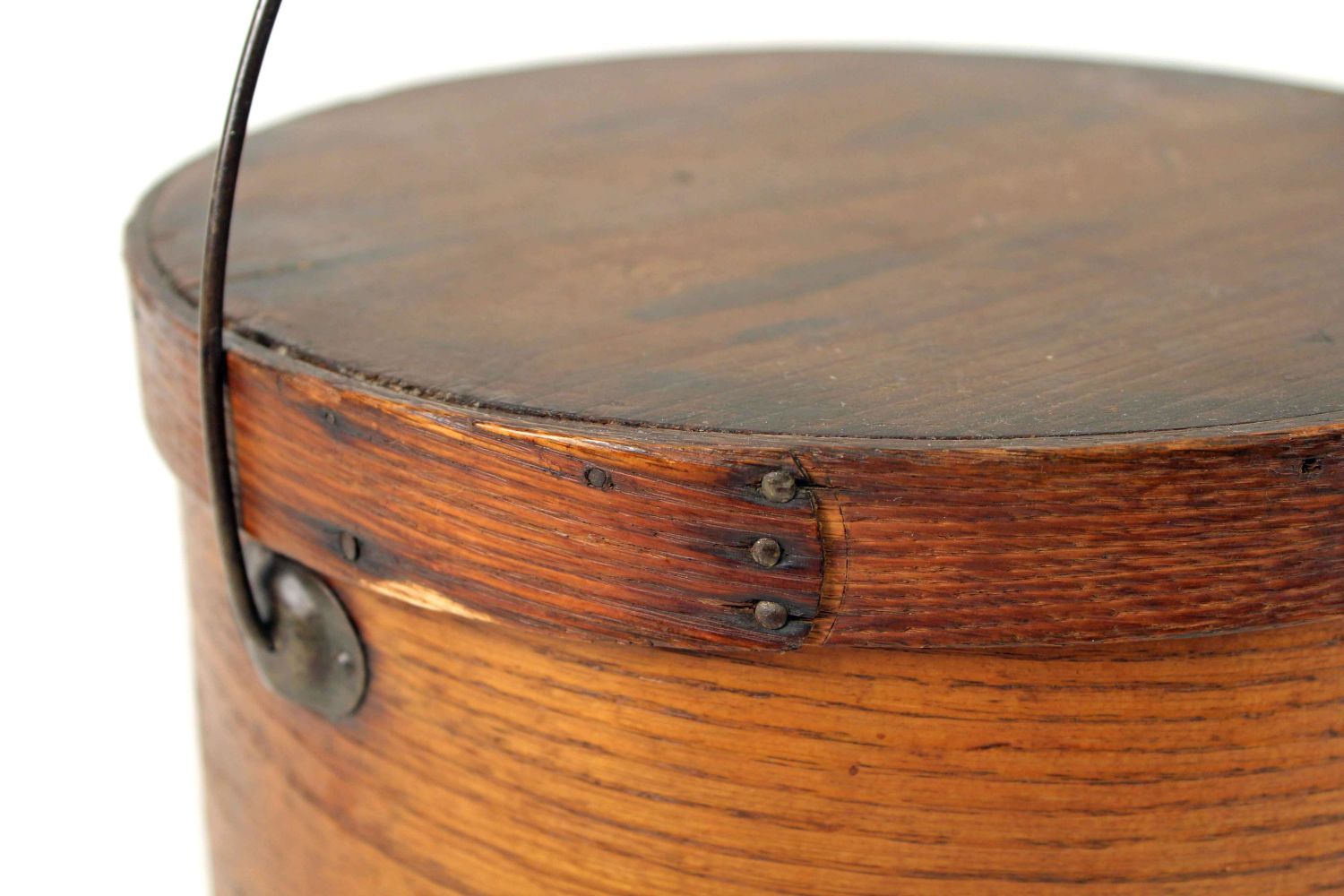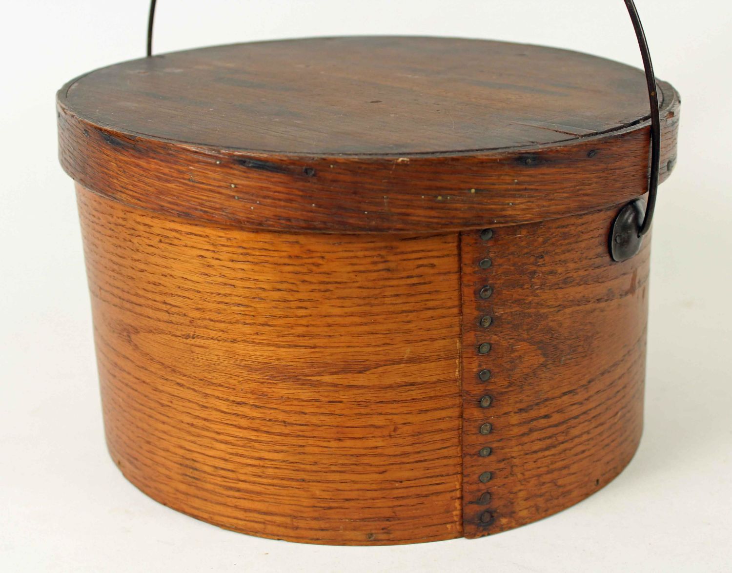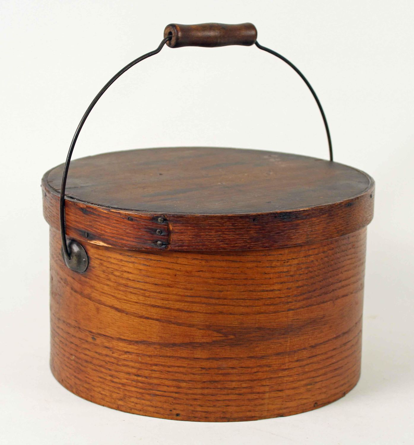 Antique Round Bale Handle Pantry Box. This box is made of bent oak or ash with a banded pine lid. Measures 7" high x 11 1/2" dia. Condition- Box is in very good condition for its age. Does have some minor wear and stains. See photos.