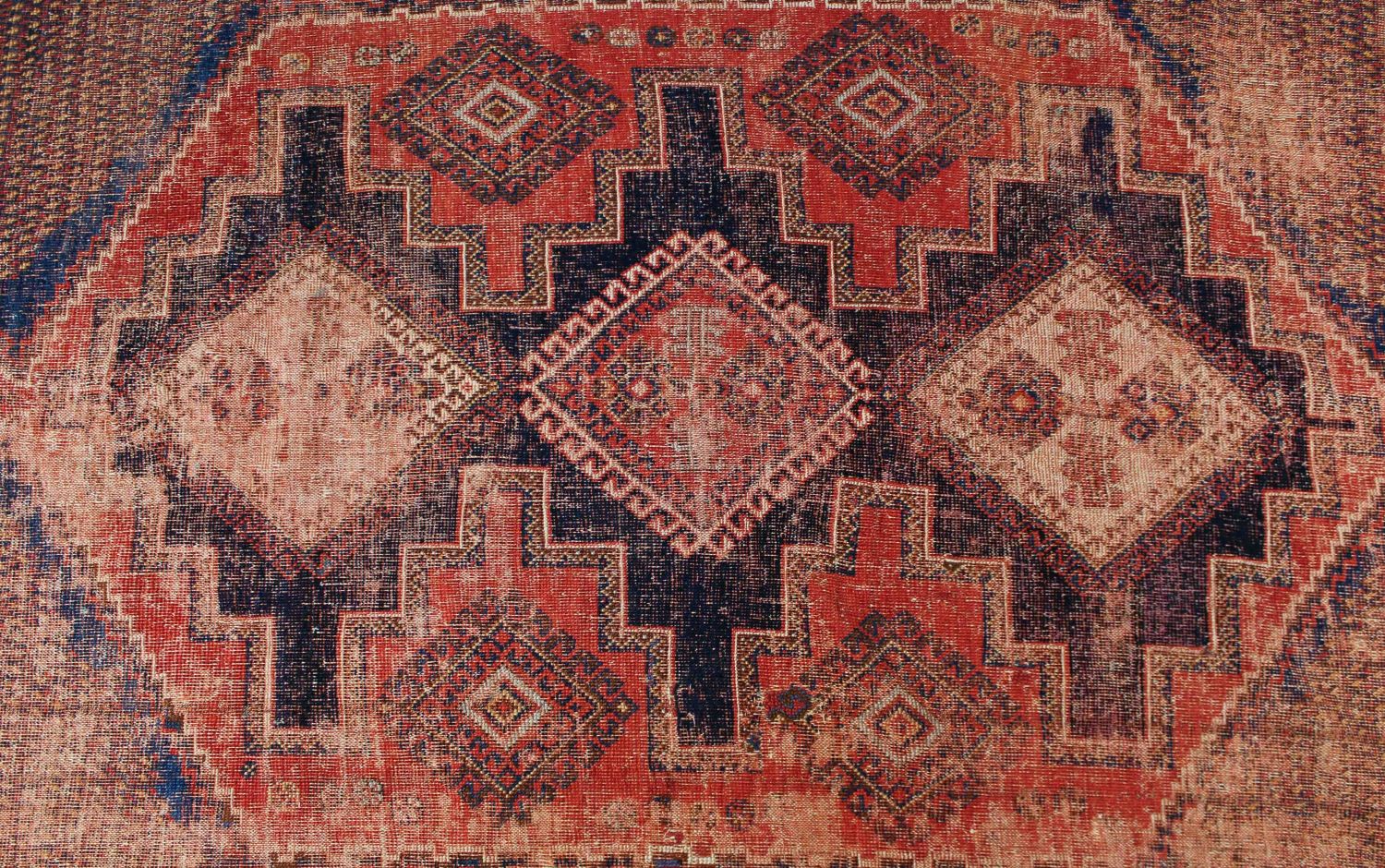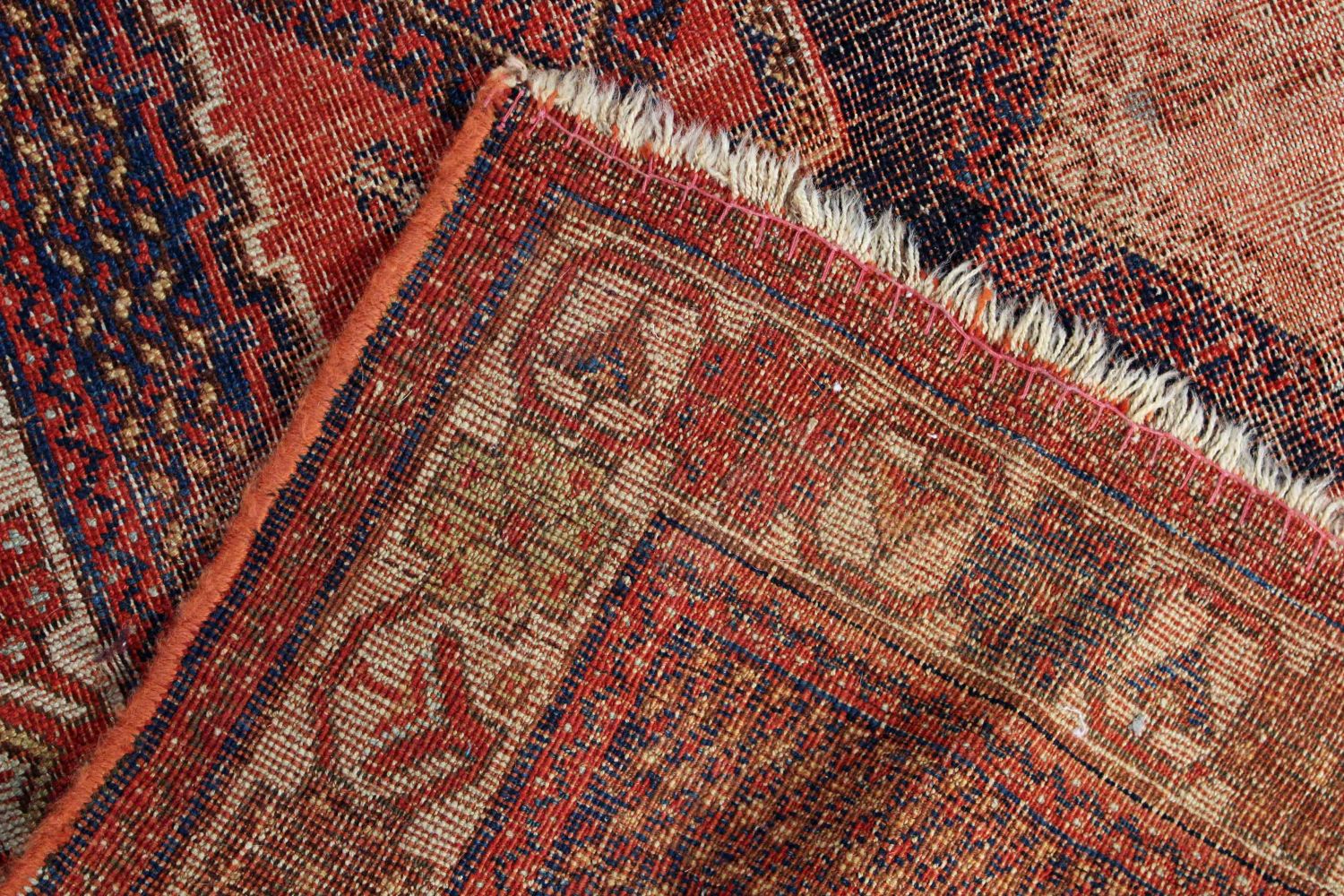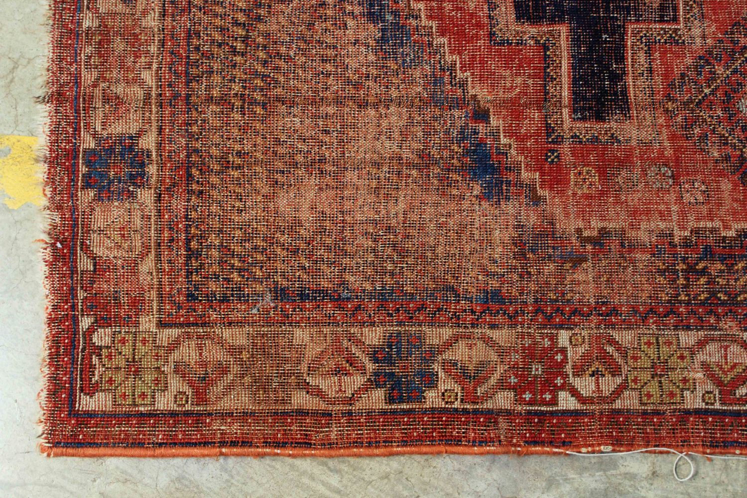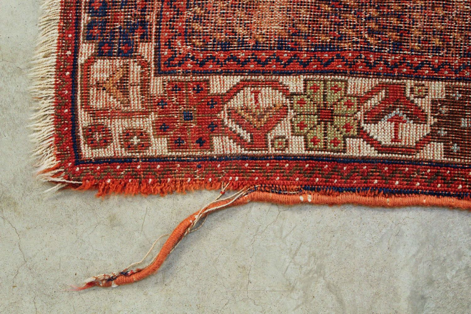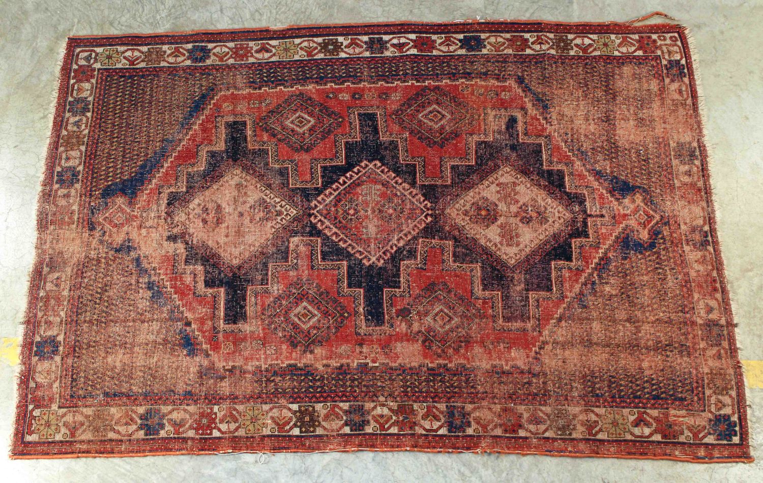 Handmade Persian Wool Rug. The rug has three large center medallions and is heavily decorated with motifs. Measures 4′ 3" x 6′ 3". Condition- Rug has considerable wear, binding on edge has loss and is loose in one corner (approx. 12"), and has been worn to threads in two spots (approx. 3"). See photos.