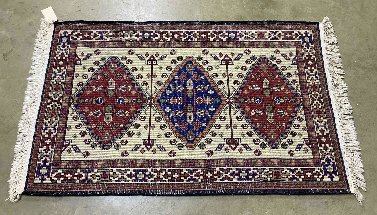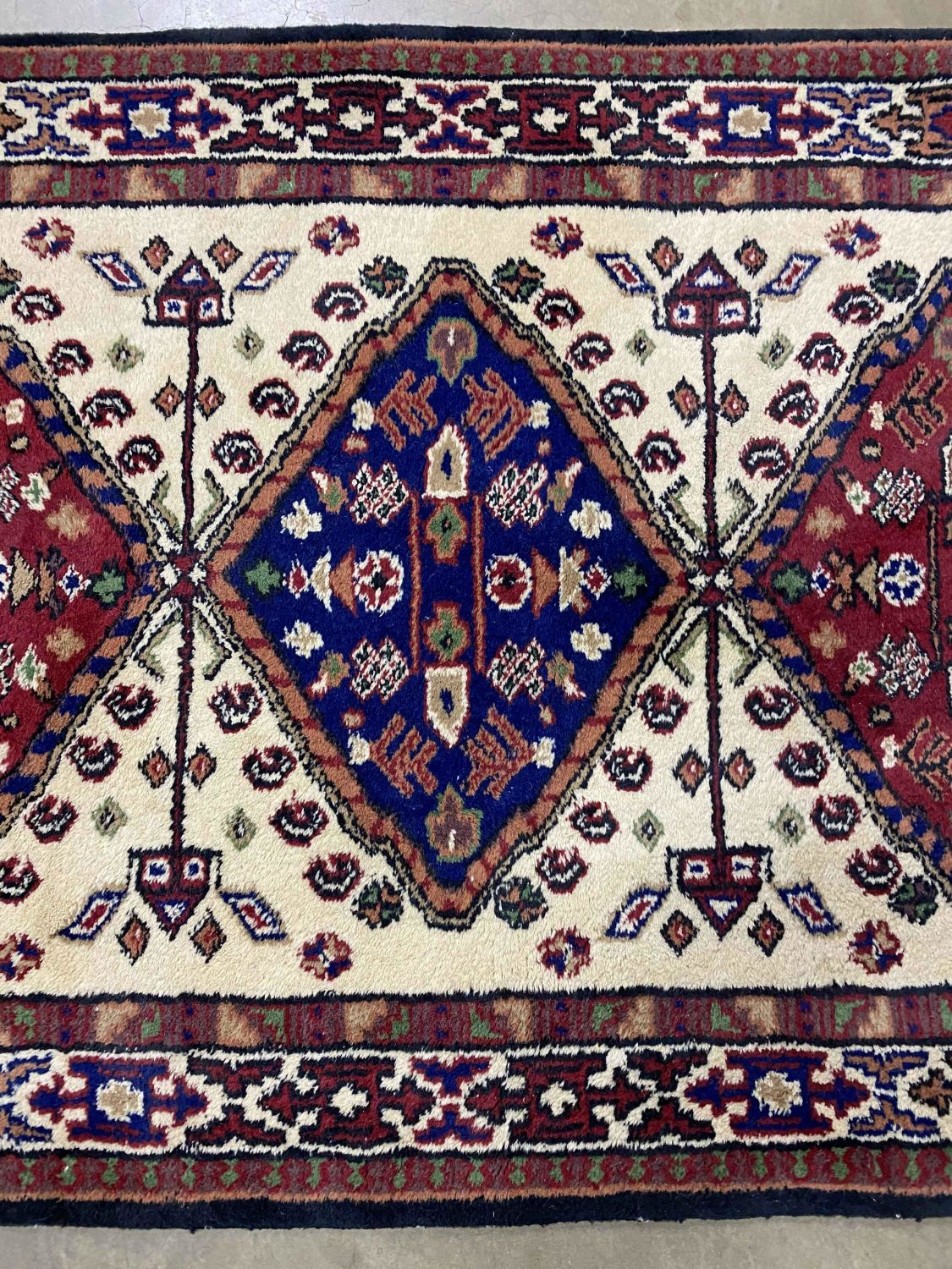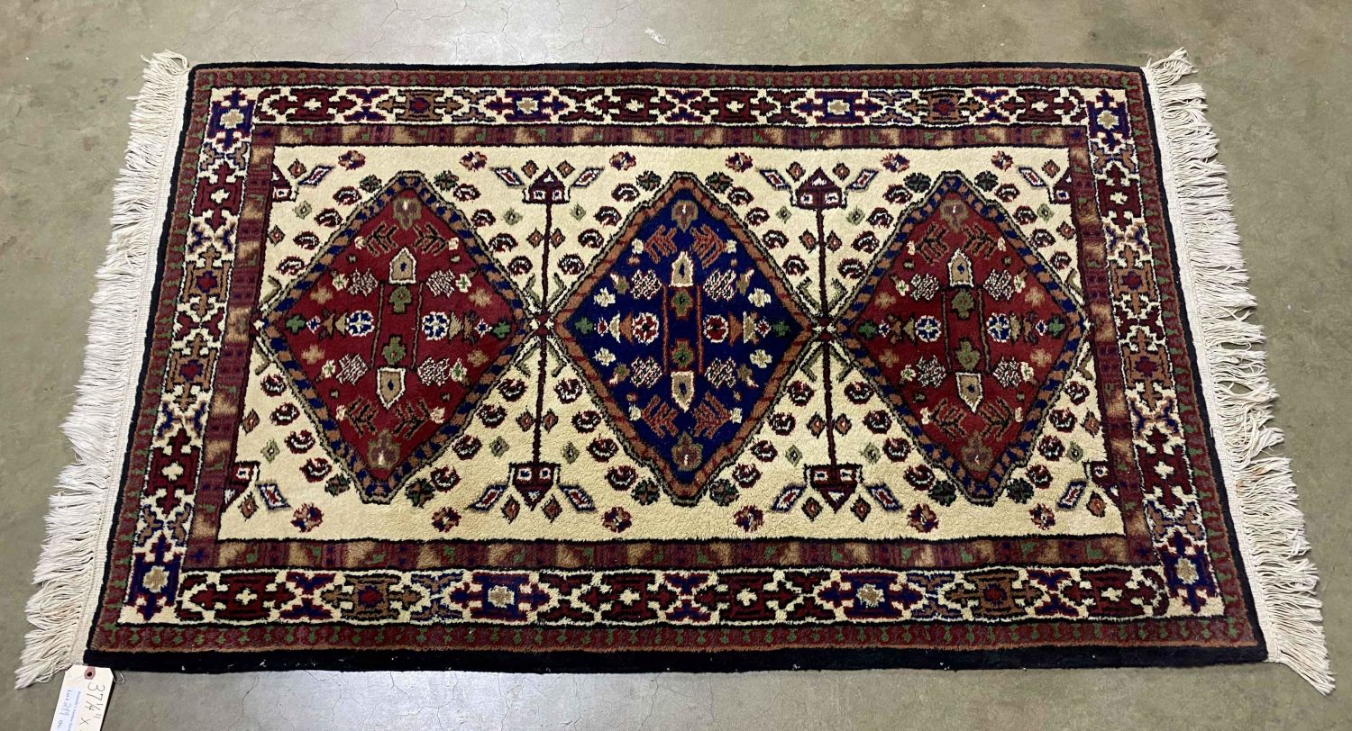 Persian Style Wool Rug. Rug has three large center medallions. Measures 3′ 1" x 4′ 11". Condition- Rug is in good condition. Needs some light cleaning. See photos.