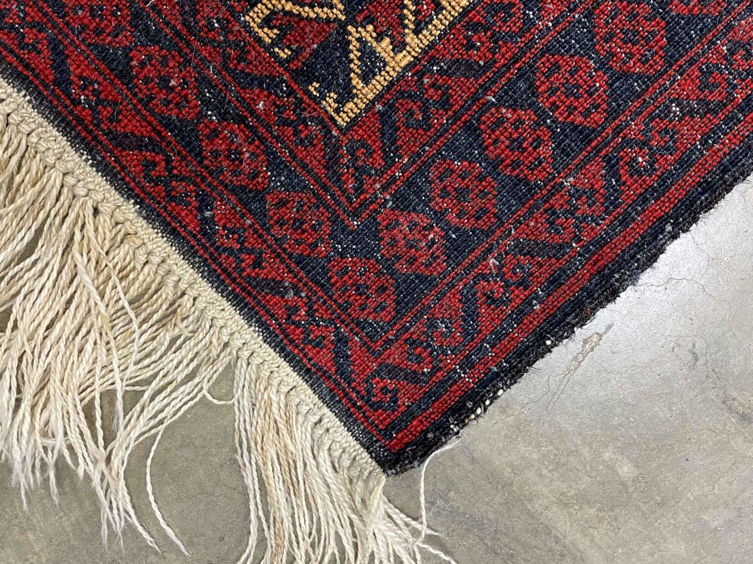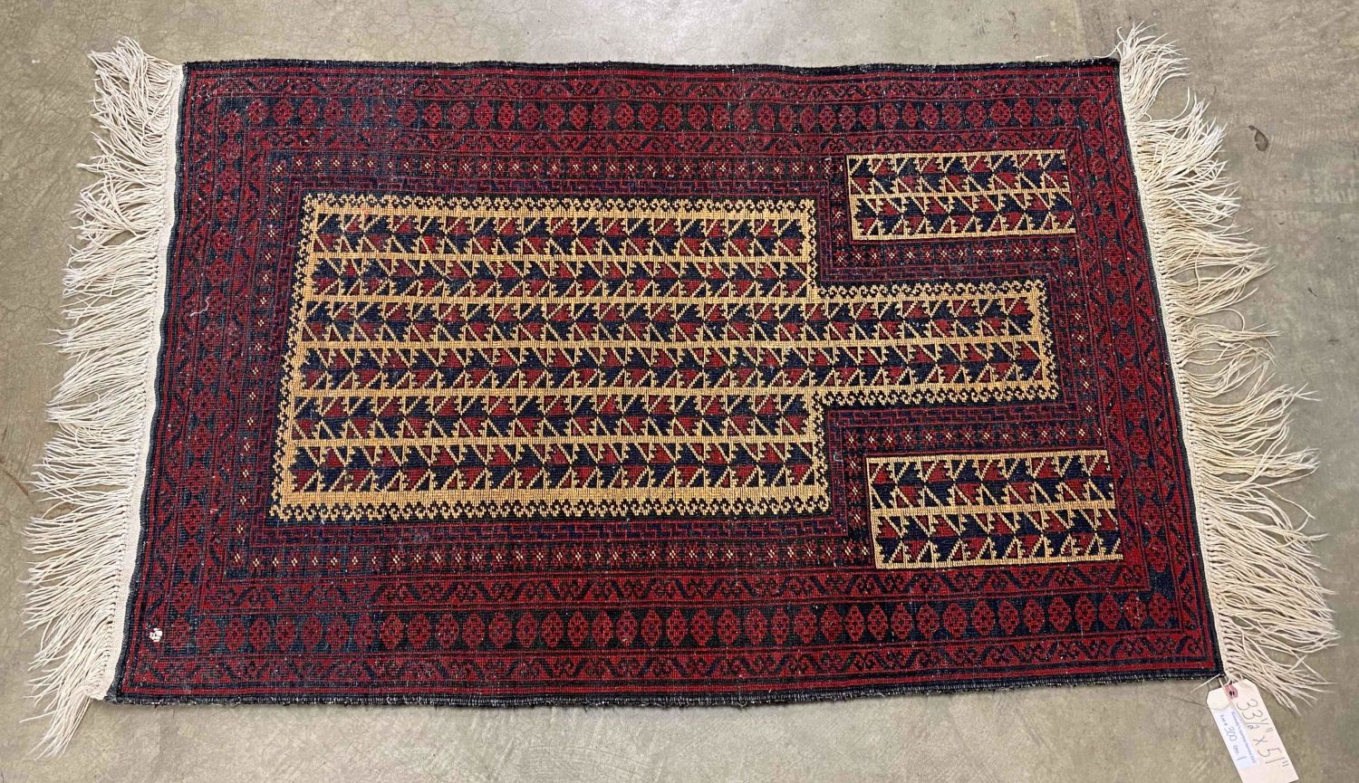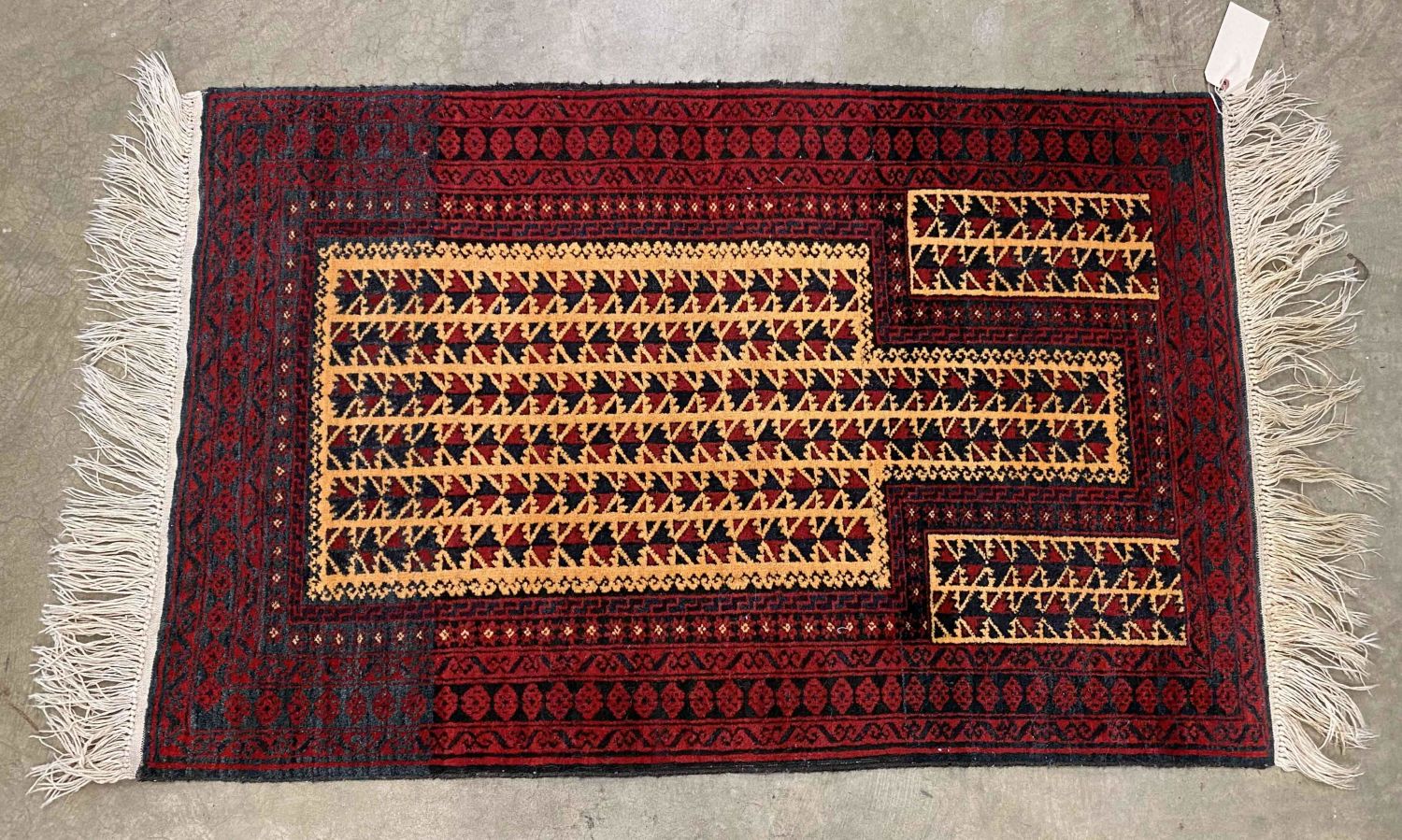 Handmade Persian Style Wool Prayer Rug. Black, red, and cream rug. Measures 2′ 9" x 4′ 3". Condition- Prayer rug is in good condition. See photos.
