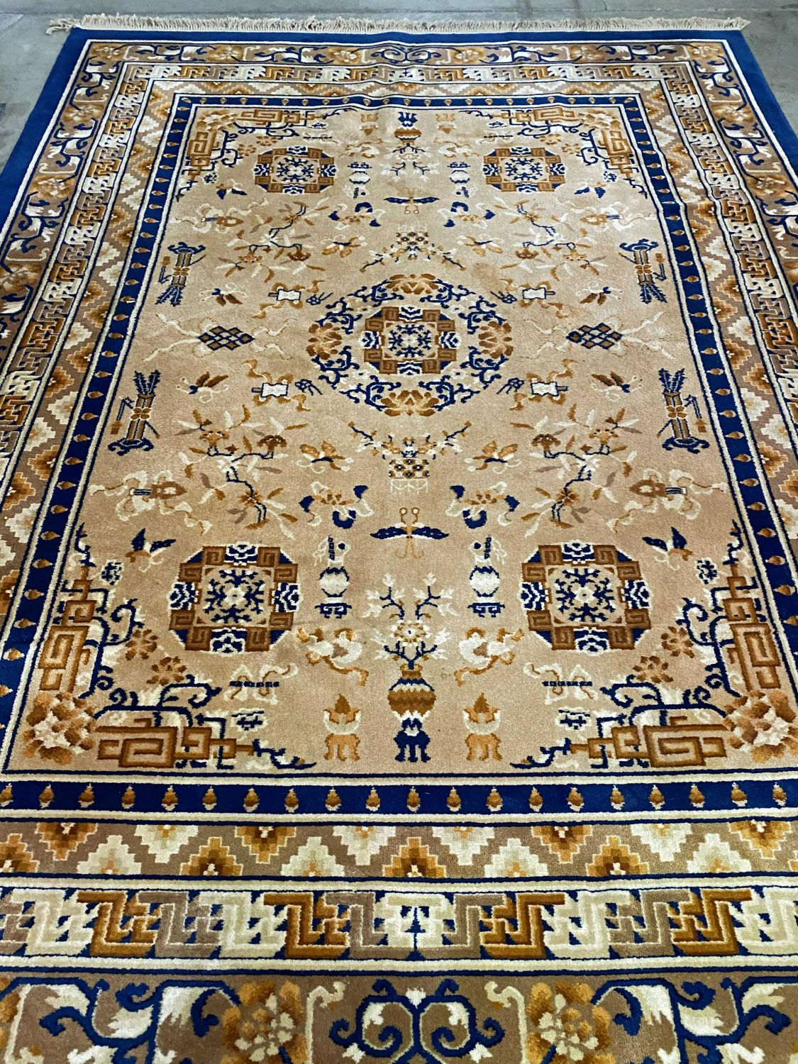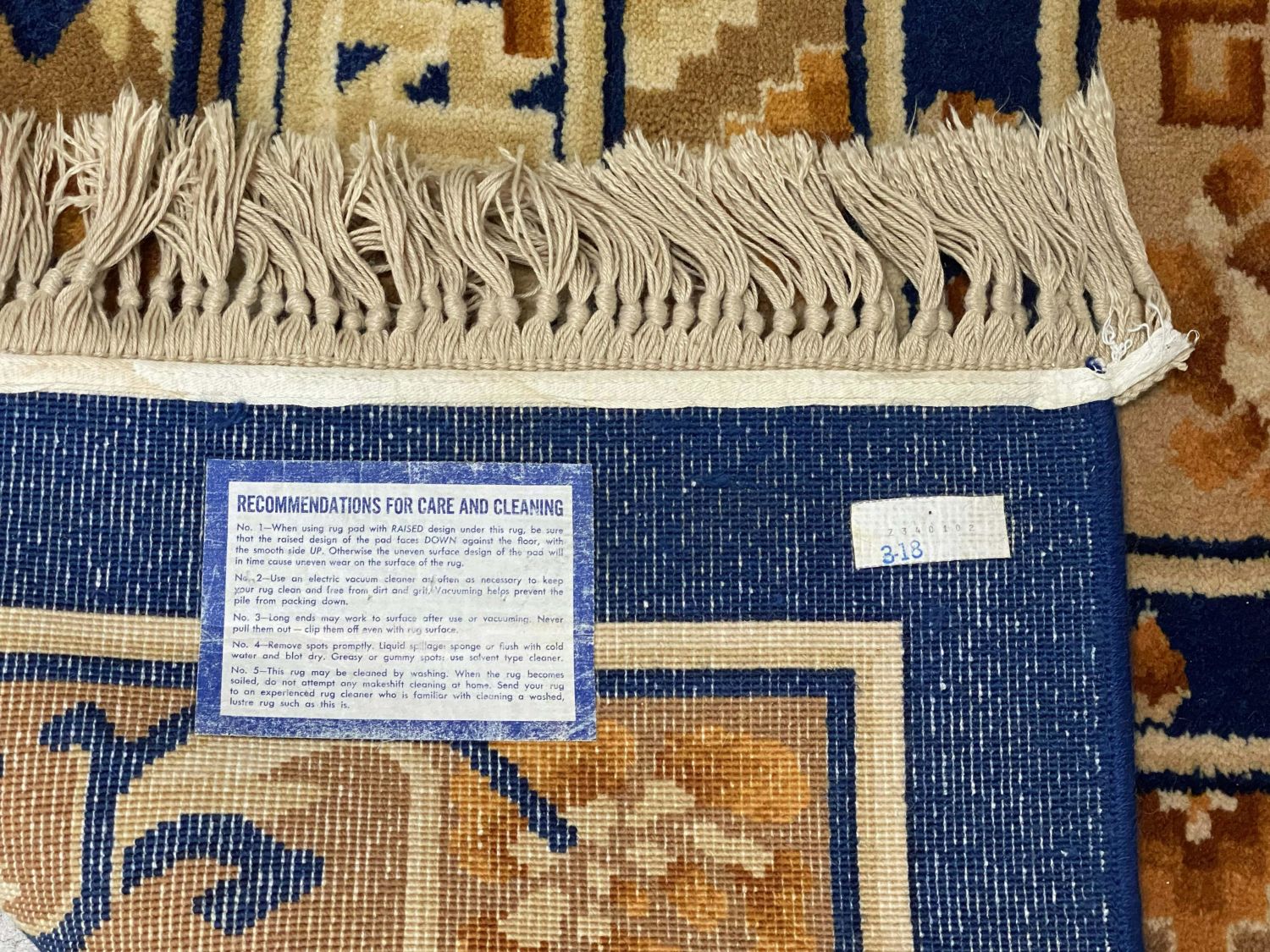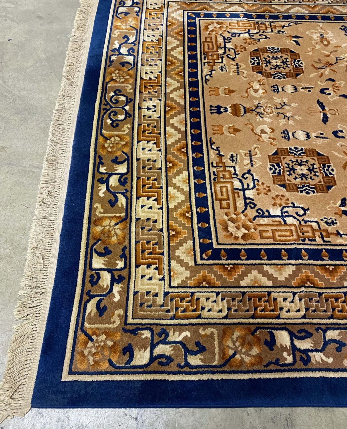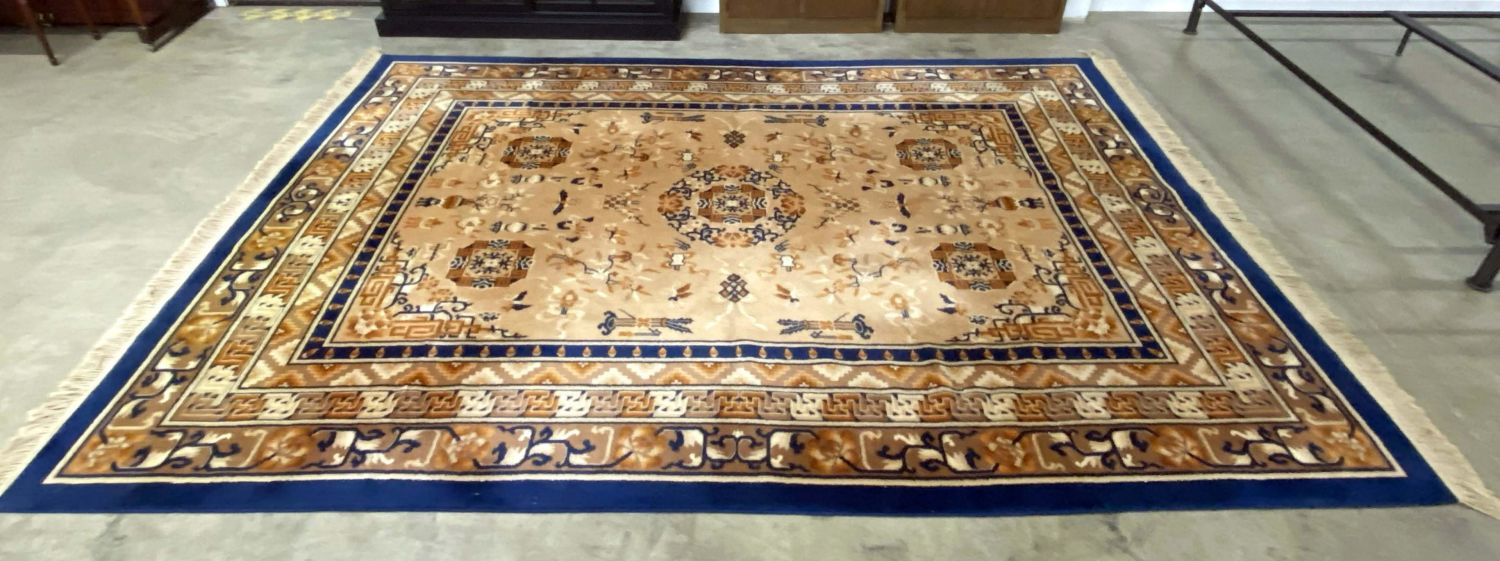 Factory Made Persian Style Rug. Rug is royal blue, tan, cream, and gold colored. Measures 8′ 8" x 12′. Condition- Rug is in very good condition with one small tear on a corner fringe. See photos.