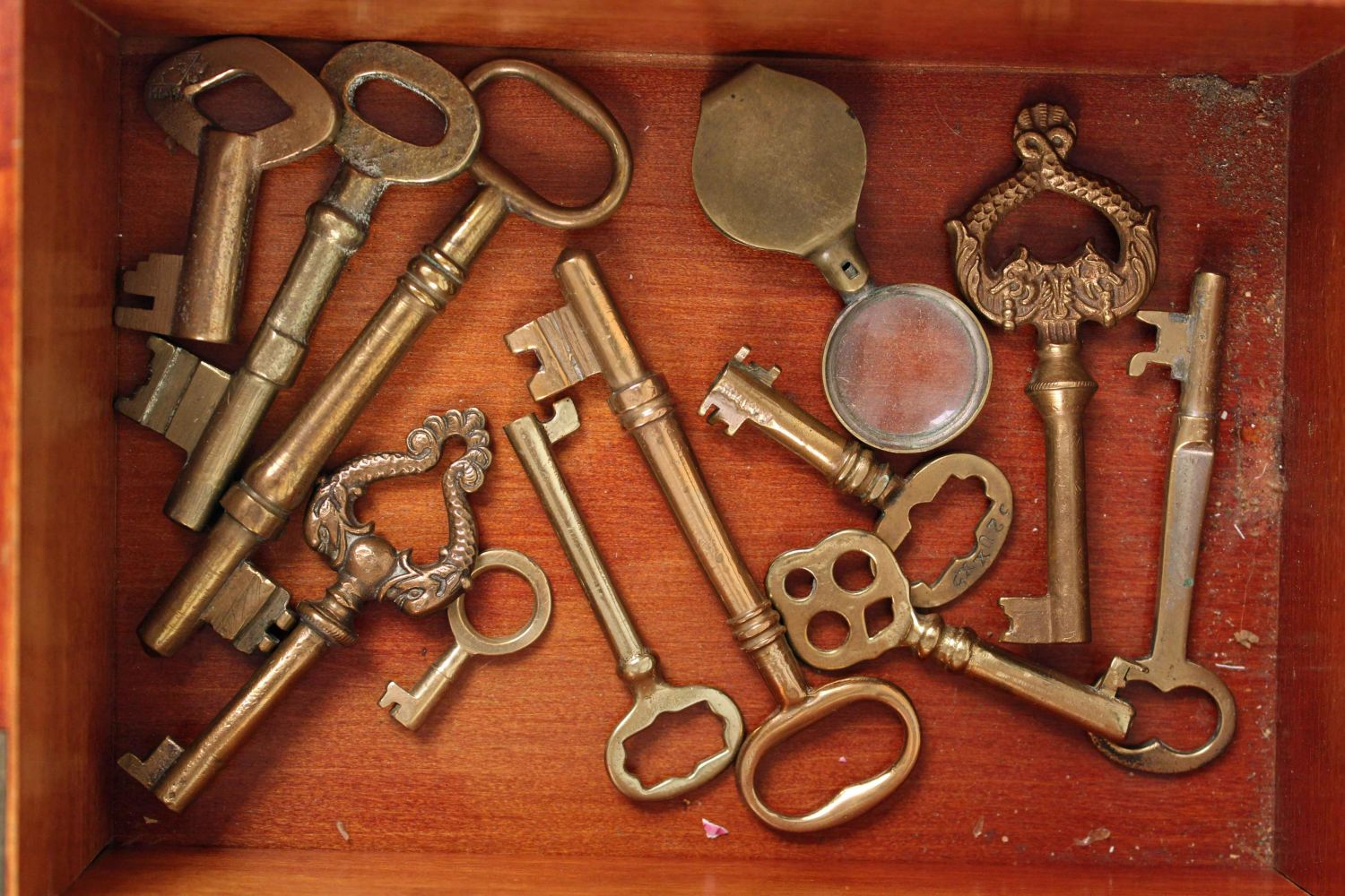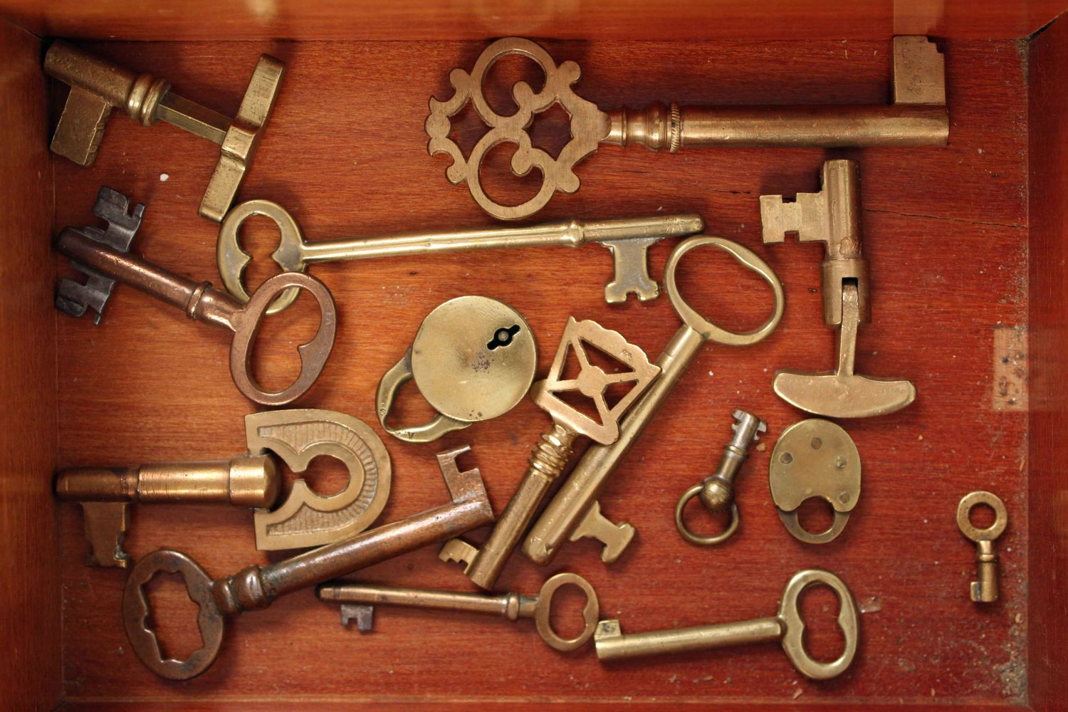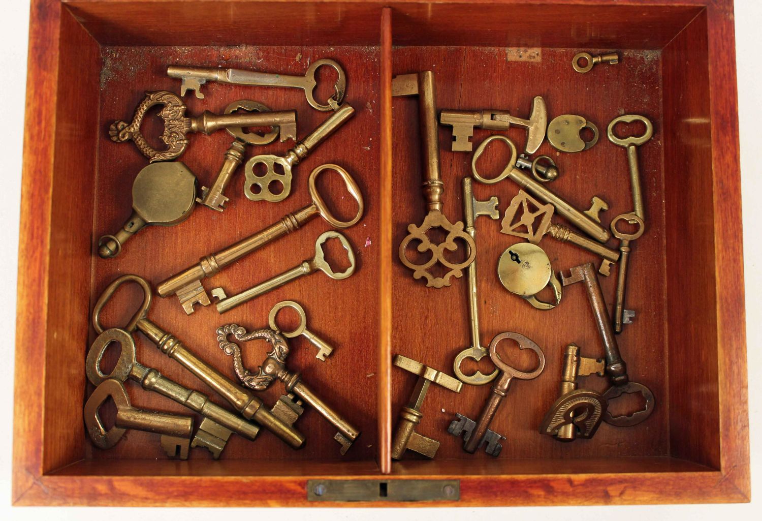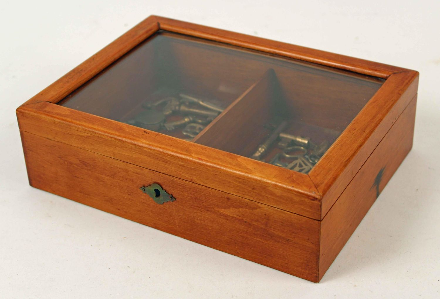 Wooden Display Box with Antique Brass Keys. Box measures 3" high x 7 1/4" x 9 3/4". Condition- The box is in good condition. See photos.