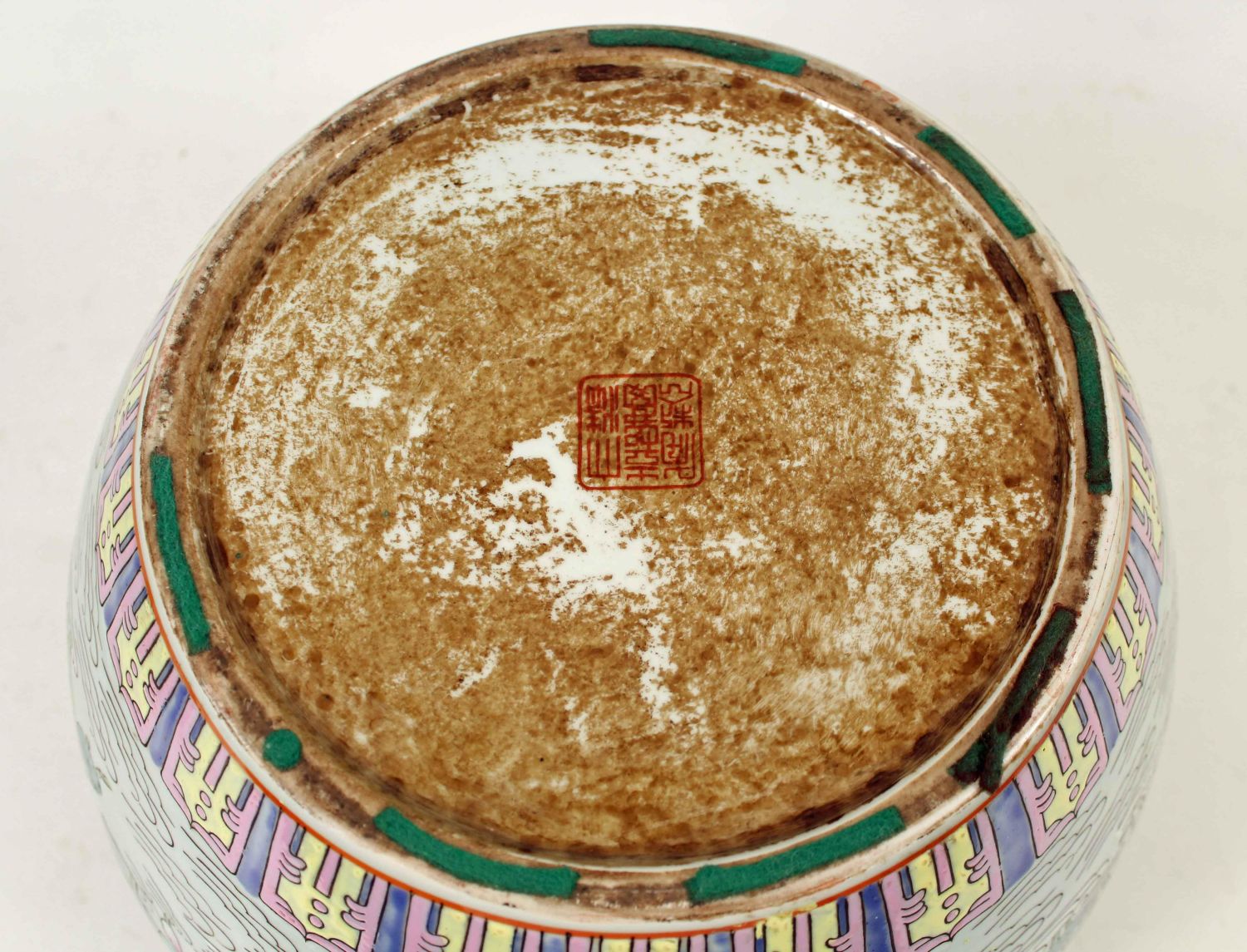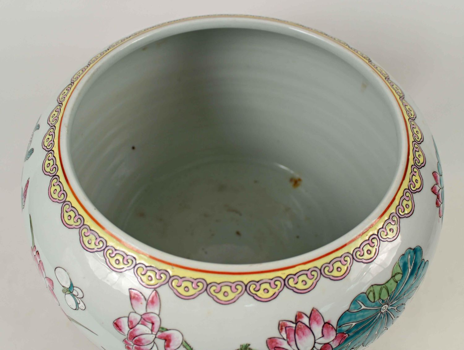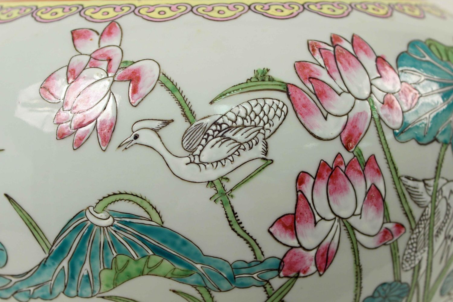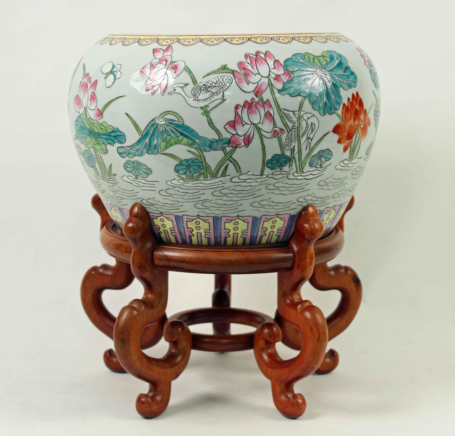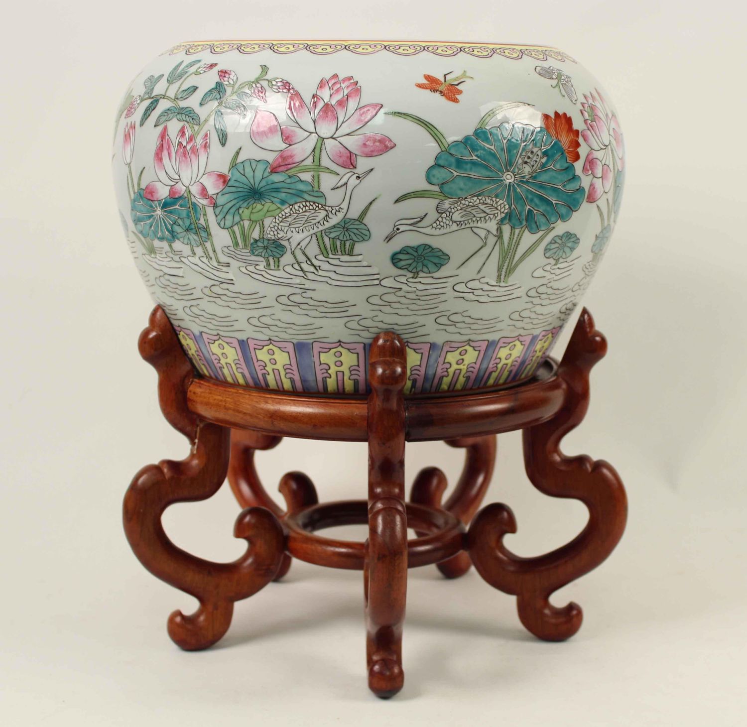Chinese Porcelain Famille Rose Fishbowl On Mahogany Fish Stand. Bowl is signed on bottom. Age unknown. Total height on base is 15 1/2" high. Bowl measures 8 1/2" high x 12 1/2" dia. Condition- Stand has old glue repair. Fishbowl is in good condition. See photos.