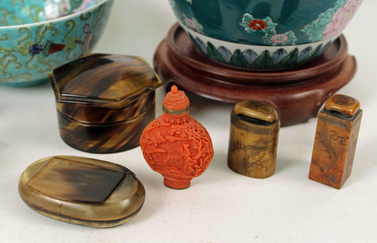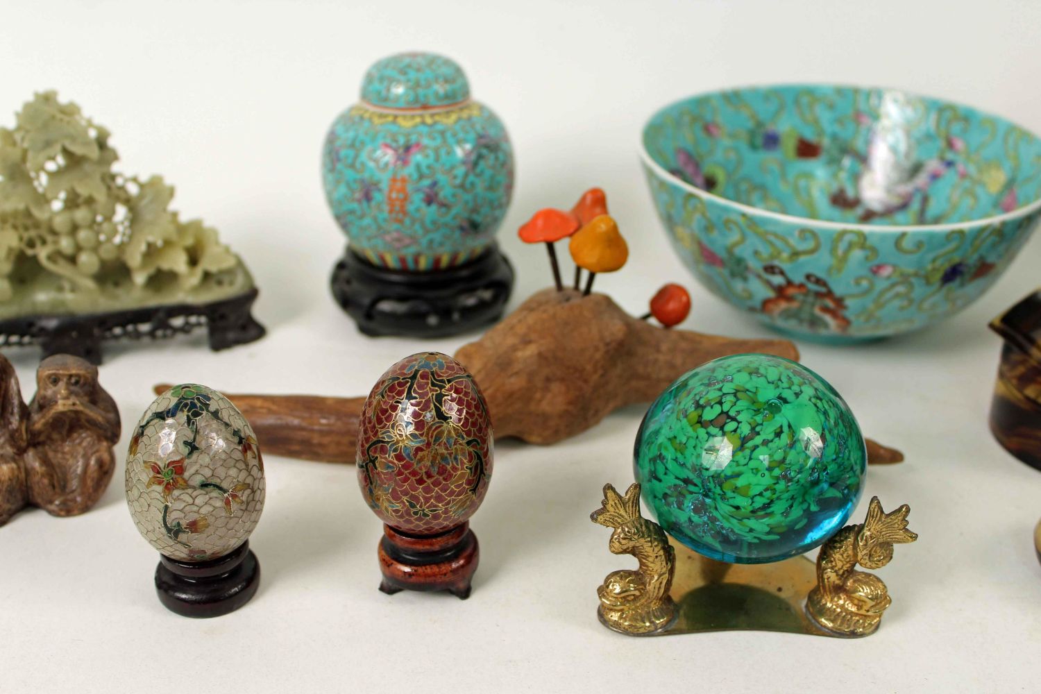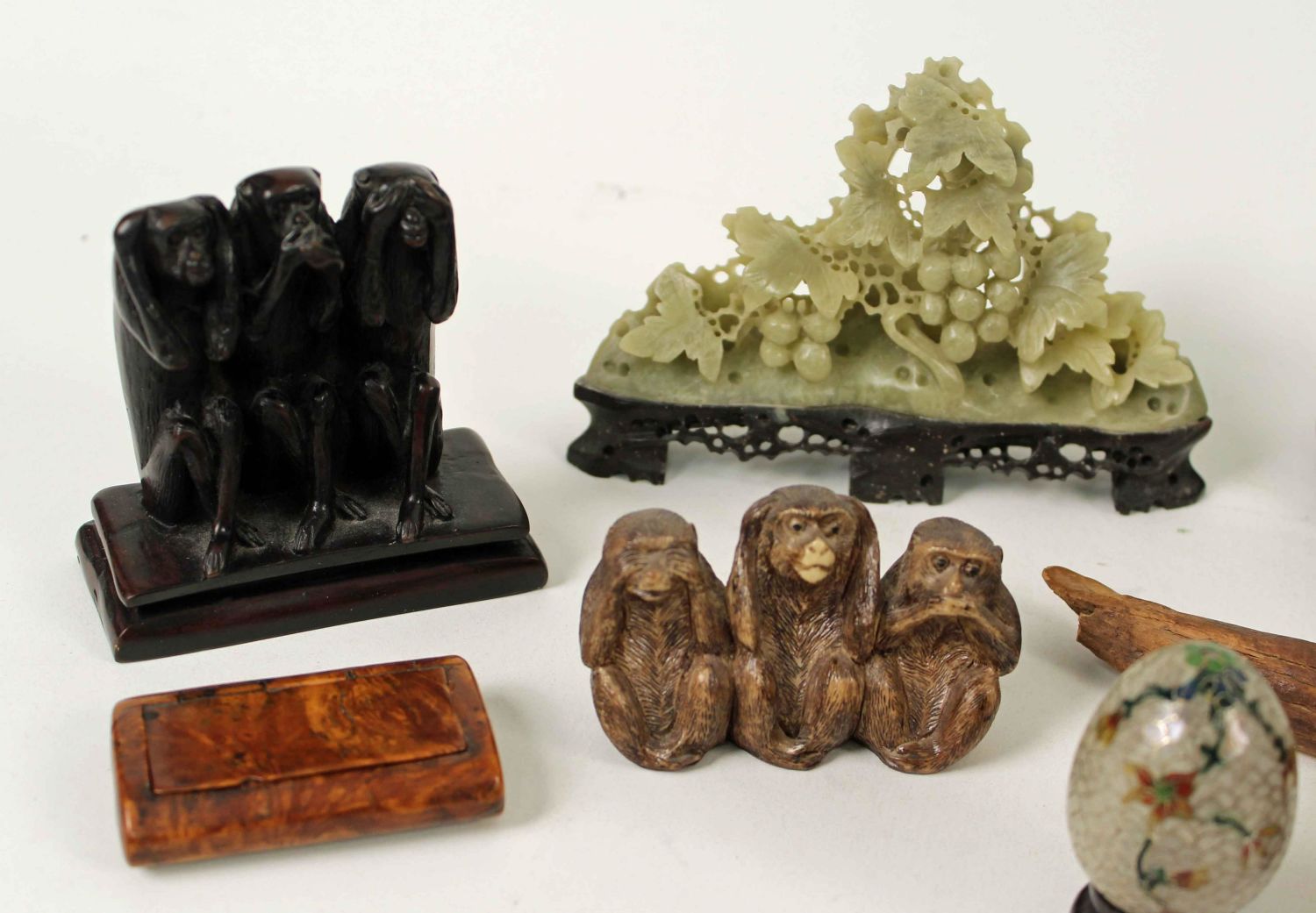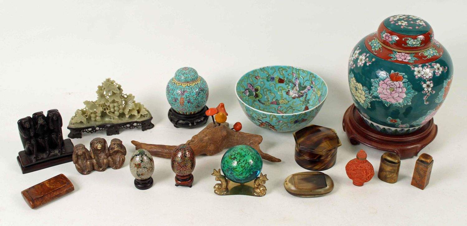 Group of Chines Items, Porcelain, Soap Stone, Etc. Covered urn. Measures 7" high. Carved monkeys. Paper weights. See photos. Condition- Items are in overall good condition.