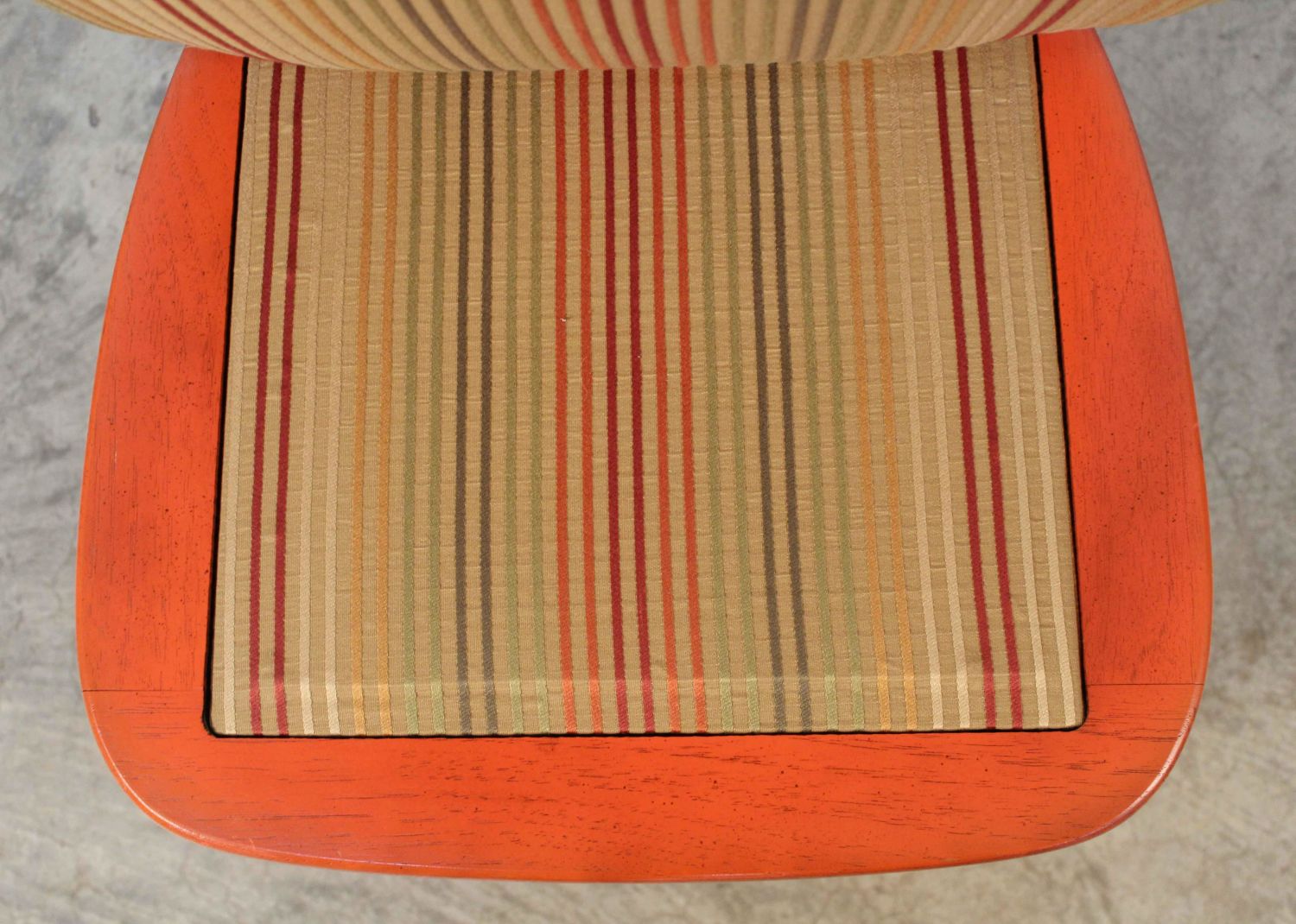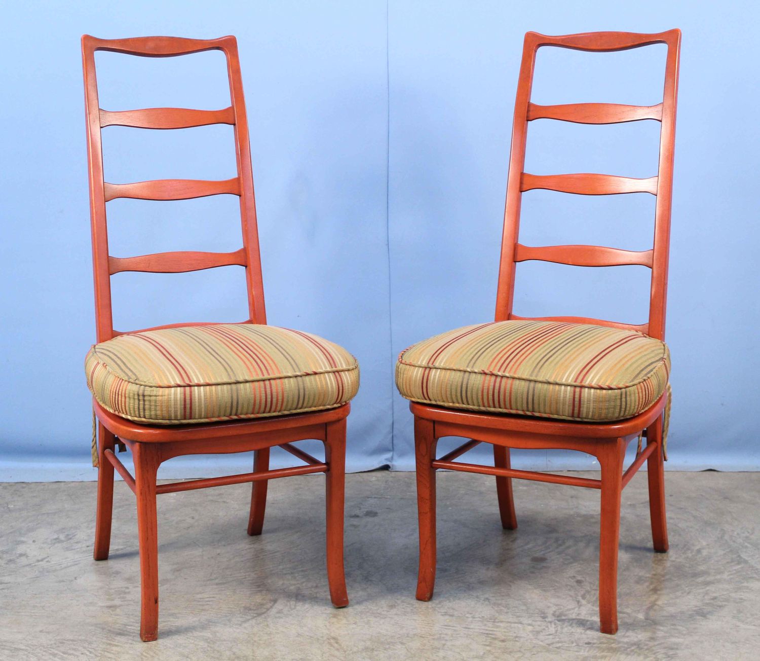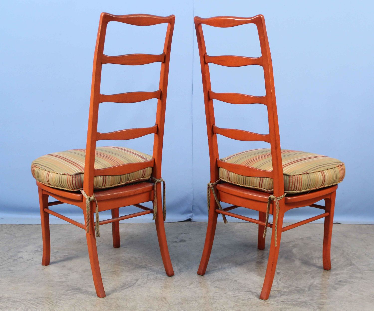 Pair of Burnt Orange Mid Century Ladder Back Chairs. Measures 42 3/4" high x 18" wide. Condition- Chairs are in good condition. See photos.
