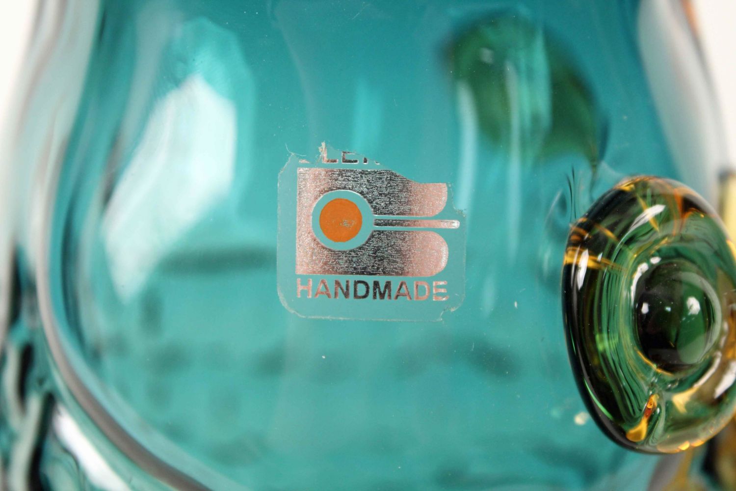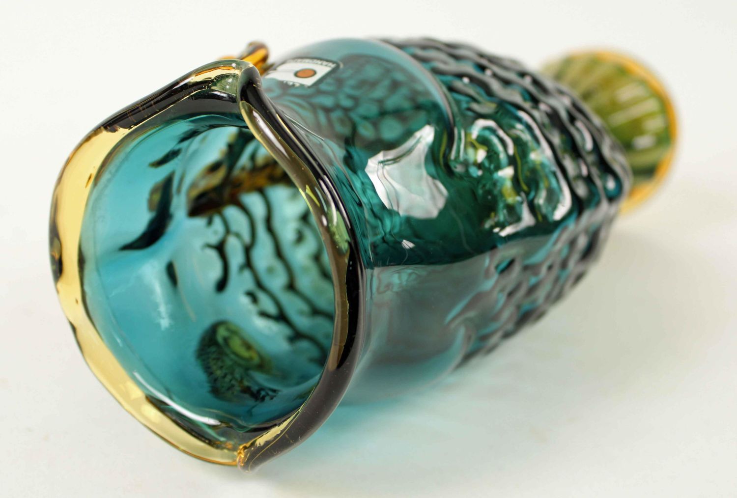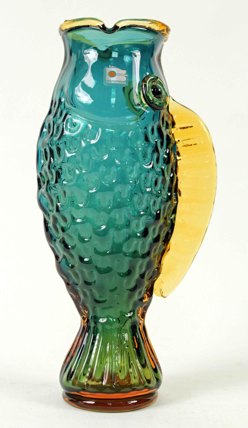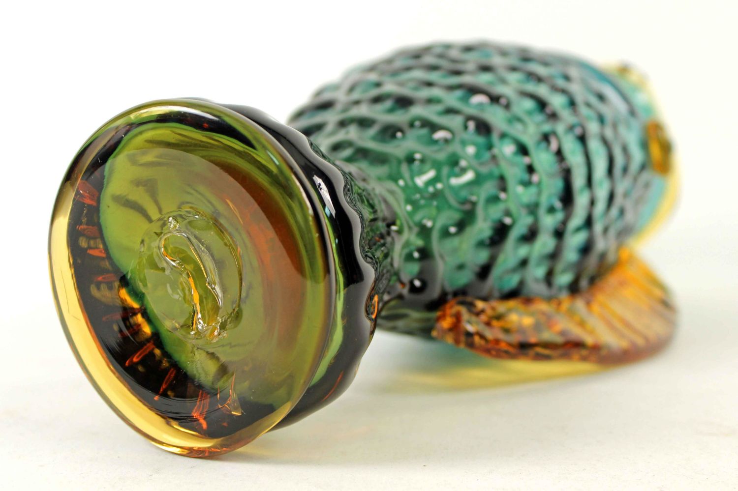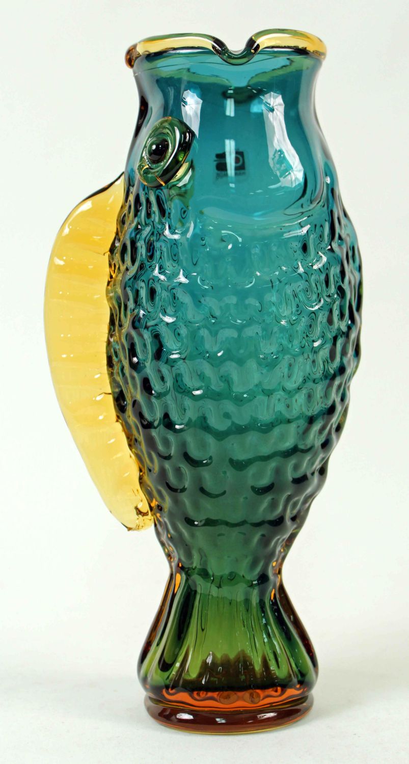 Blenko Glass #9425 Teal and Amber Handmade Fish Vase by Hank Adams (1999-2000). Measures 12" high. Has a partial label. Condition- Vase is in overall good condition. See photos.