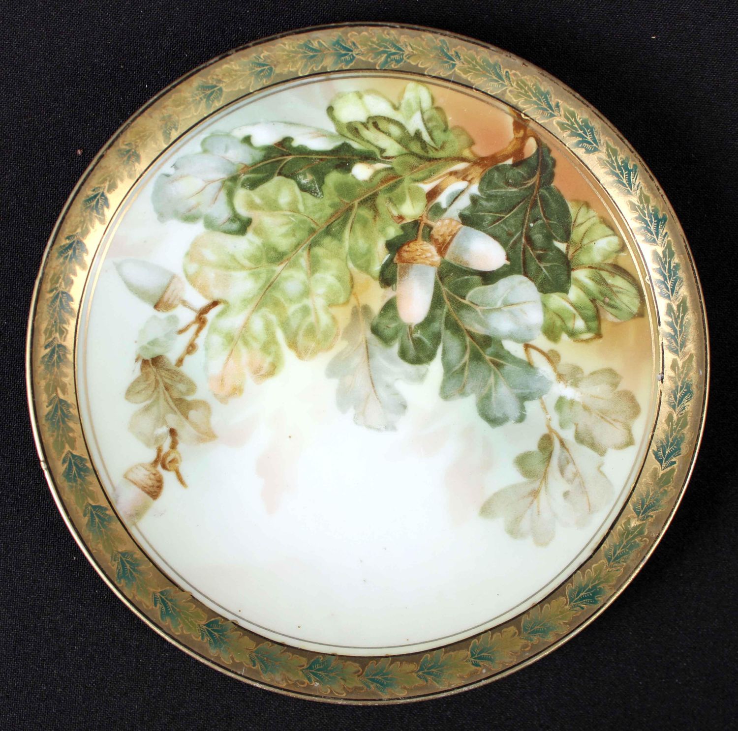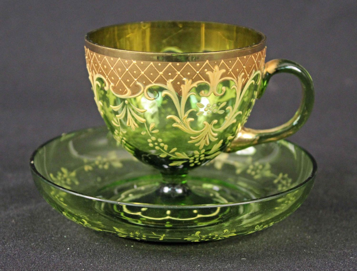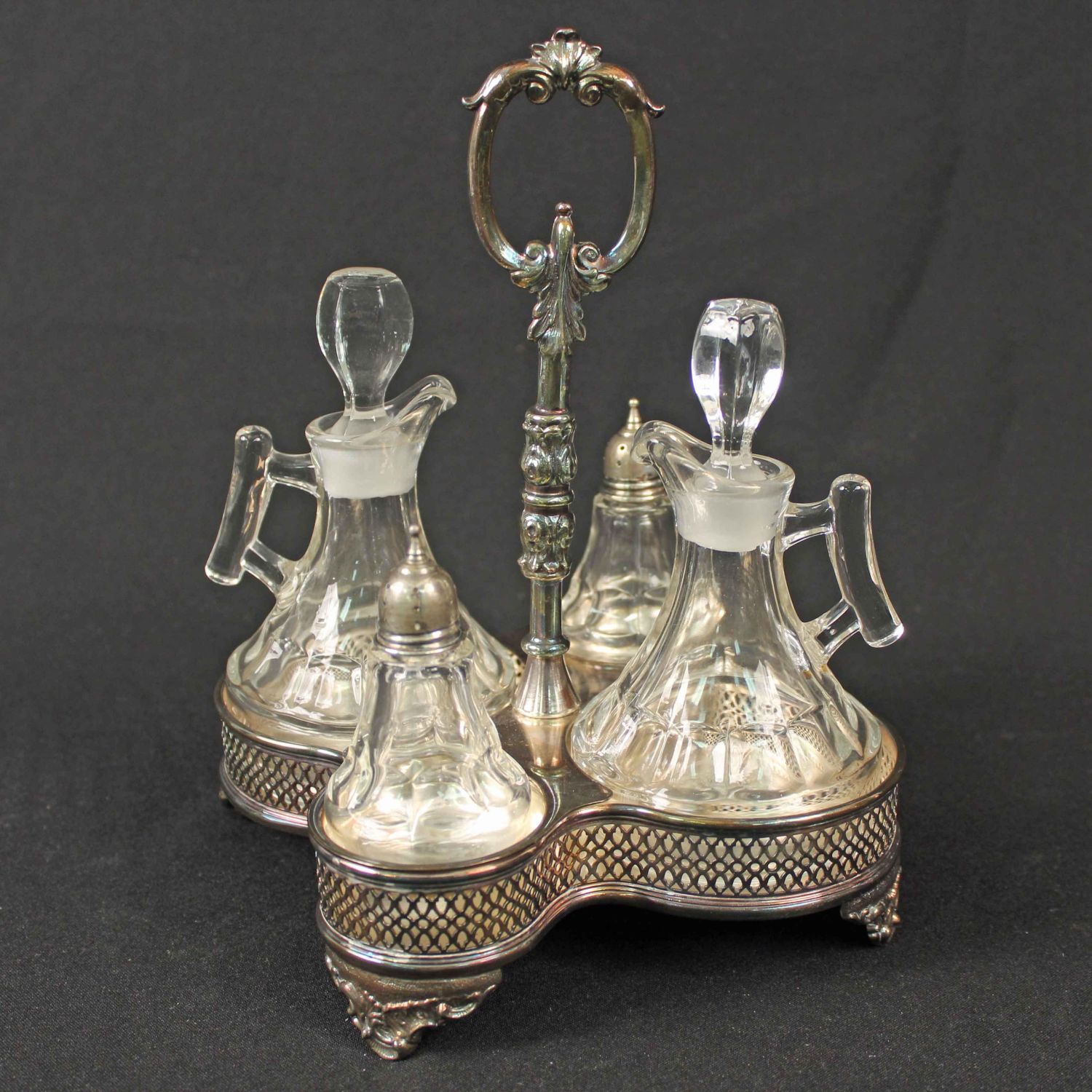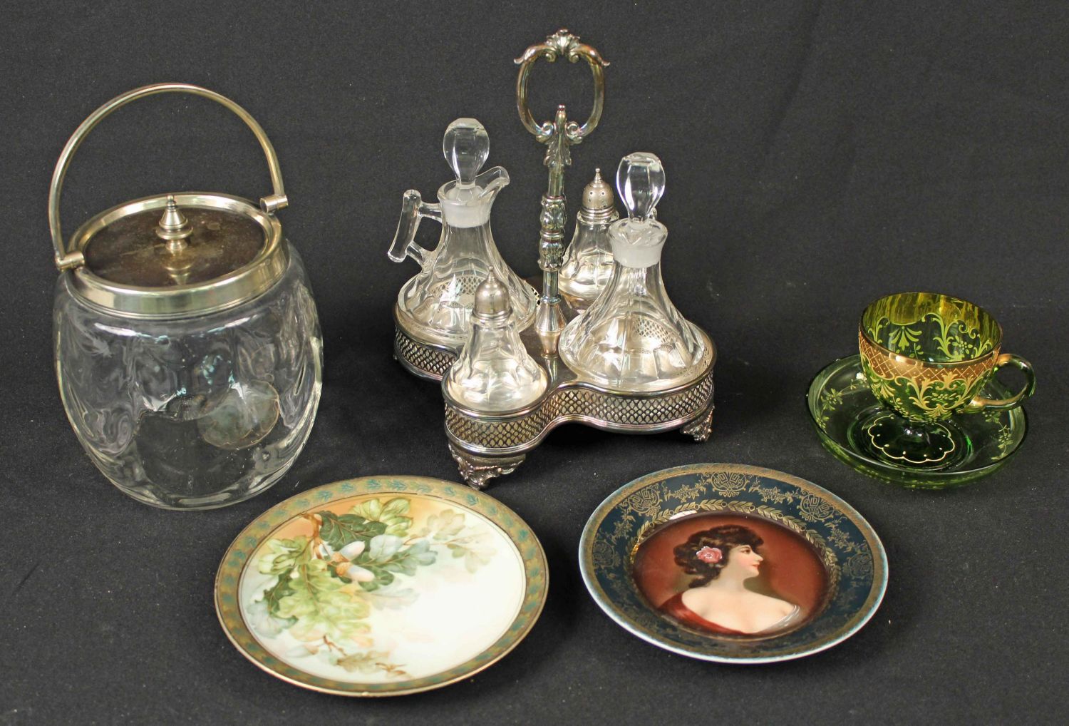 Group of Porcelain & Glass Items. (1) Silver plate cruet stand with cruets and salt and pepper. The cruets measure 6" high. Shakers measure 3 1/4" high and have sterling caps. Stand measures 9 1/2" high x 7 1/2" dia. (1) Mosier style handpainted green glass cup and saucer. Saucer measures 4 3/4" dia. Cup measures 3" high x 3" dia. (1) English silver plate biscuit barrel. Measures (with the handle up) 9" high x 5 3/4" dia. (1) Bavarian portrait saucer. Measures 6" dia. (1) R.S. Germany saucer. Measures 6 3/8" dia. Condition- Overall good condition. No chips, cracks, or damage.