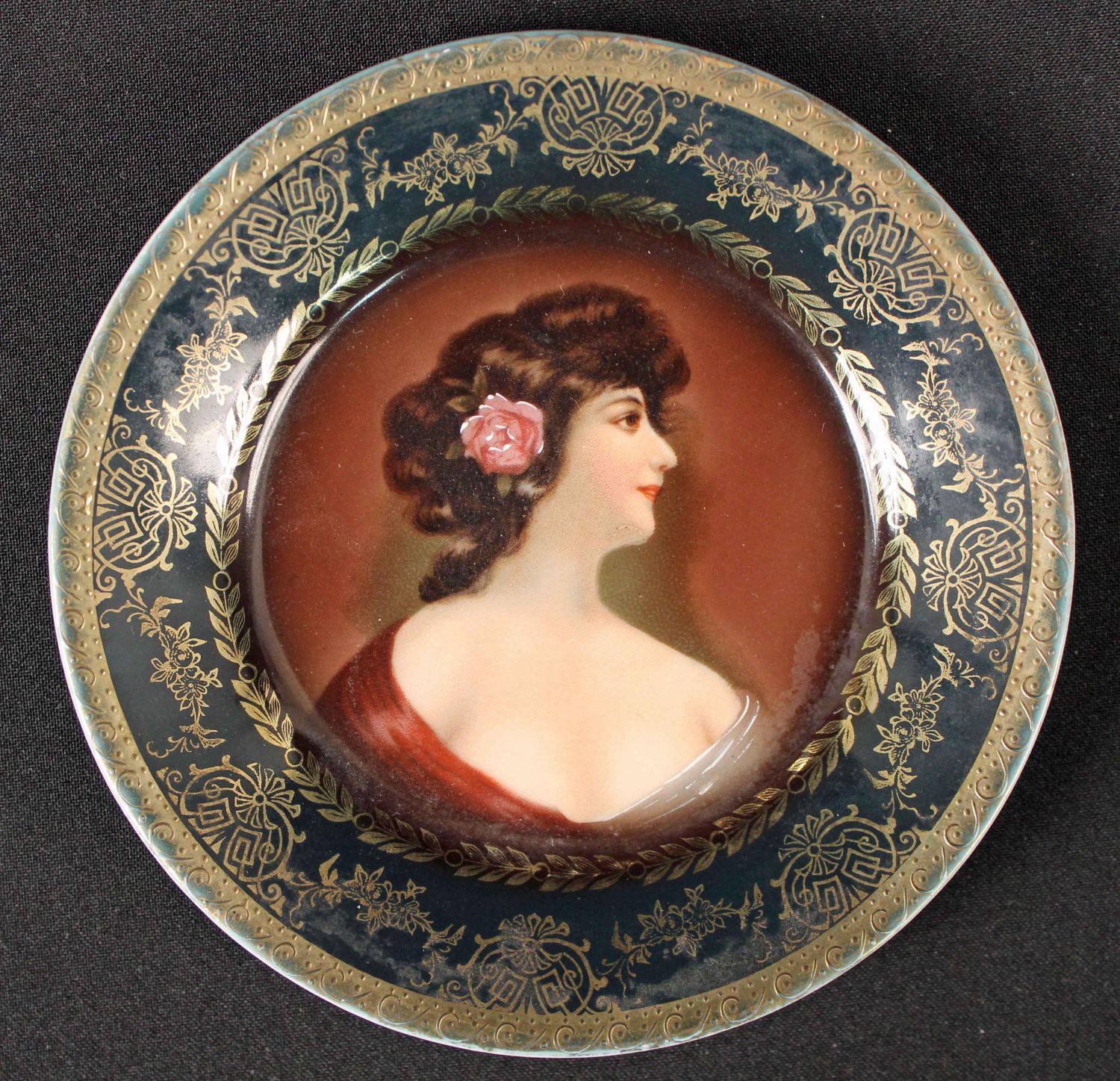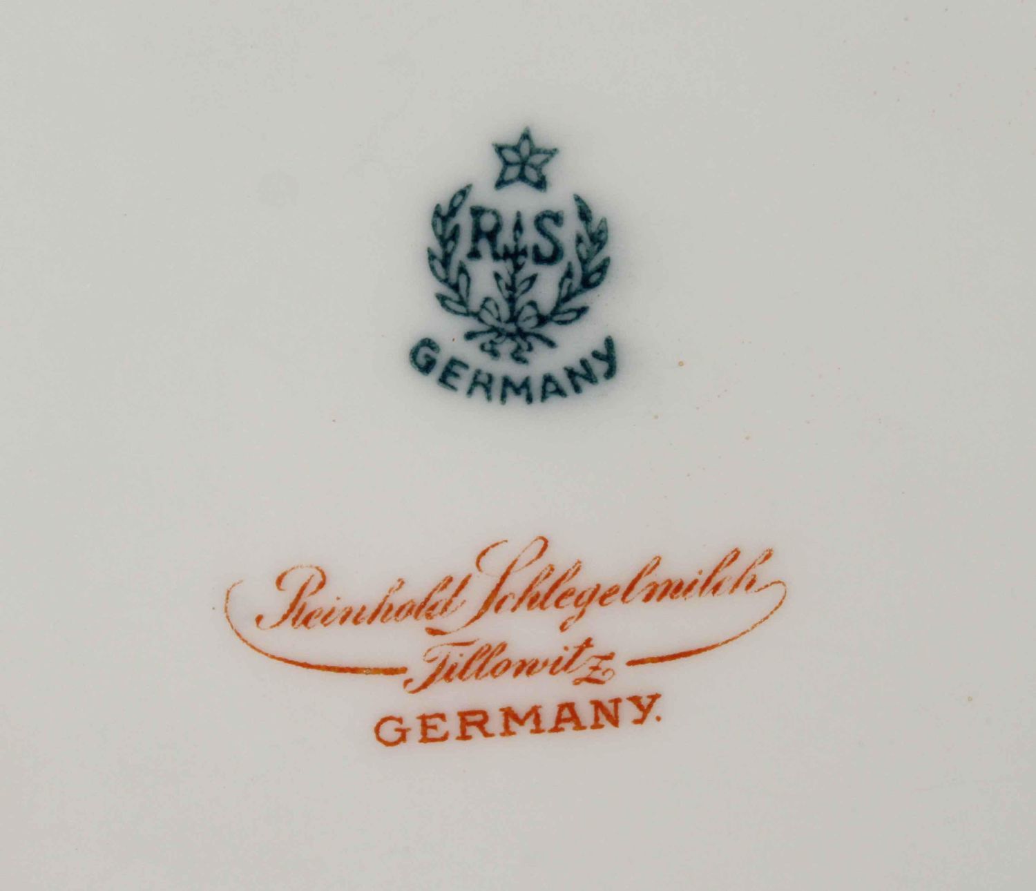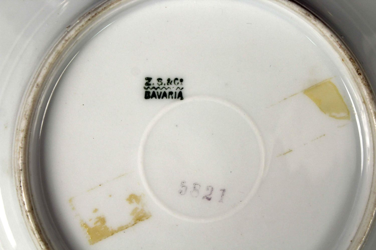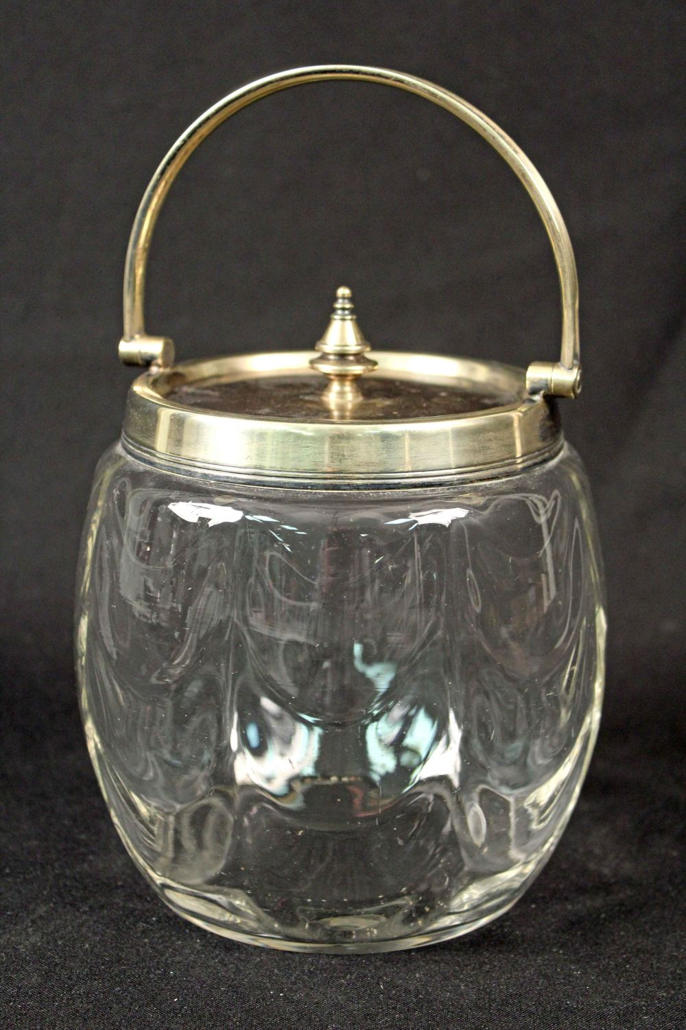 Group of Porcelain & Glass Items. (1) Silver plate cruet stand with cruets and salt and pepper. The cruets measure 6" high. Shakers measure 3 1/4" high and have sterling caps. Stand measures 9 1/2" high x 7 1/2" dia. (1) Mosier style handpainted green glass cup and saucer. Saucer measures 4 3/4" dia. Cup measures 3" high x 3" dia. (1) English silver plate biscuit barrel. Measures (with the handle up) 9" high x 5 3/4" dia. (1) Bavarian portrait saucer. Measures 6" dia. (1) R.S. Germany saucer. Measures 6 3/8" dia. Condition- Overall good condition. No chips, cracks, or damage.