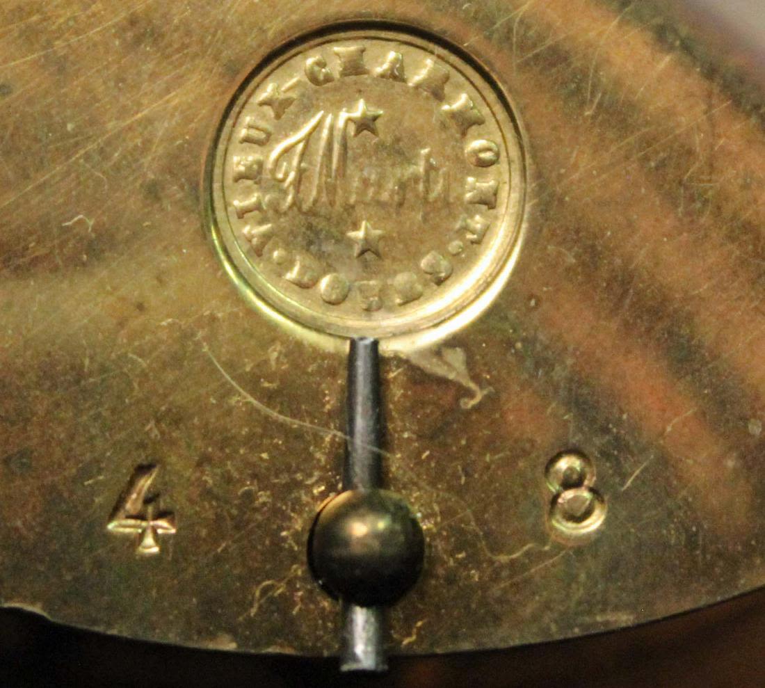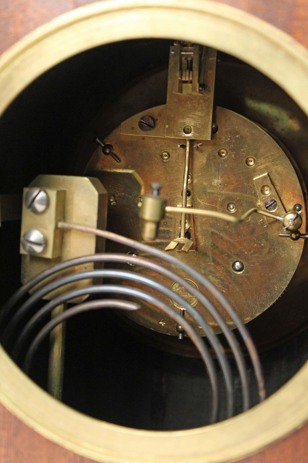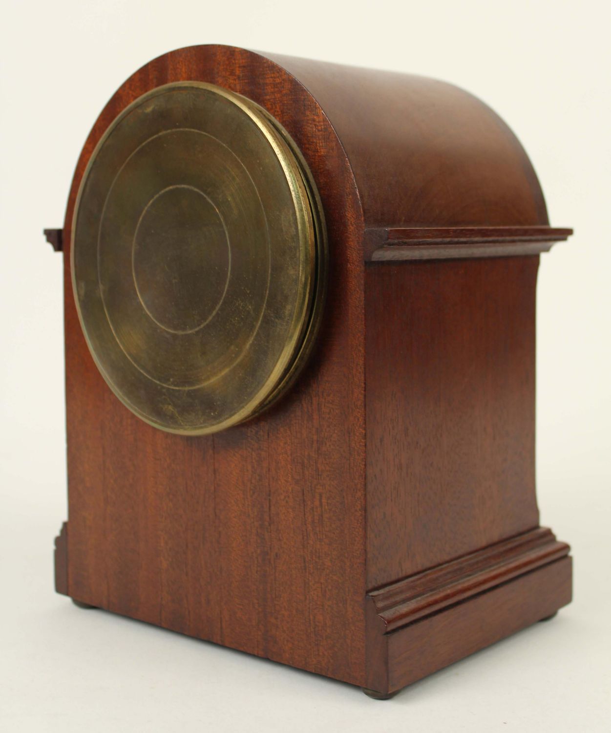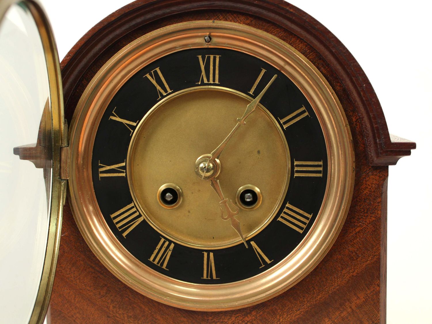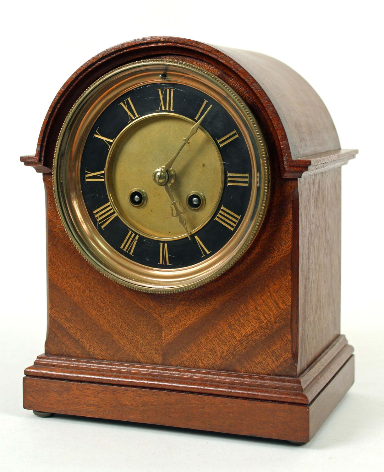 French Mahogany Mantle Clock. the clock has an arched top, black dial with gold leaf letters, beveled glass and fleur-de-lis hour hand. The clock comes with the pendulum. Clock does not have a key. Measures 9 1/8" H. X 7 1/8" W. X 5 1/2" D. Condition – The clock case and works look to be in good condition. Clock does not have a key. Clock has not been tested and is not guaranteed to work.