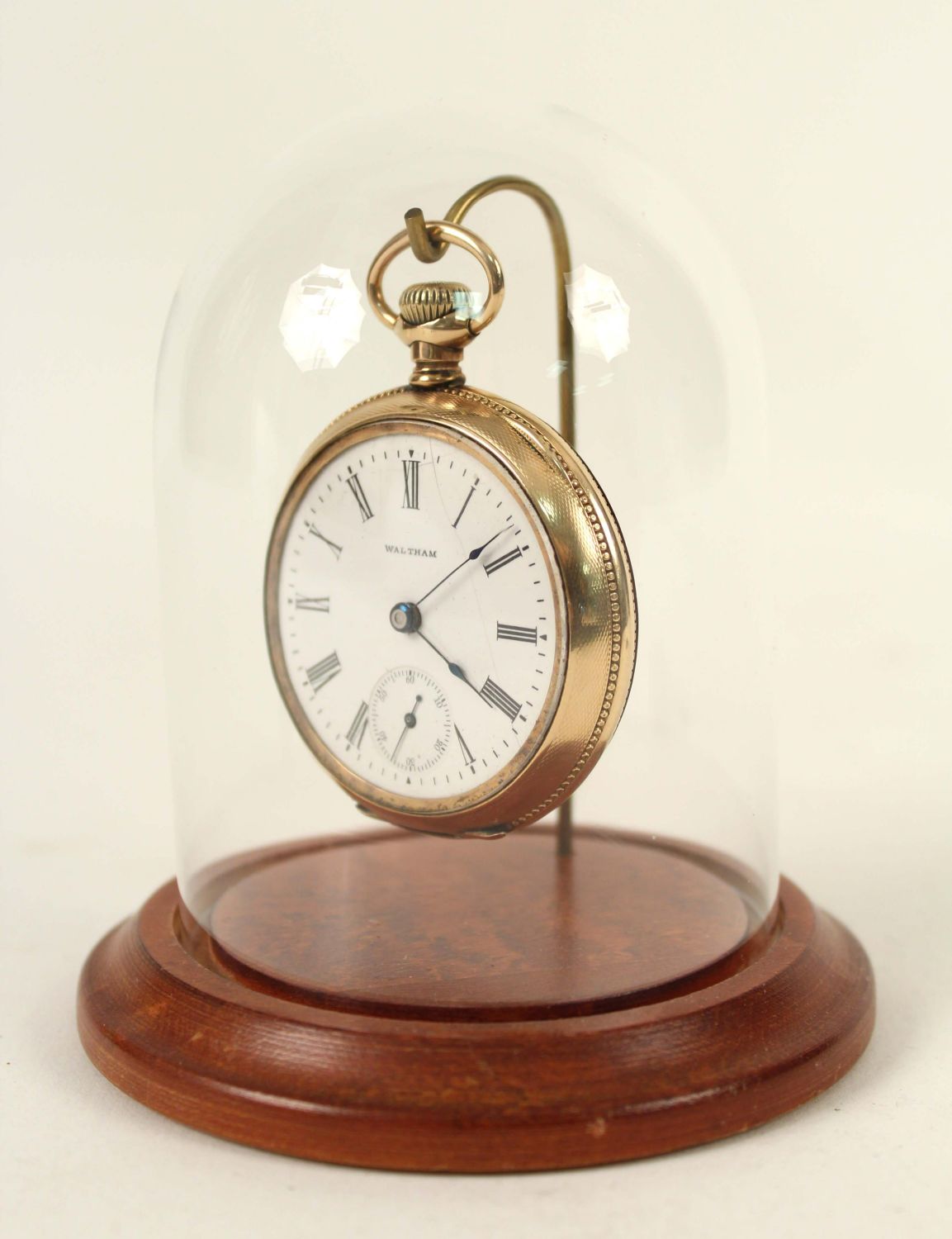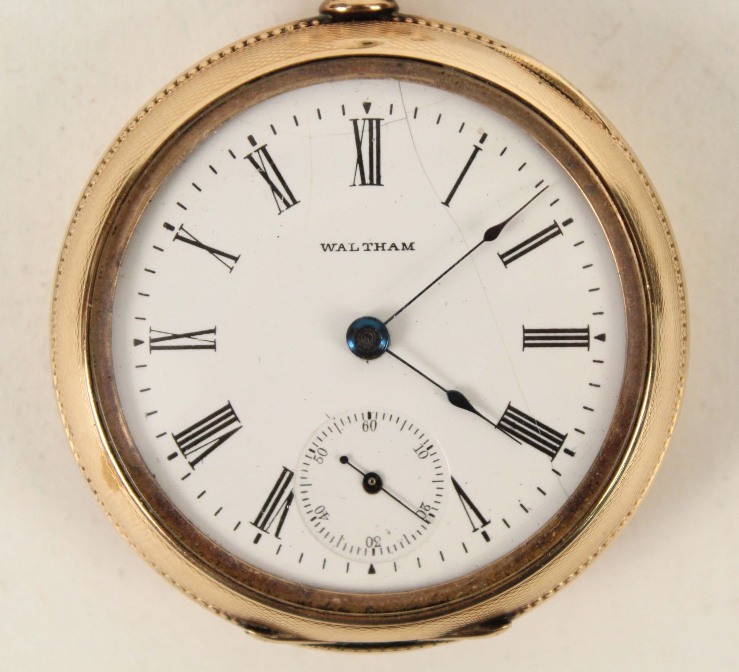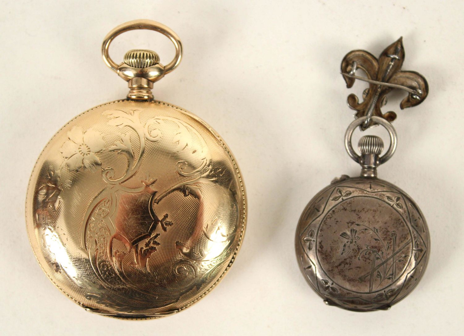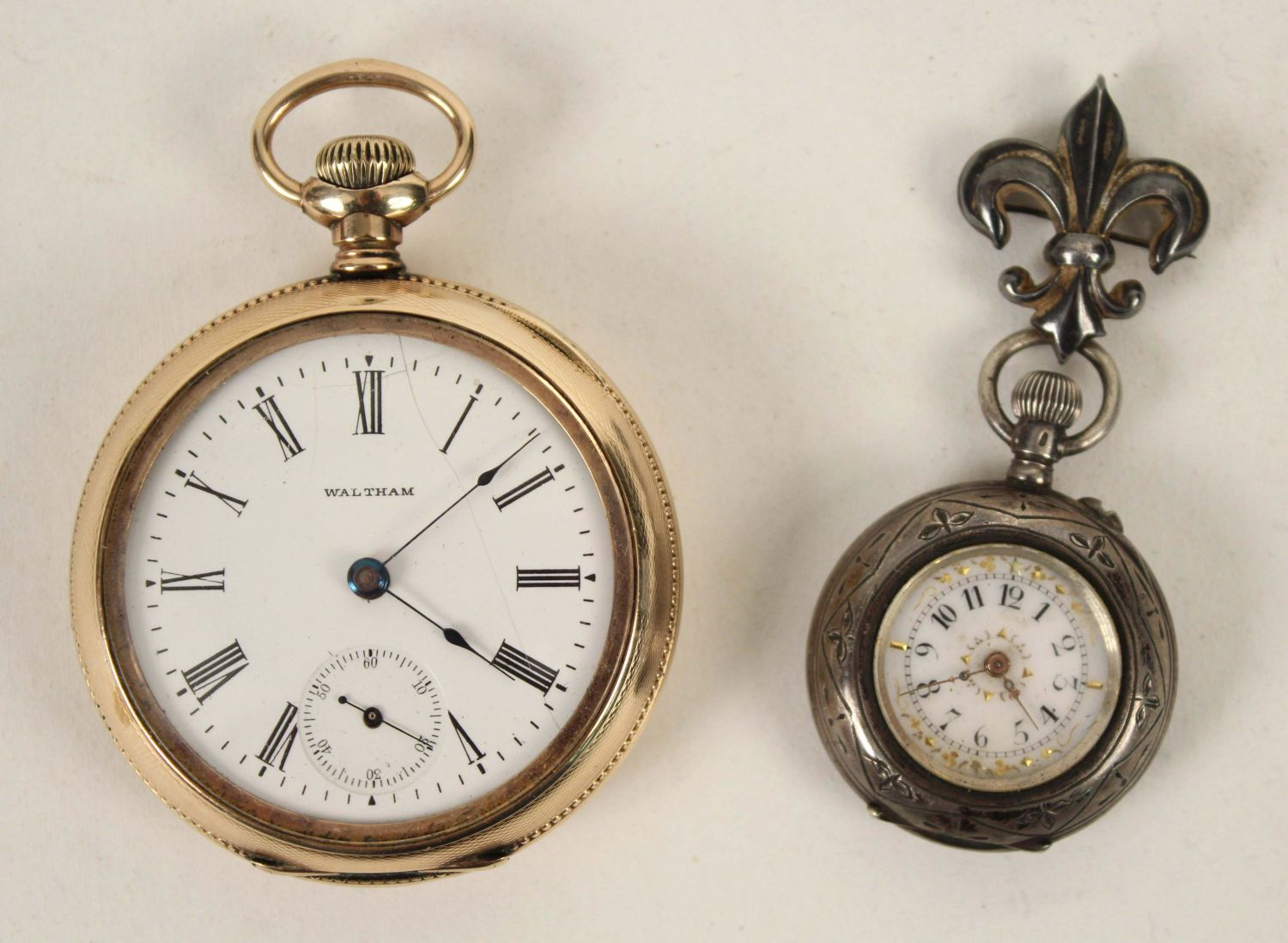 German Silver and 14K Gold Filled Antique Watches. (1) Waltham 14K gold filled beautiful men’s pocket watch, marked J. Boss 14K, tested gold fill, not solid 14K. Comes with a dome stand. Measures 2 1/8" Dia. (1) Ladies lapel watch marked 800 silver with Fleur-de-lis Sterling silver pin. Watch measures 1 3/8" Dia. Condition – Men’s watch runs, has hairline cracks in dial. Ladies watch does not run.