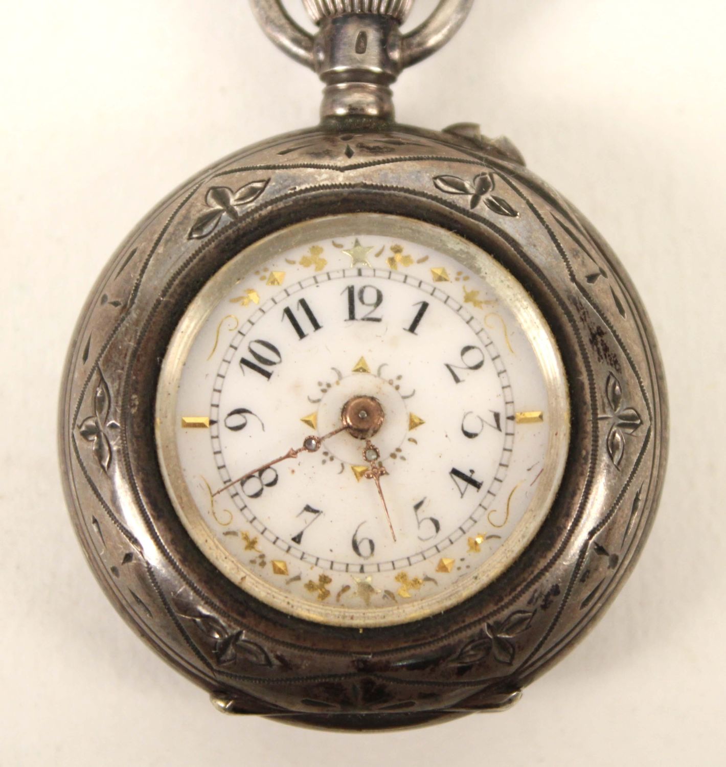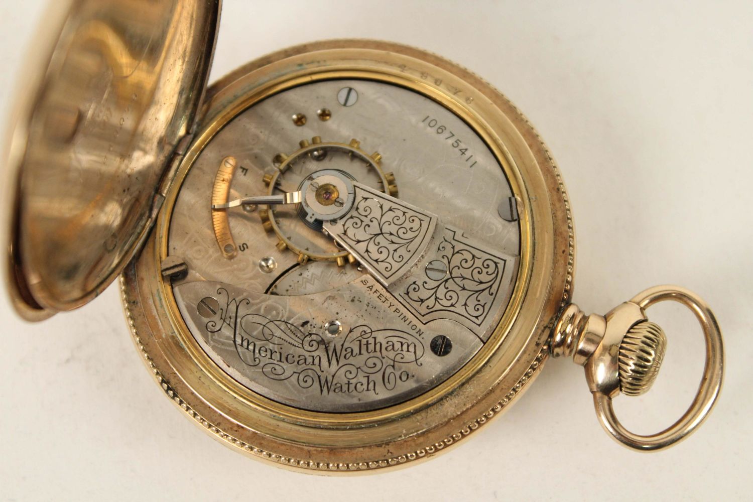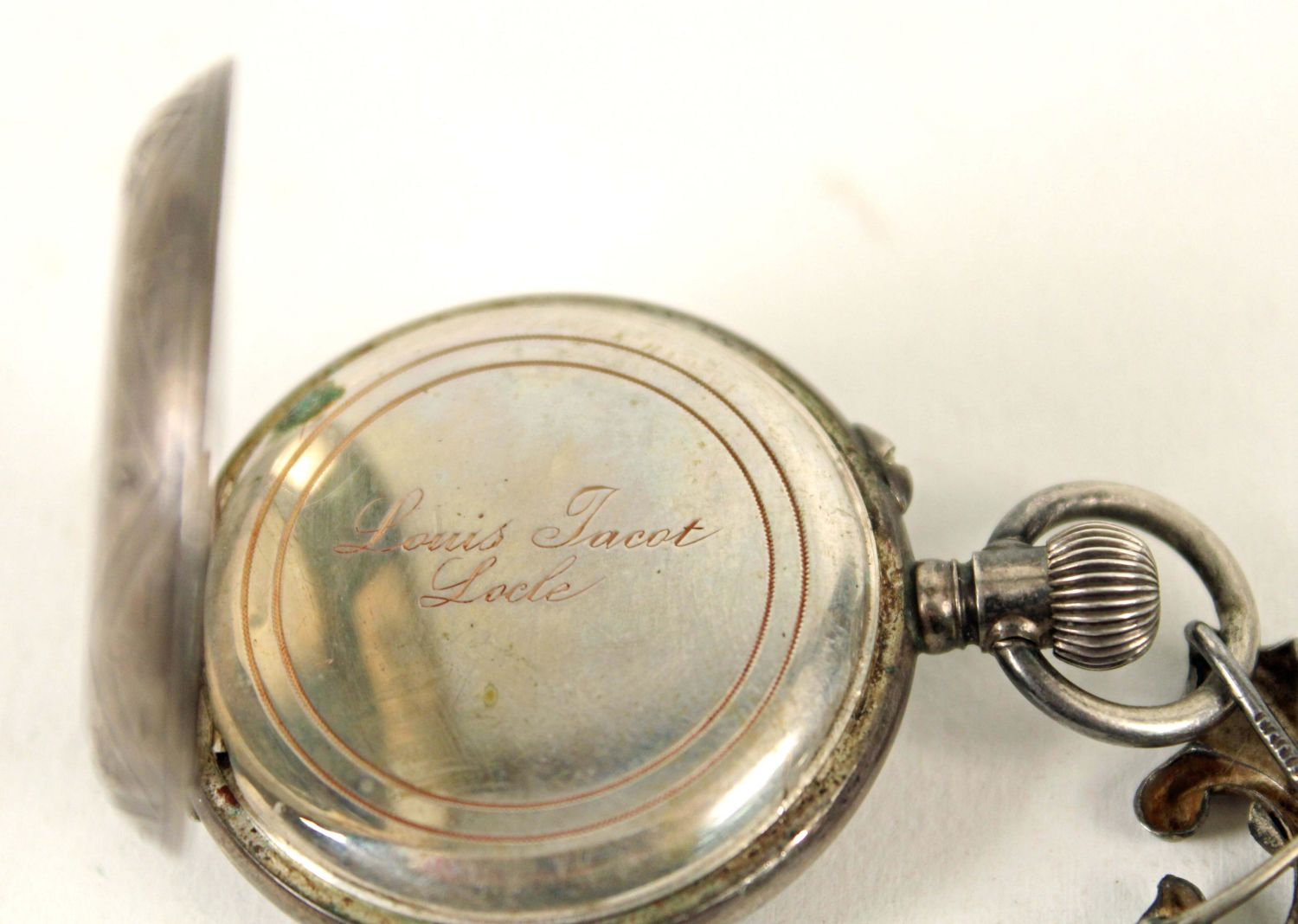 German Silver and 14K Gold Filled Antique Watches. (1) Waltham 14K gold filled beautiful men’s pocket watch, marked J. Boss 14K, tested gold fill, not solid 14K. Comes with a dome stand. Measures 2 1/8" Dia. (1) Ladies lapel watch marked 800 silver with Fleur-de-lis Sterling silver pin. Watch measures 1 3/8" Dia. Condition – Men’s watch runs, has hairline cracks in dial. Ladies watch does not run.