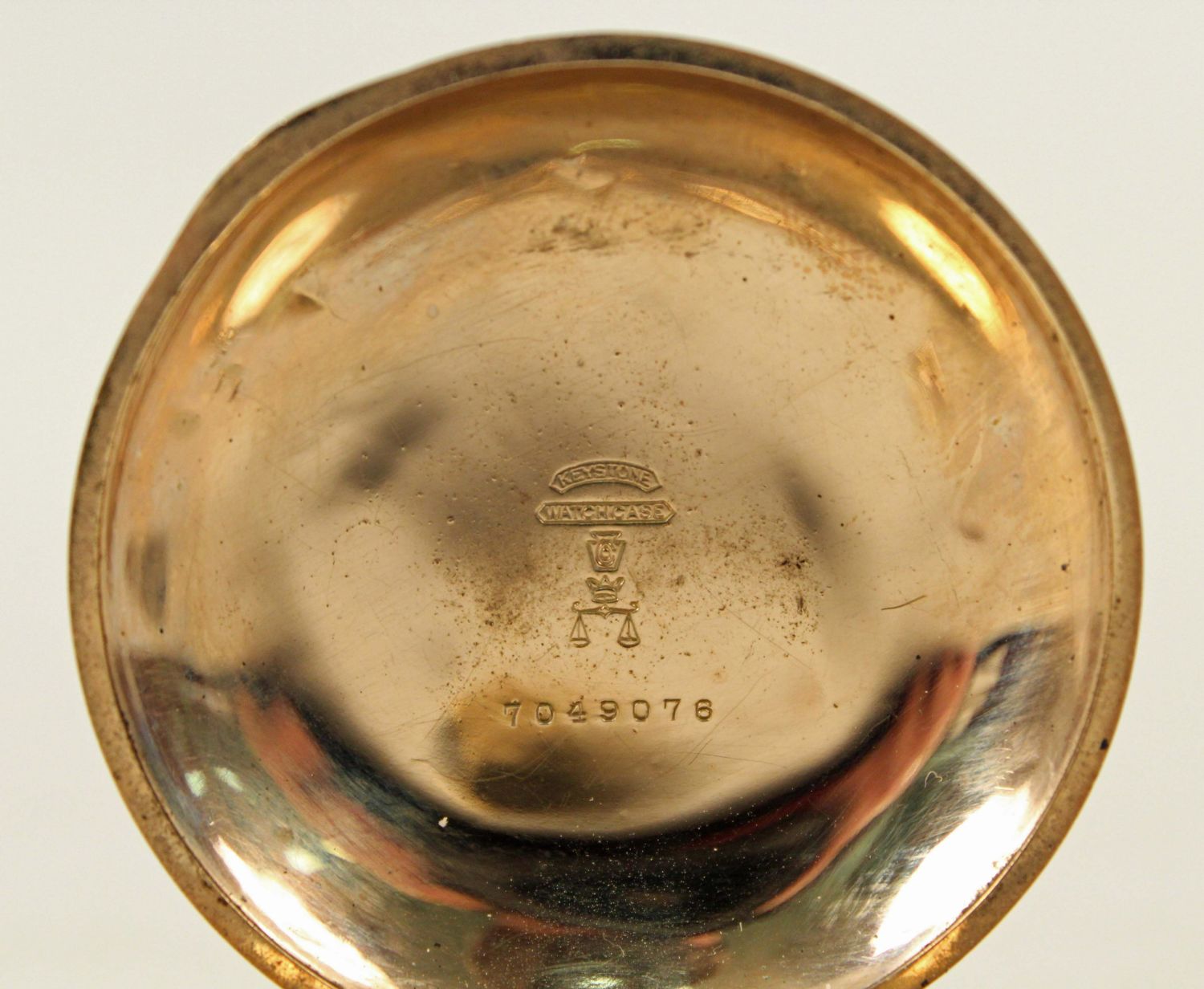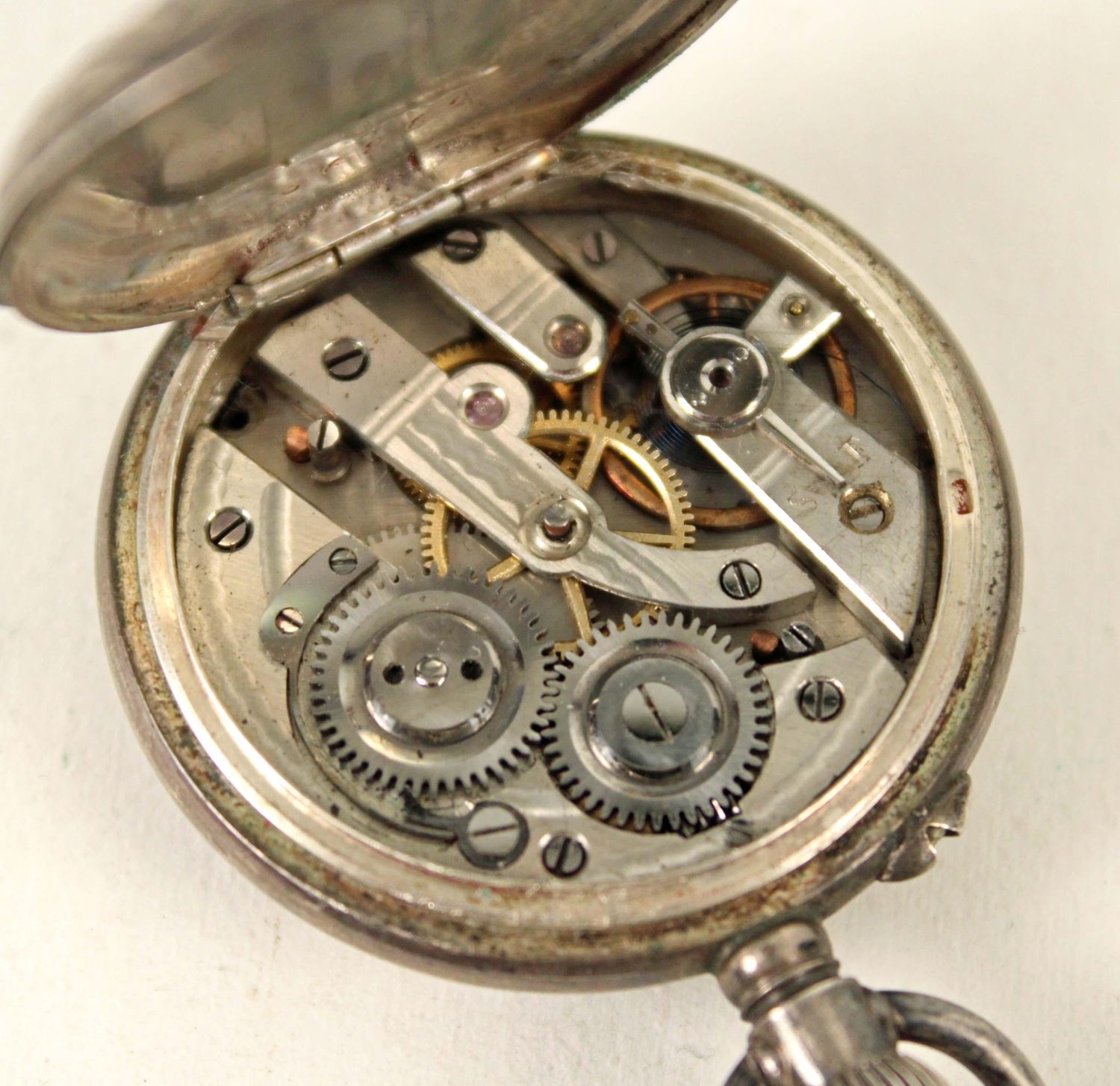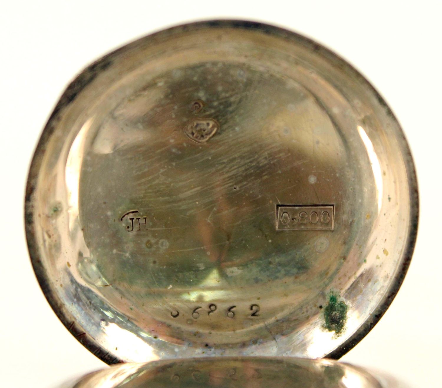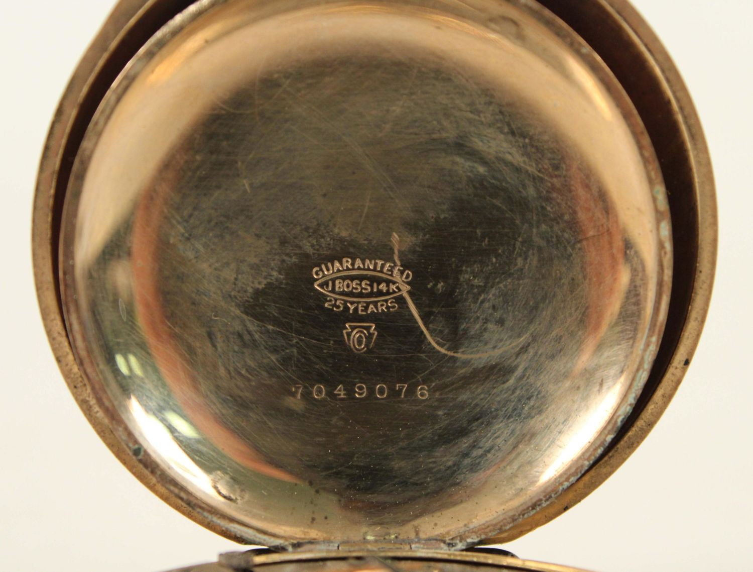 German Silver and 14K Gold Filled Antique Watches. (1) Waltham 14K gold filled beautiful men’s pocket watch, marked J. Boss 14K, tested gold fill, not solid 14K. Comes with a dome stand. Measures 2 1/8" Dia. (1) Ladies lapel watch marked 800 silver with Fleur-de-lis Sterling silver pin. Watch measures 1 3/8" Dia. Condition – Men’s watch runs, has hairline cracks in dial. Ladies watch does not run.
