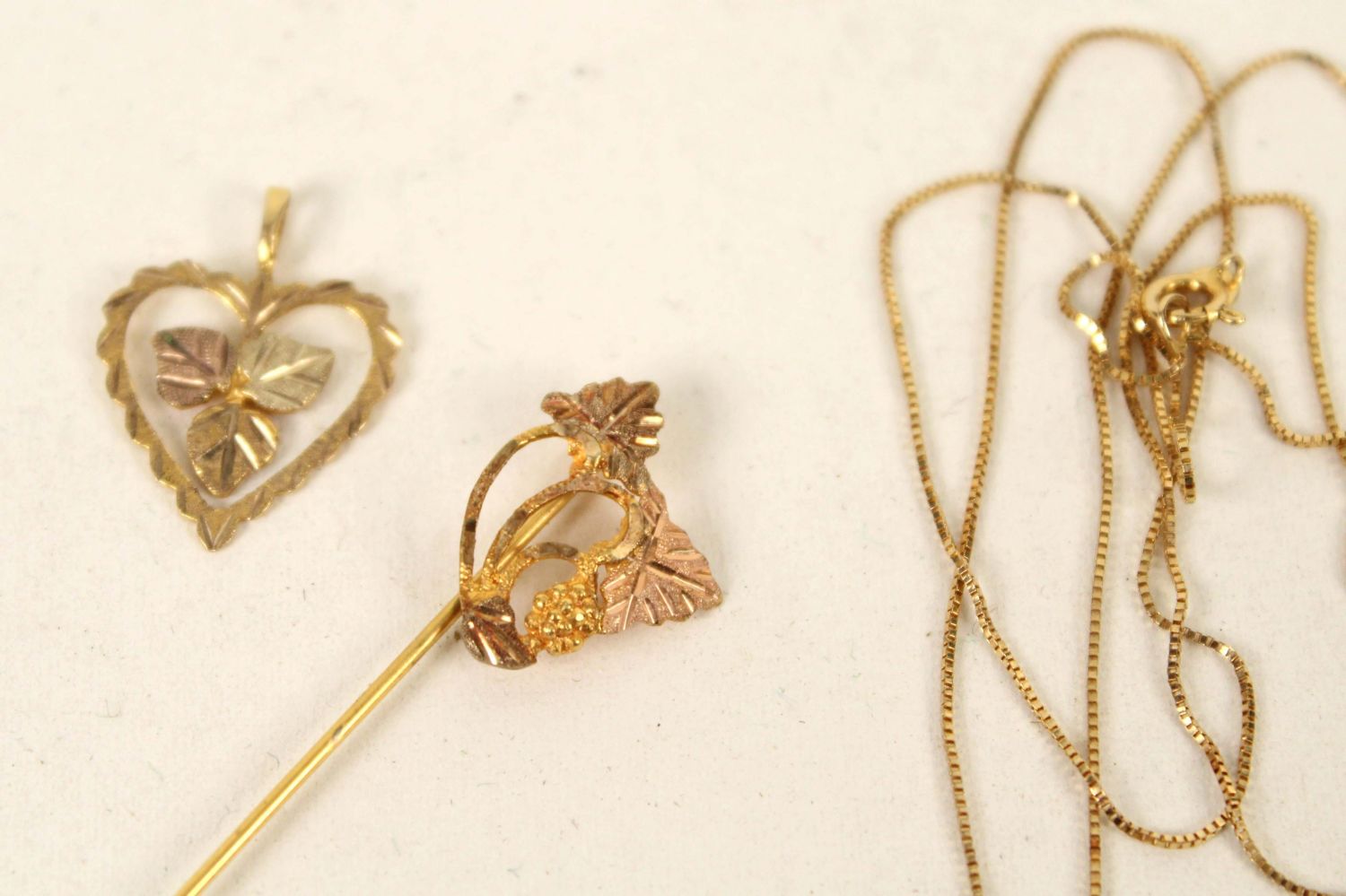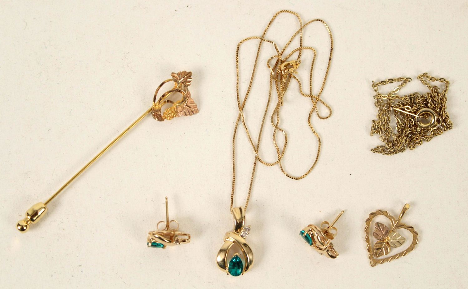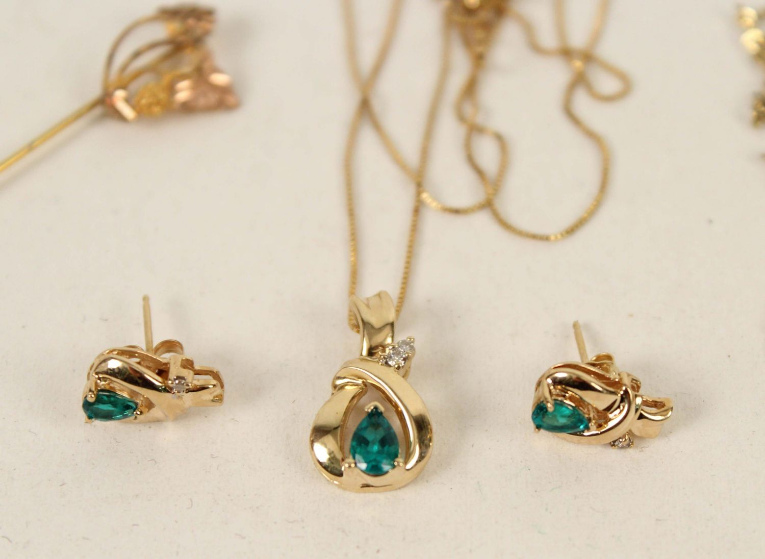 *WE WILL NOT ACCEPT CREDIT CARD AS PAYMENT FOR THIS LOT* Emerald and Diamond Necklace and Earrings. (1) 18" chain marked 14K with emerald and diamond pendant and matching earrings. The stones are small, were not tested and could possibly be synthetic. Total weight with stones 0.175 Ounces Troy. (1) 10K Gold stick pin and pendant. The pendant is marked 10K and decorative head of pin was tested 10K. Weigh .050 Ounce Troy. (1) Gold filled 18K chain. Condition – Good condition.