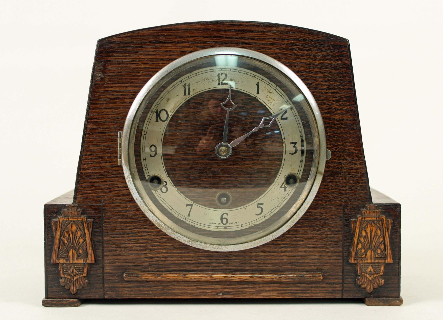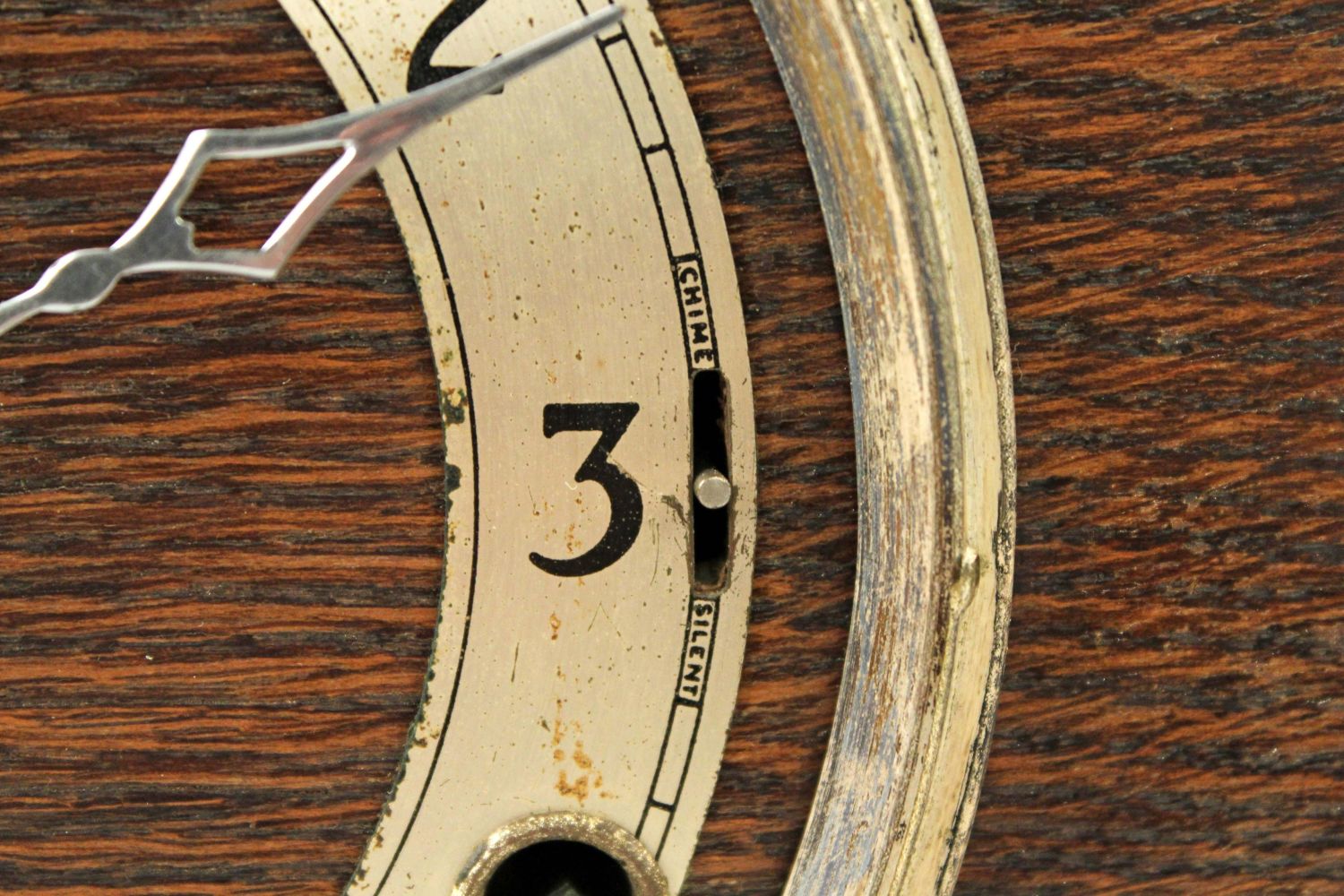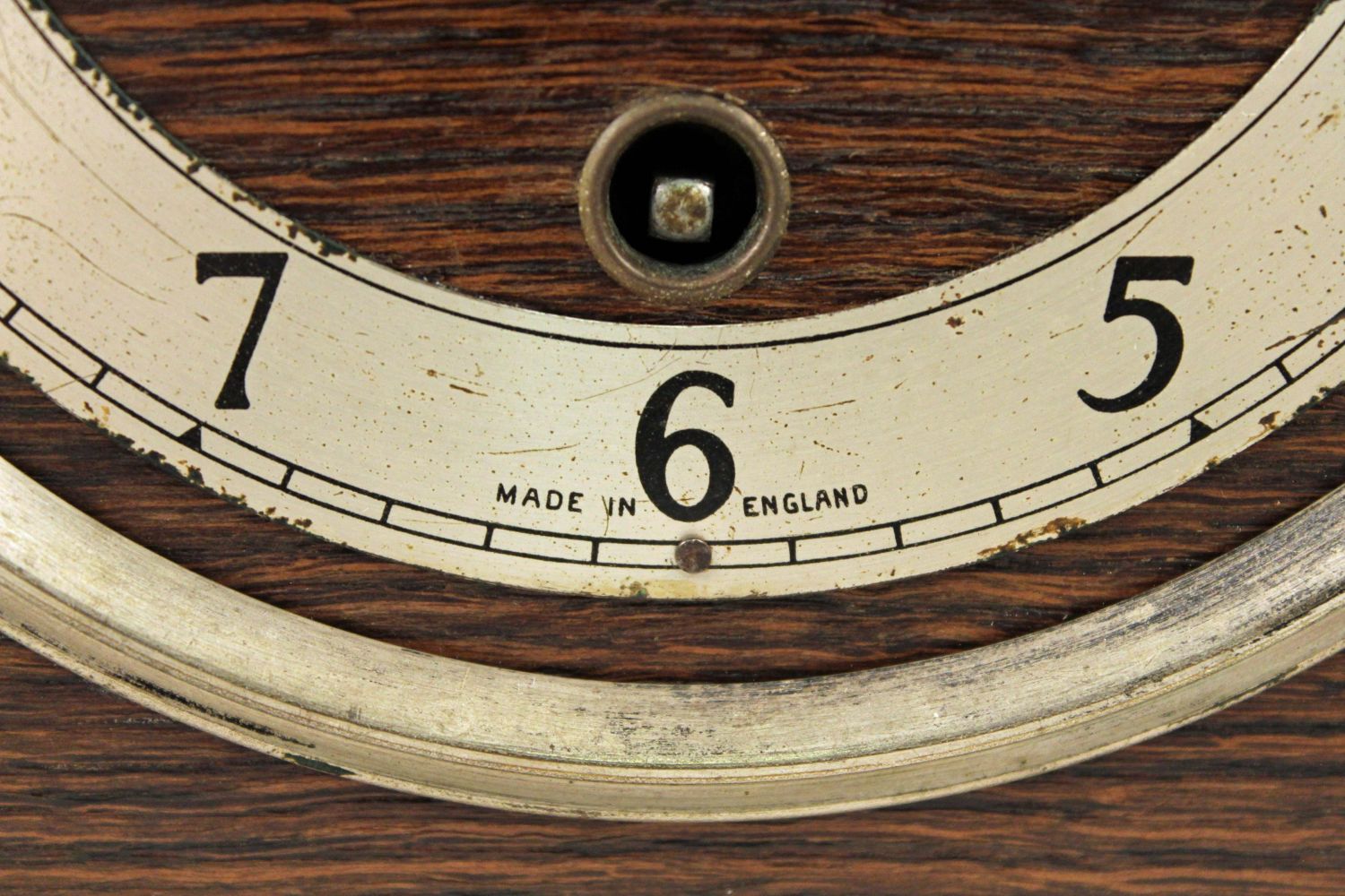 English Oak Mantle Clock Chime Hour and each quarter hour. Comes with pendulum and key. Measures 9" H. X 11" W. Condition – Case is in good condition, works look good, did not run at inventory.