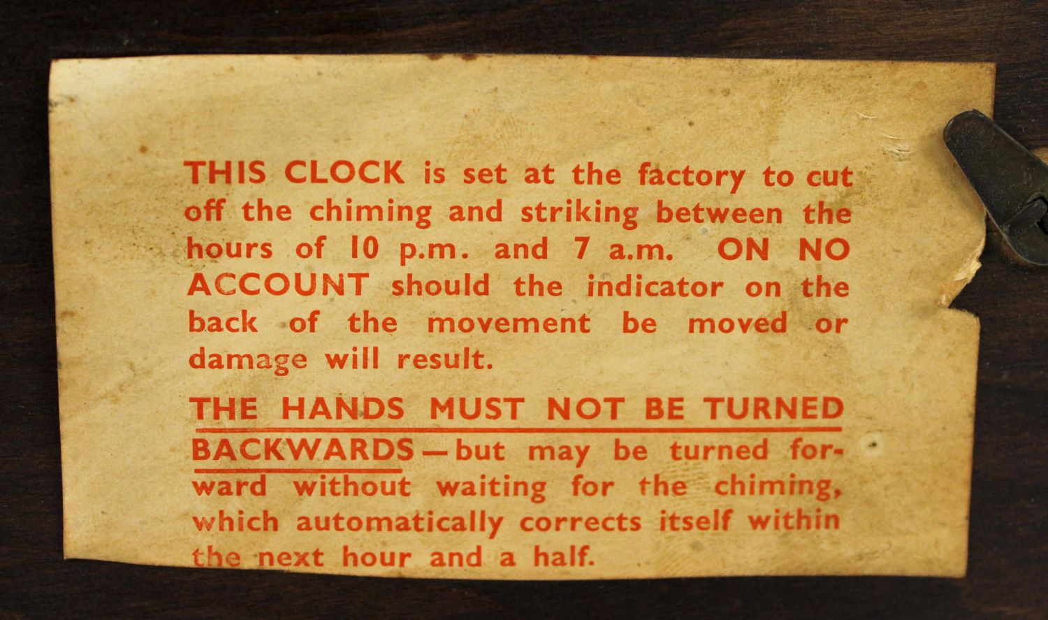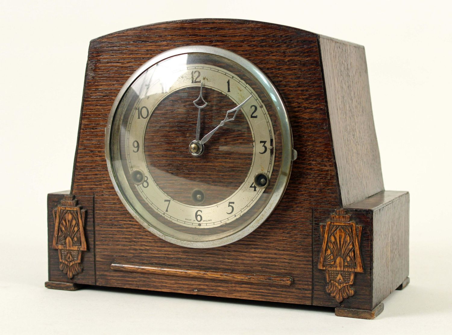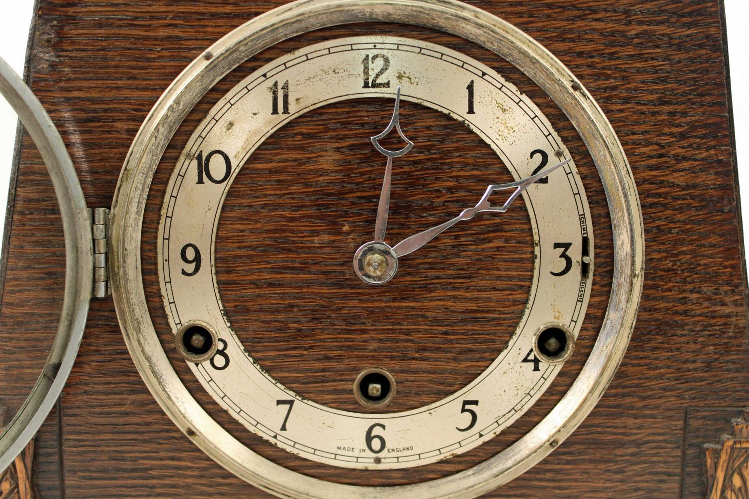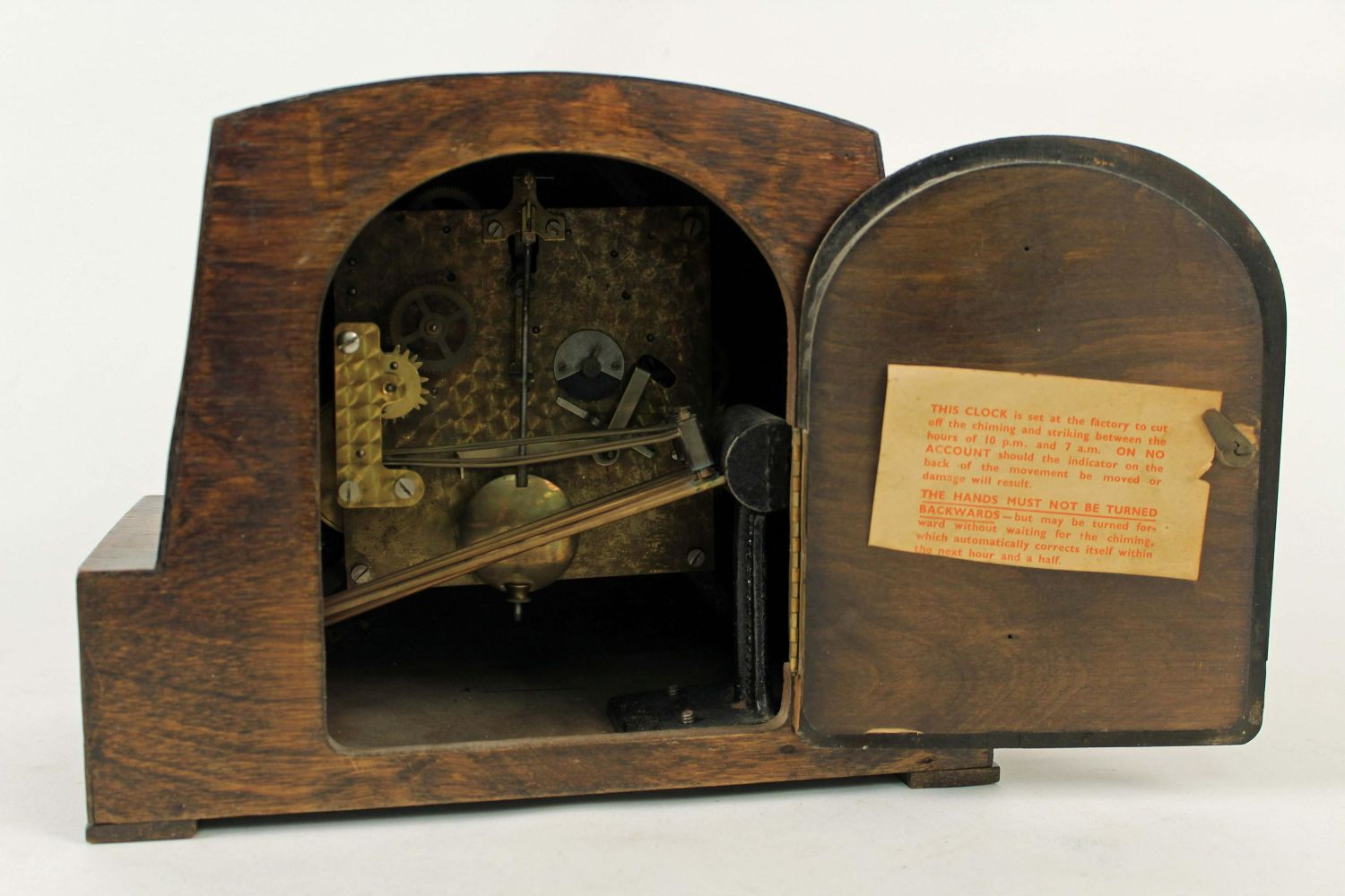 English Oak Mantle Clock Chime Hour and each quarter hour. Comes with pendulum and key. Measures 9" H. X 11" W. Condition – Case is in good condition, works look good, did not run at inventory.