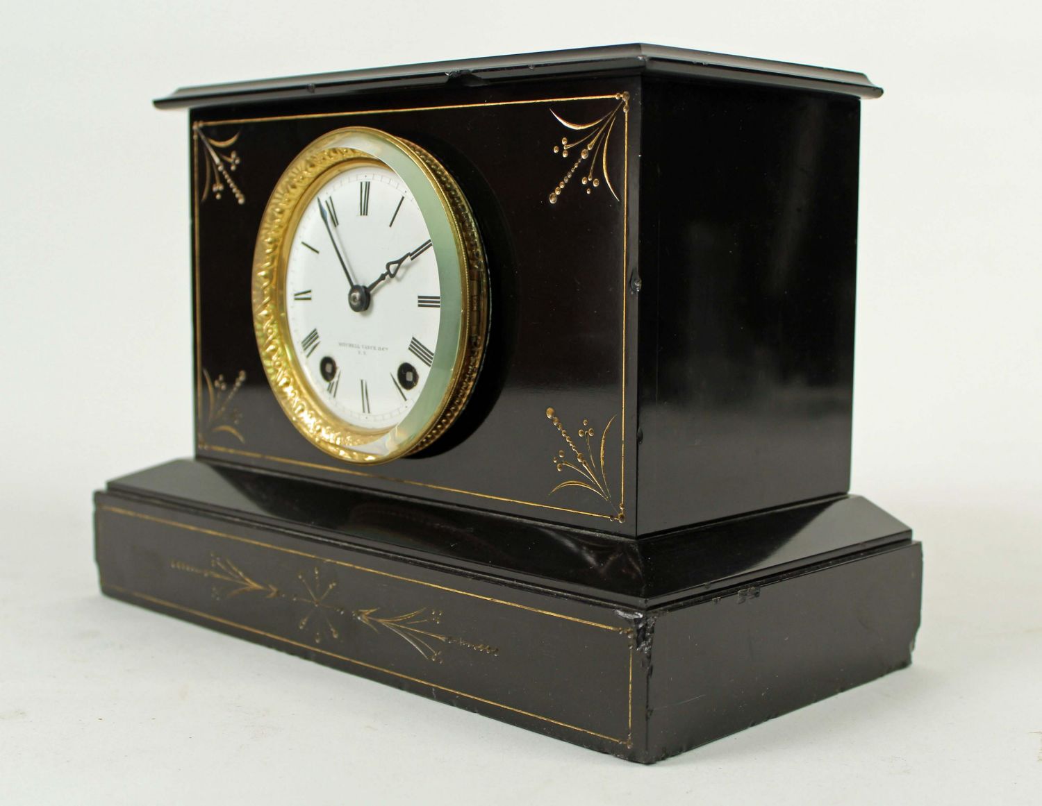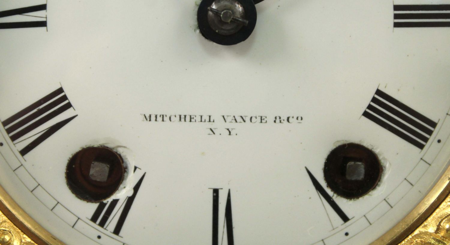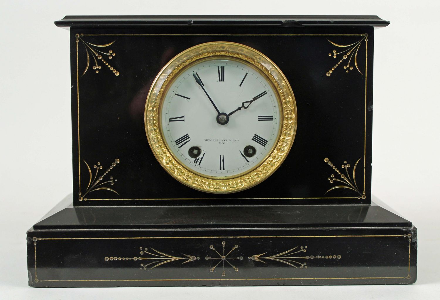 Mitchell Vance & Co., New York, Black Marble Mantle Clock. Clock comes with key and pendulum. Measures 8" H. X 11 1/2" W. X 5 3/4". Condition – Works look to be in good condition. Case is missing back door and has some small chips to marble. See Photos. Clock is not guaranteed to run.
