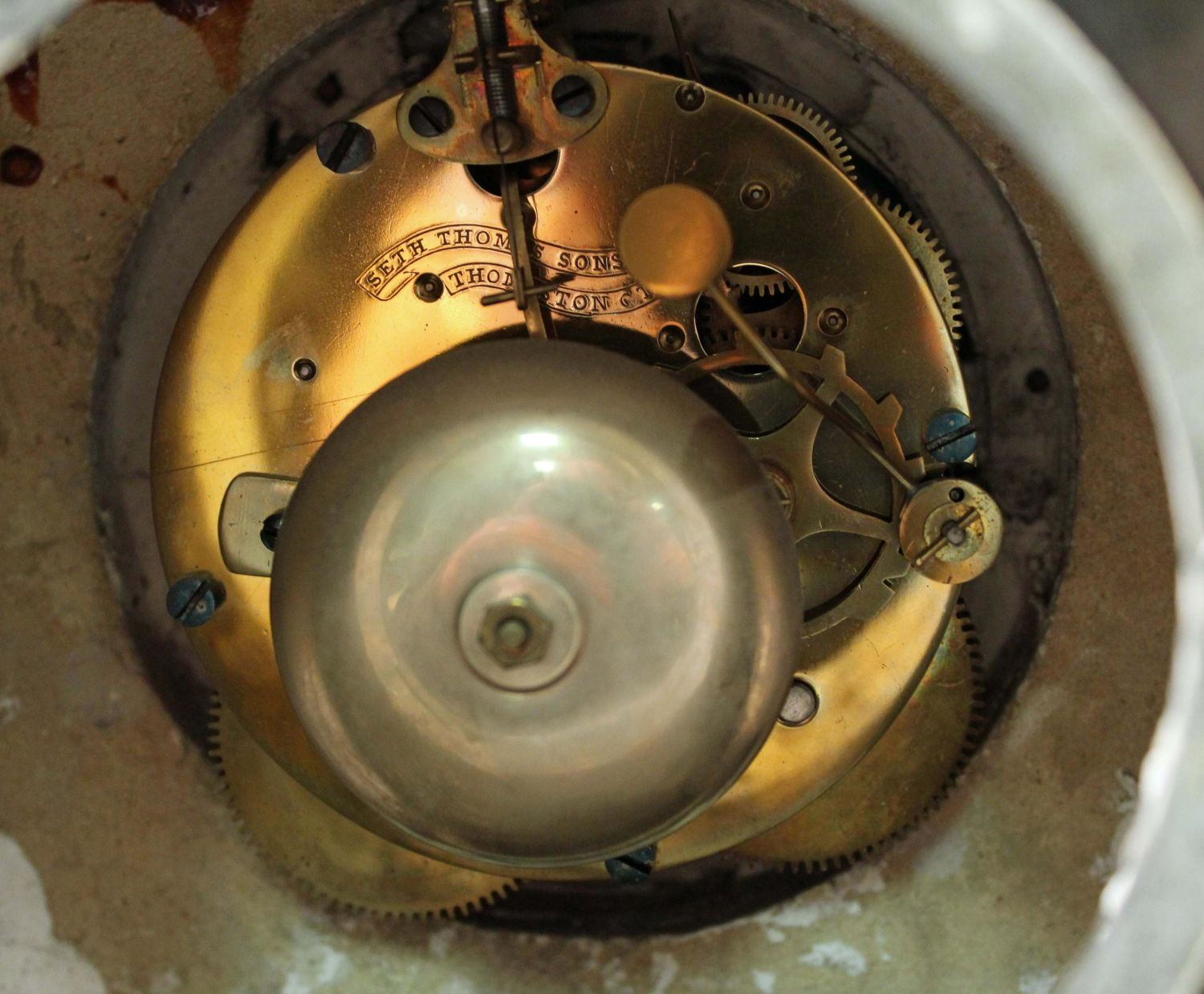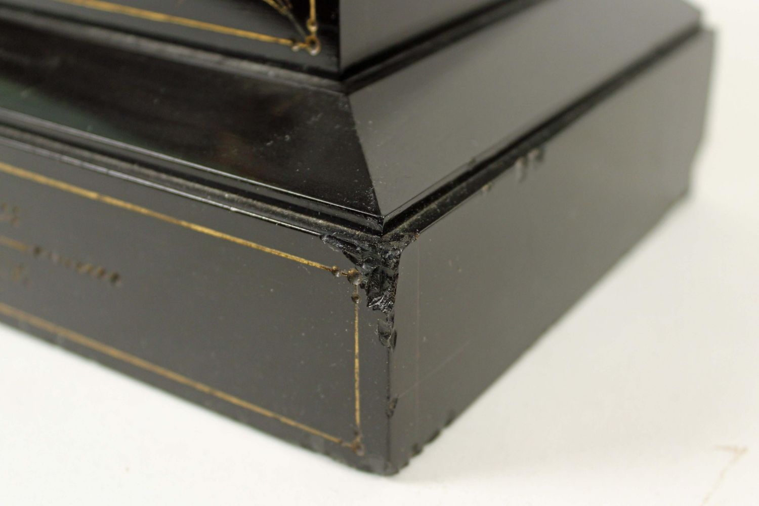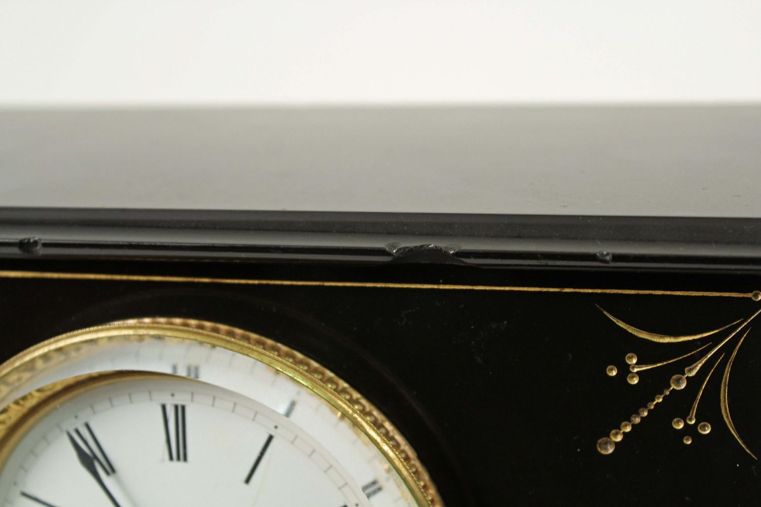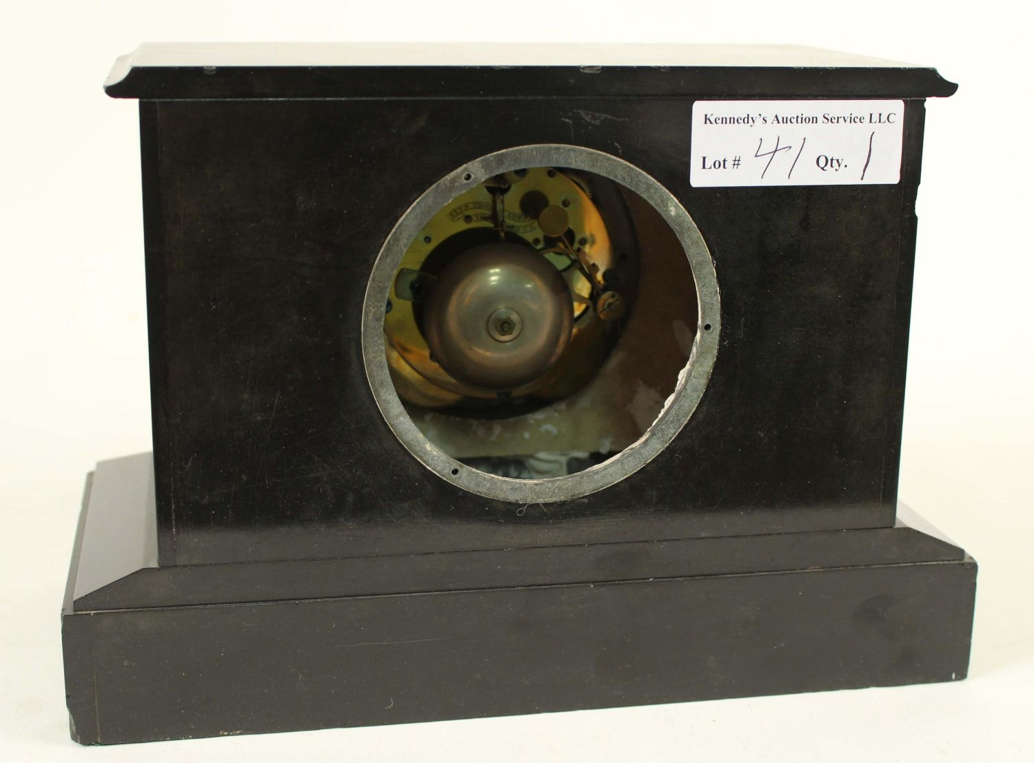 Mitchell Vance & Co., New York, Black Marble Mantle Clock. Clock comes with key and pendulum. Measures 8" H. X 11 1/2" W. X 5 3/4". Condition – Works look to be in good condition. Case is missing back door and has some small chips to marble. See Photos. Clock is not guaranteed to run.