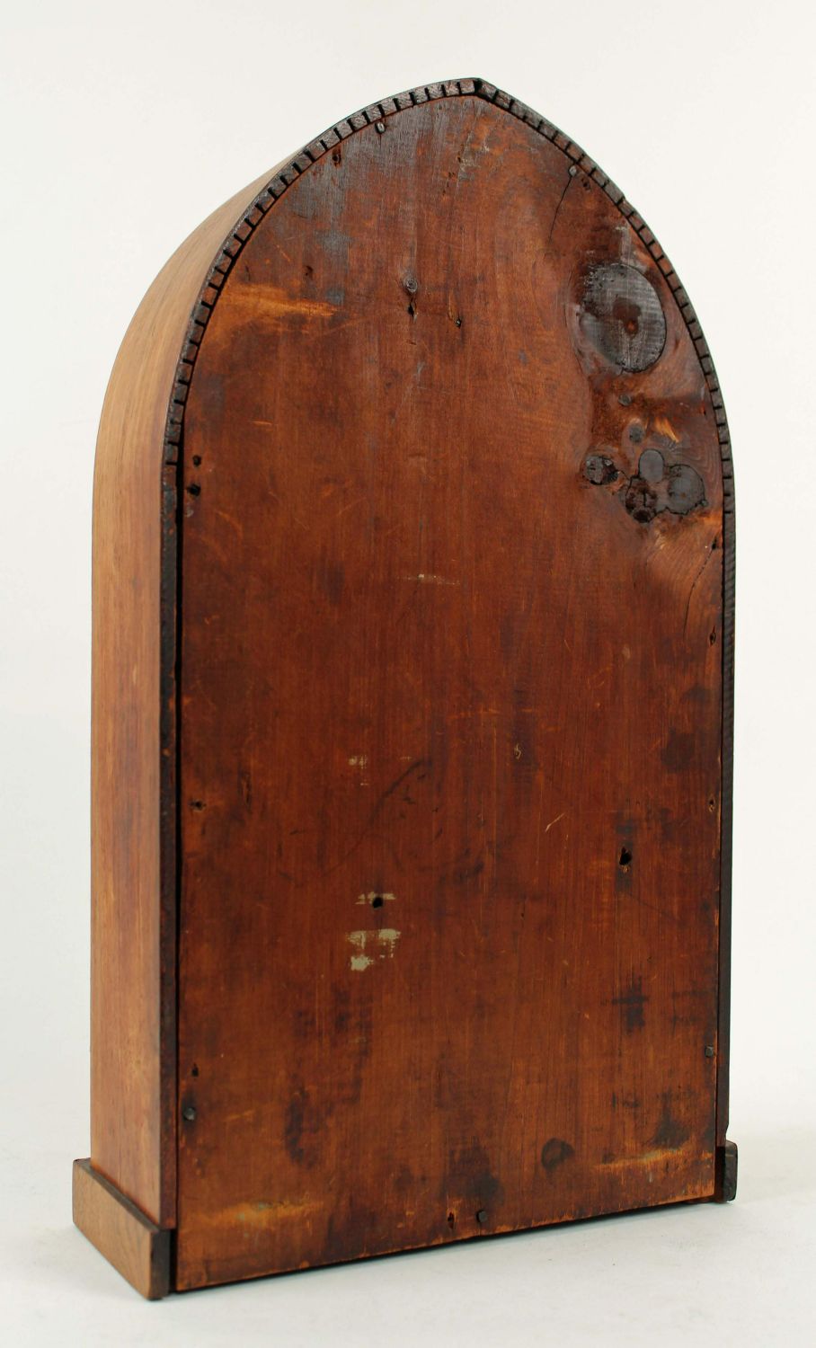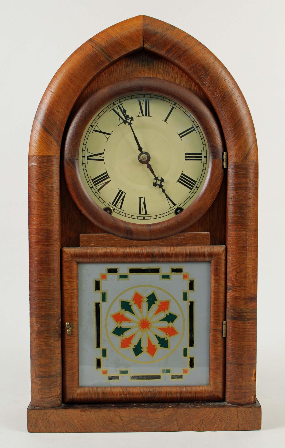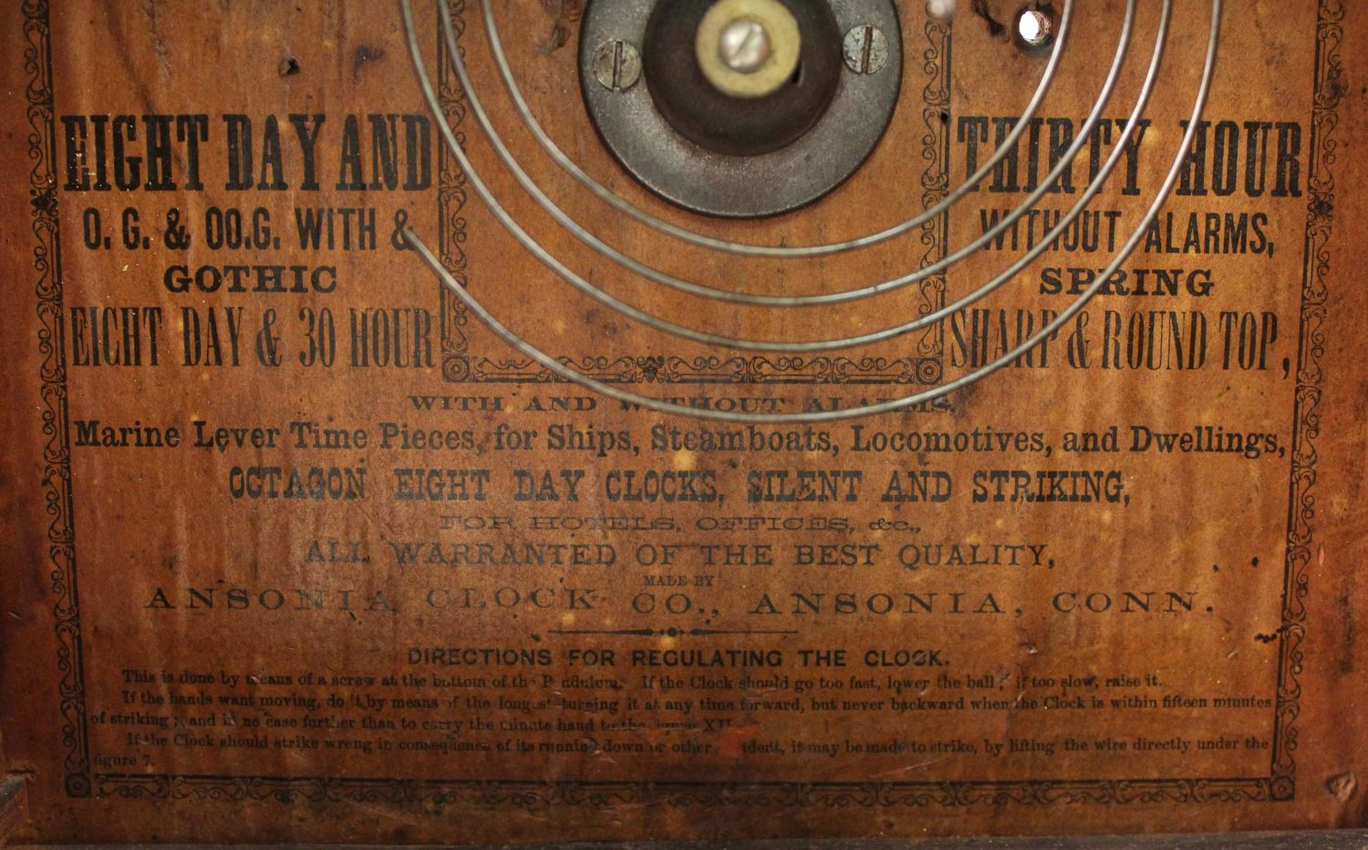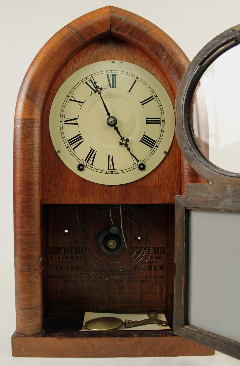 Ansonia Beehive Gothic Style Mantle Clock Circa 1860. Eight day time and strike movement in mahogany case. Interior back board has the original information label attached. measures 18 3/4" H. X 10 1/2" W. X 4" D. Includes pendulum and key. Condition – Case is in good condition. Works look to be in good running condition. Clock is not guaranteed to run.