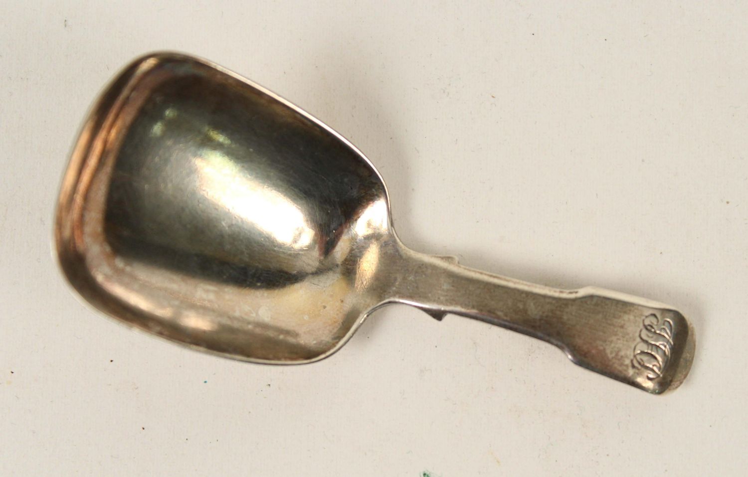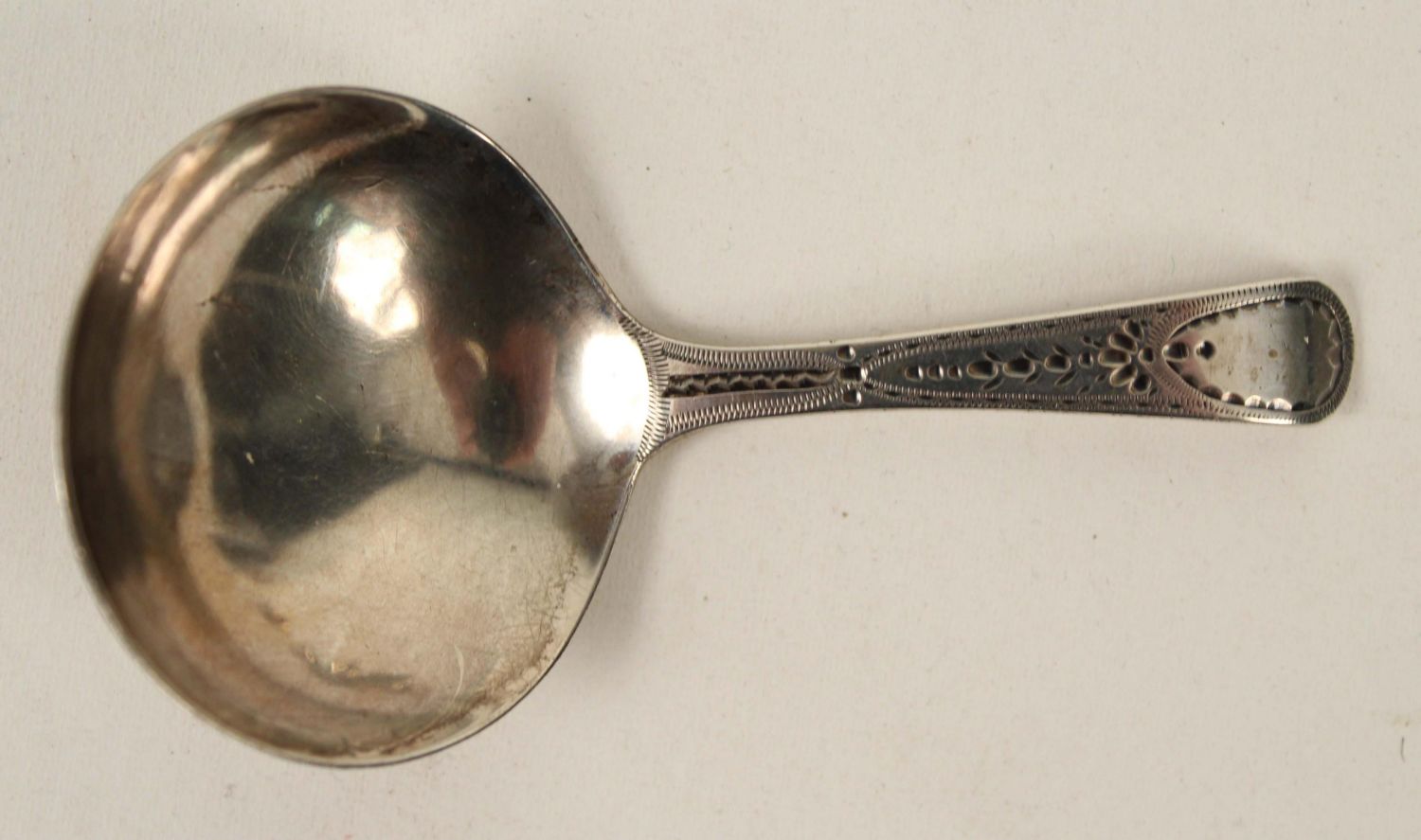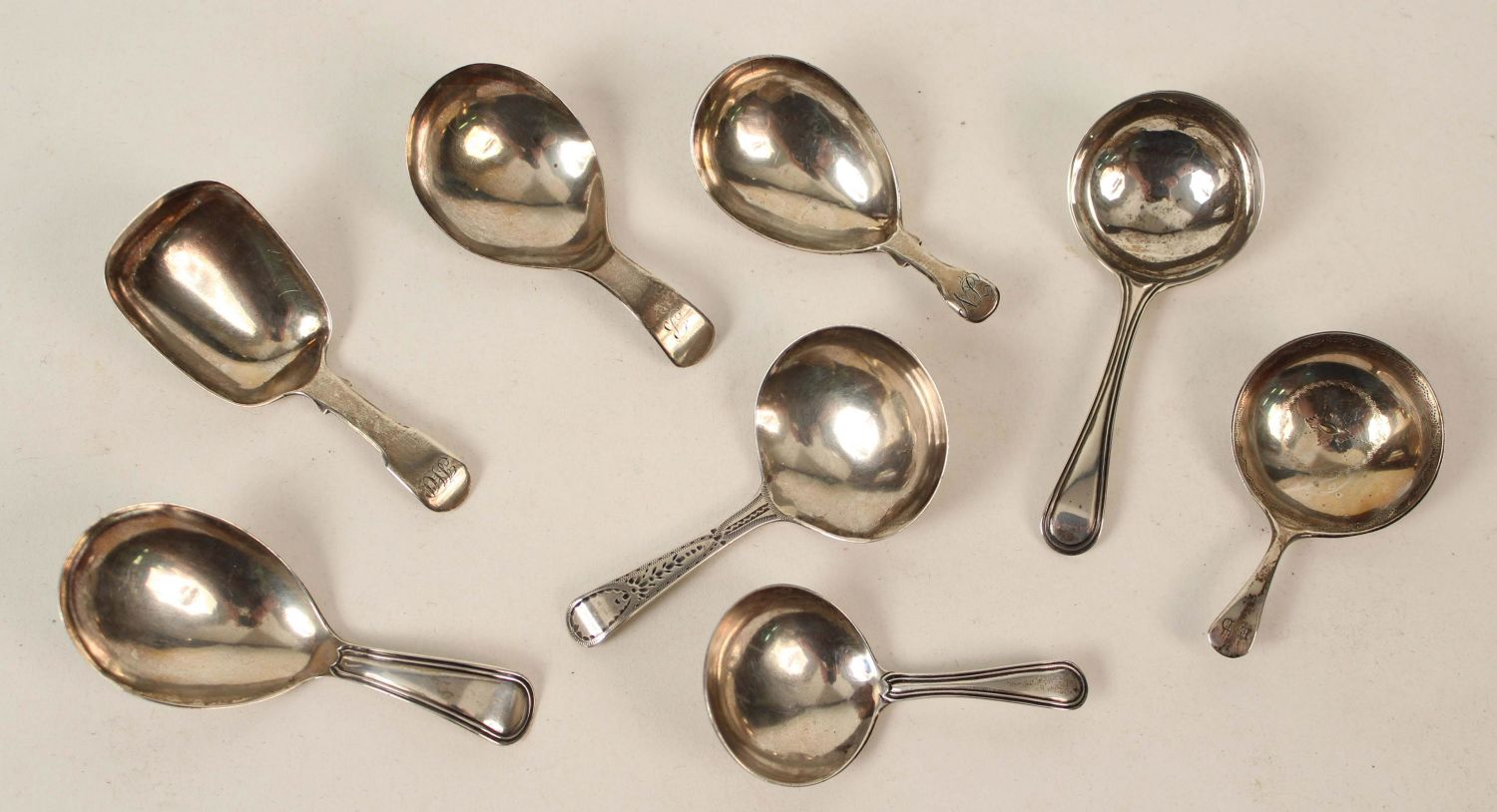 *WE WILL NOT ACCEPT CREDIT CARD AS PAYMENT FOR THIS LOT* Group of Eight English Sterling Silver Tea Caddy Spoons with Lion Mark. The spoon lengths measure 2 3/4" – 3 3/4" with a bowl diameter of approx. 1 3/8" – 1 5/8". Long Total weight 2.9 Ounces Troy. Condition – Overall good condition with four monogrammed.