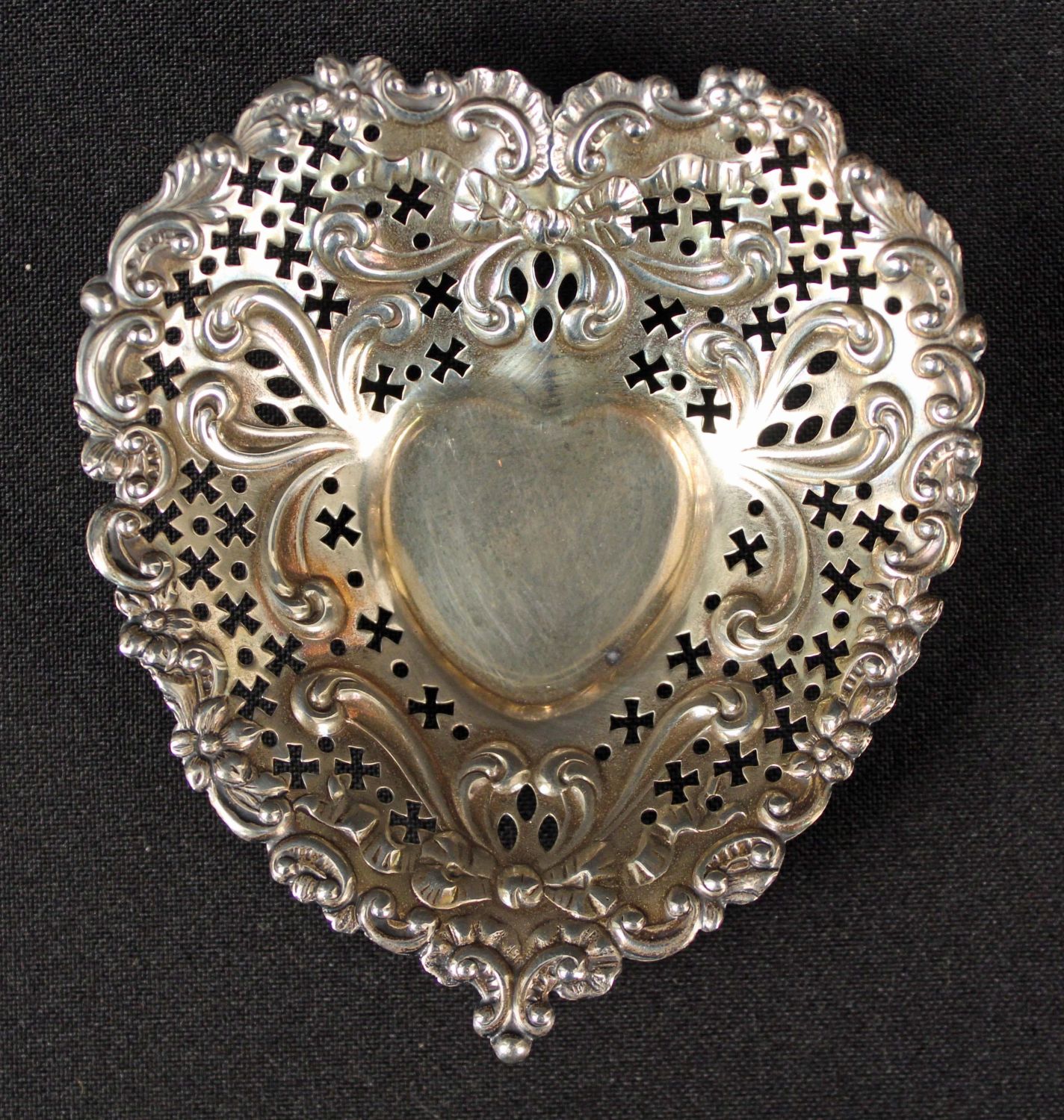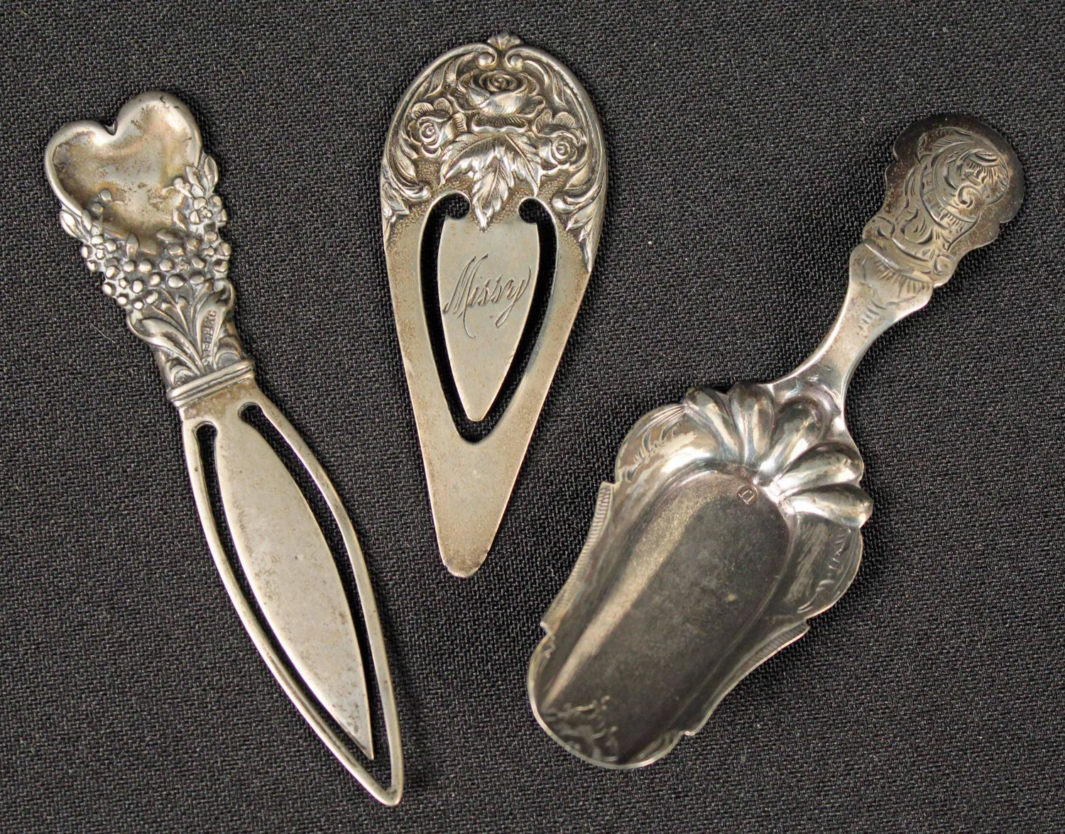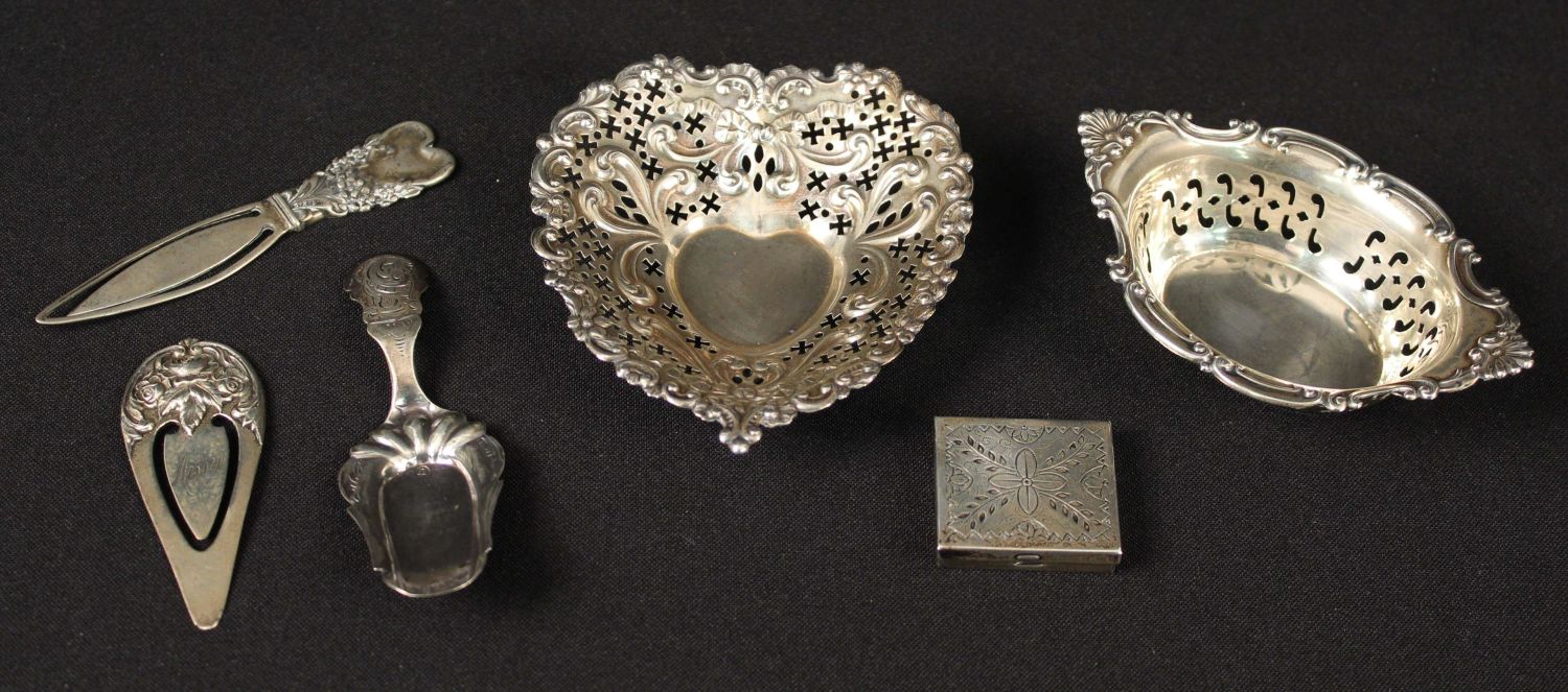 *WE WILL NOT ACCEPT CREDIT CARD AS PAYMENT FOR THIS LOT* Mixed Group of Sterling Silver Dishes, Etc. (1) Chantilly Gorham sterling silver heart shaped pierced nut dish. (1) Gorham Cromwell sterling silver nut bowl basket dish. (1) S. Kirk & Son No. 9 sterling silver three roses floral bookmark. Engraved on verso "Fuqua" and "Missy" on front. Measures 2 1/2" long. (1) Sterling silver art nouveau bookmark floral heart. Measures 3 1/4" long. (1) Sterling silver 19th C. East Lake decorated pill box. Measures 1 1/4" square. (1) 19th C. English silver mint scoop. Measures 3 1/2" long. The total weight is 2.9 ozt. Condition- Basket has dent at bottom. Other items are in good condition. See photos.