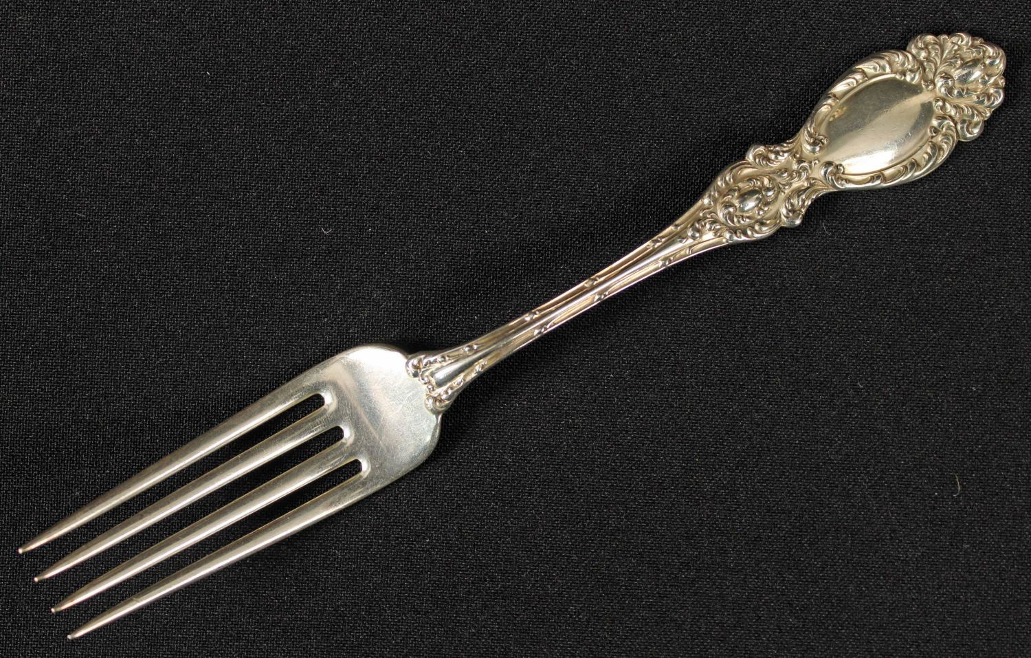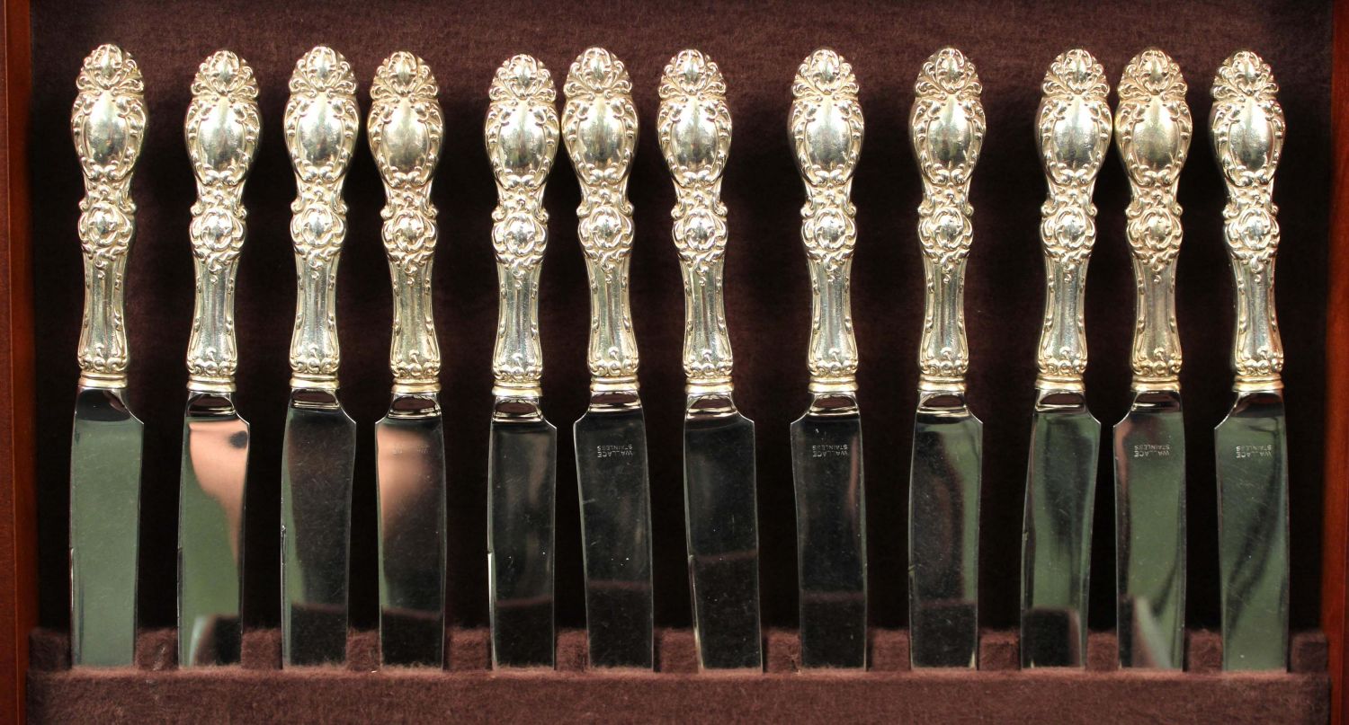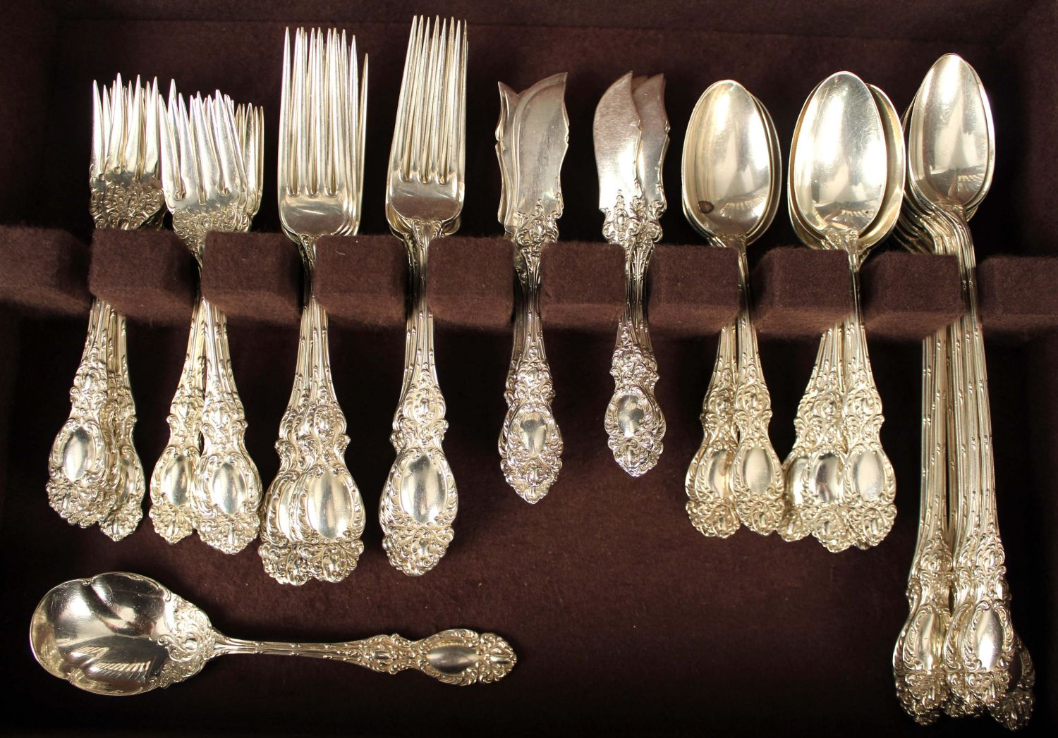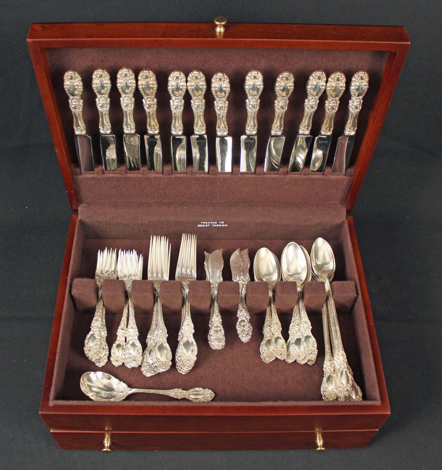 *WE WILL NOT ACCEPT CREDIT CARD AS PAYMENT FOR THIS LOT* Wallace Lucerne Sterling Silver Flatware, 70 Pcs. (12) New French hollow knives. (12) Iced tea spoons. (11) Tea spoons. (12) Flat handle butter spreader. (11) Dinner forks. (11) Salad forks. (1) Sugar shell. Total weight is approx. 64.53ozt. Knife handles were estimated at 0.5ozt. each. Condition- Flatware is in good condition. See photos.
