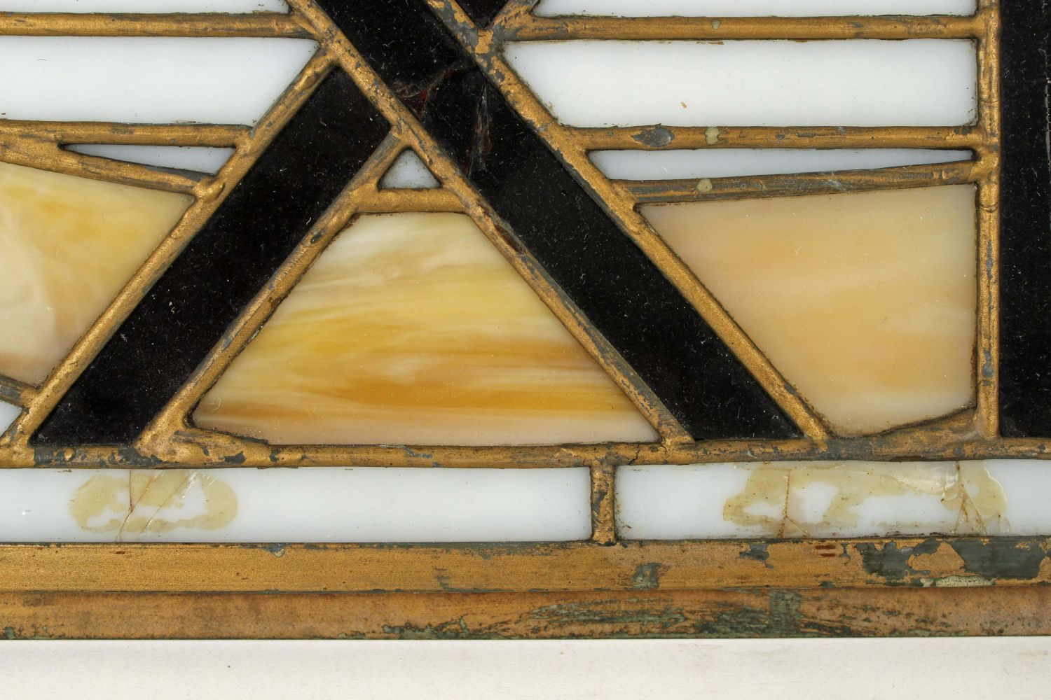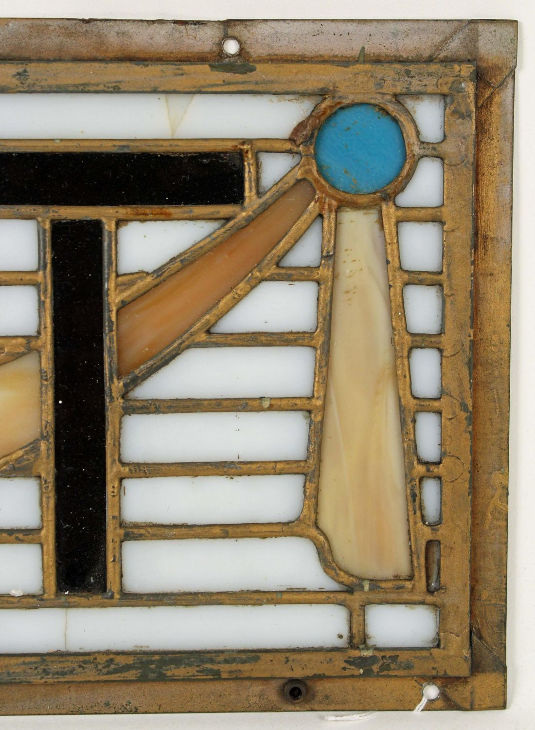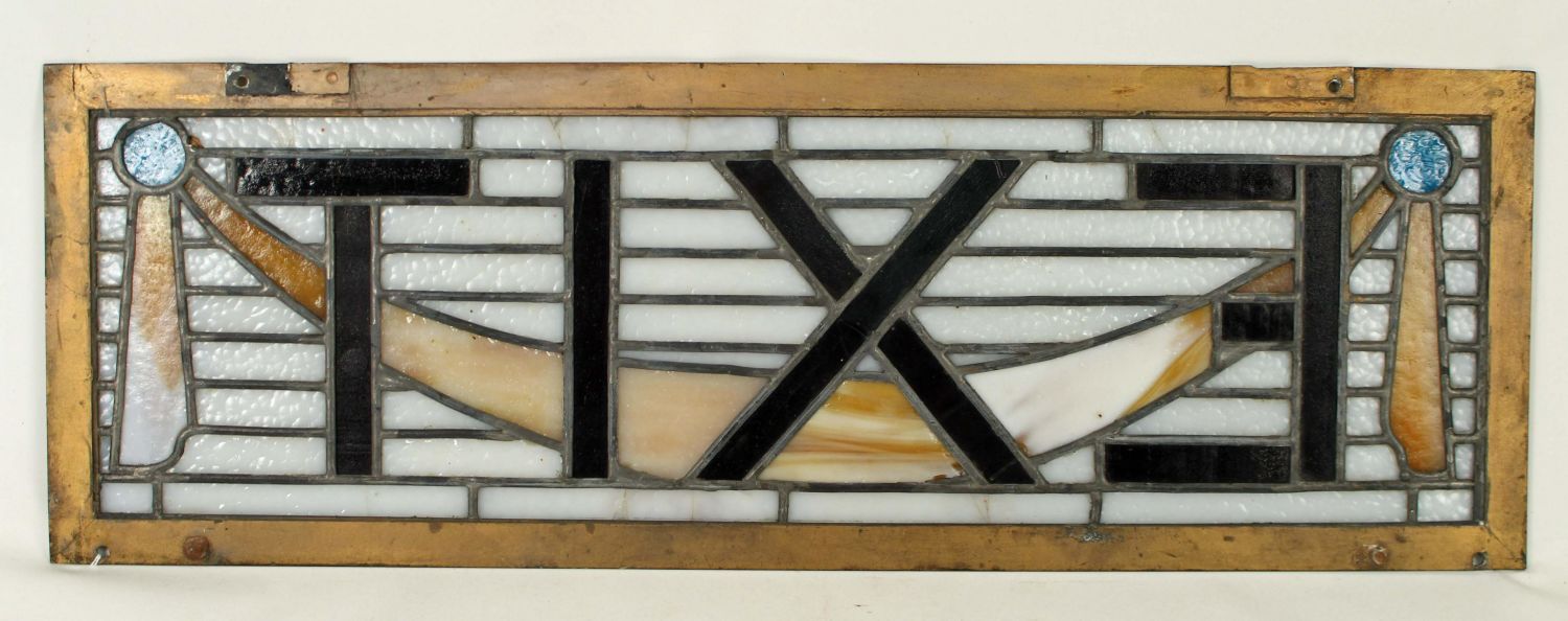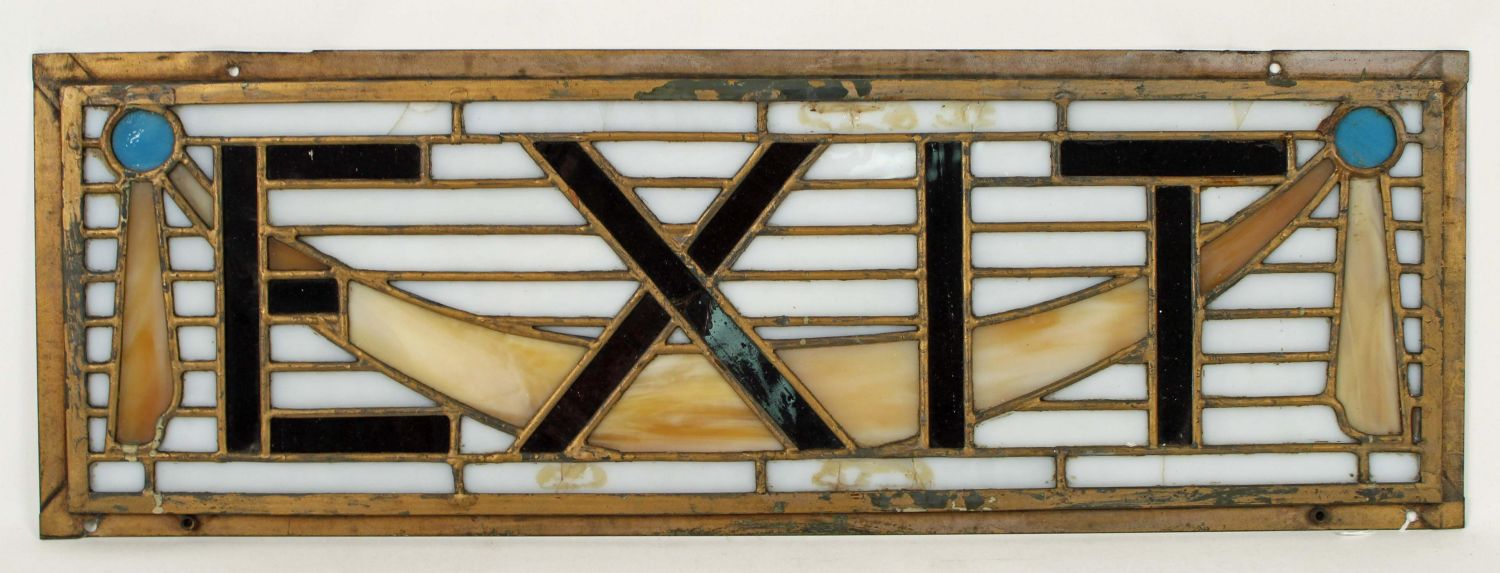 Antique Stained Glass Tiffany Style Exit Sign. Measures 8 1/8" x 24". Sign has approx. 9 cracks in the glass. See photos. Condition- Sign has approx. 9 cracks in the glass. See photos.