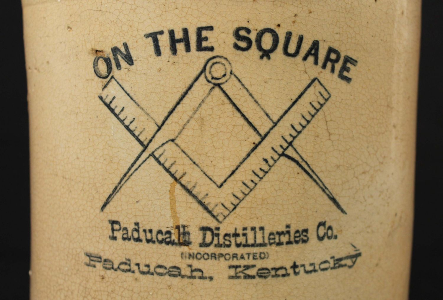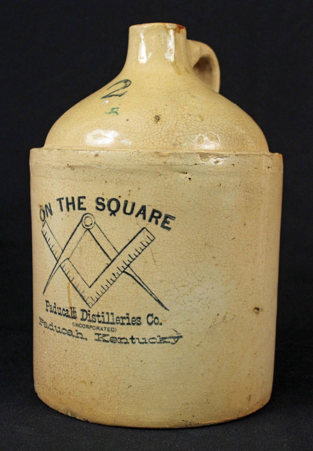 2 Gallon Paducah, KY Masonic Whiskey Jug. The jug is marked, "On the Square, Paducah Distilleries Co., Paducah, Kentucky." Measures 13 1/2" high. Condition- Jug is in good condition with some craquelure to glaze. See photos.