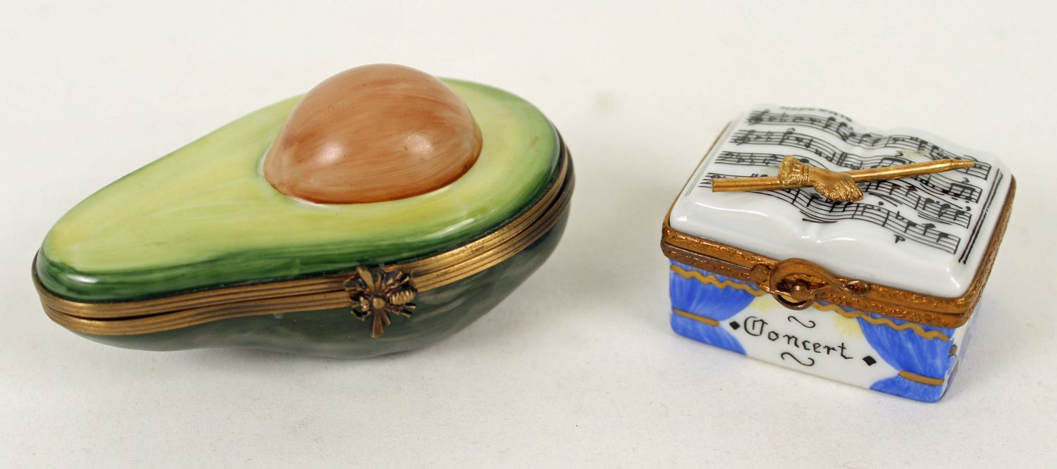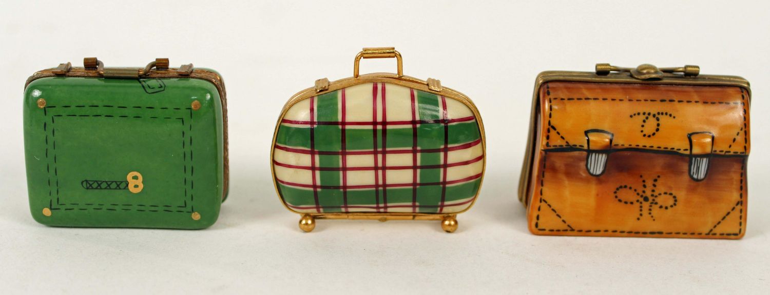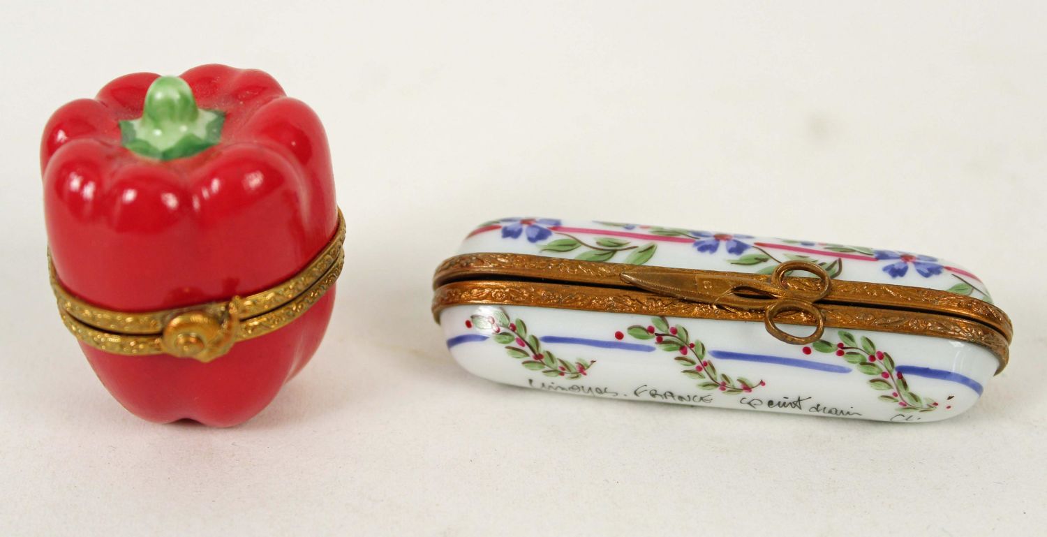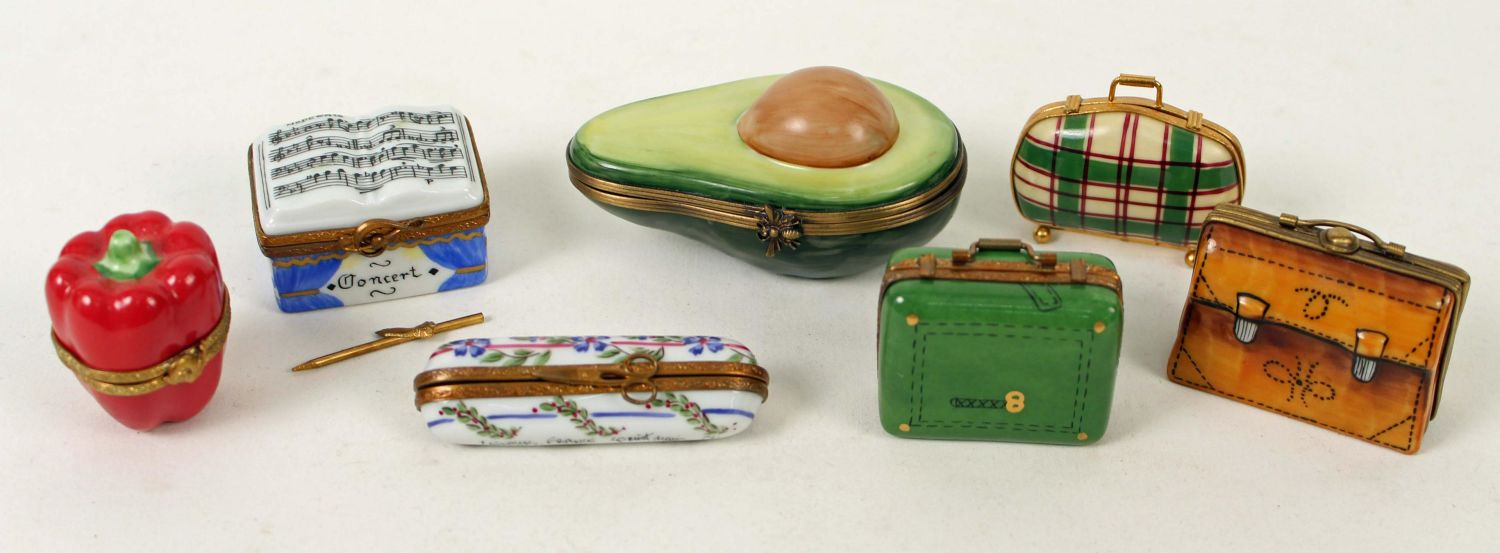 7 Peint Main Limoges Boxes, Suitcases, Etc. (1) Leather briefcase box. (1) Plaid travel case. (1) Green suitcase. (1) Needle trinket box. (1) Concerto Moderato box. (1) Red bell pepper. Measures 1 1/2 ". (1) Avocado. Measures 3" long. Every box is signed Limoges France, Peint Main. Condition- Boxes are in good condition. See photos.