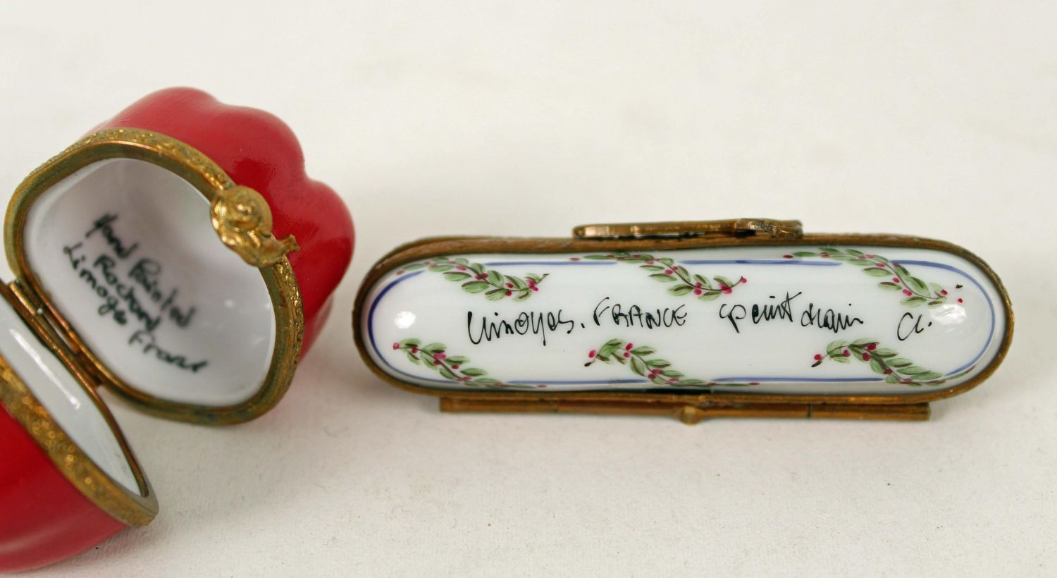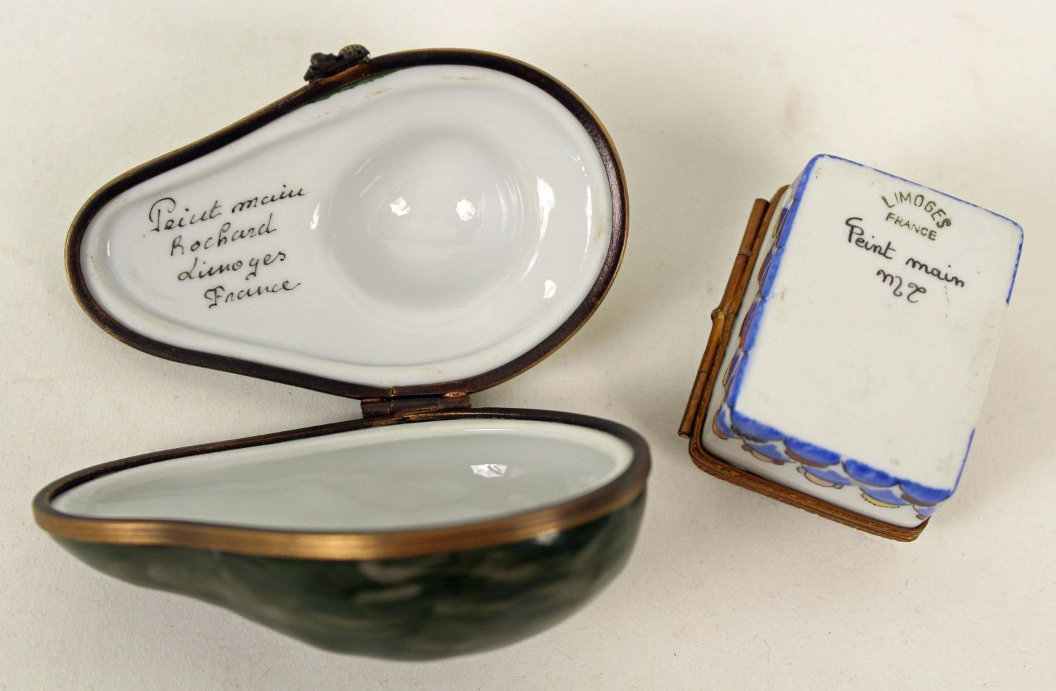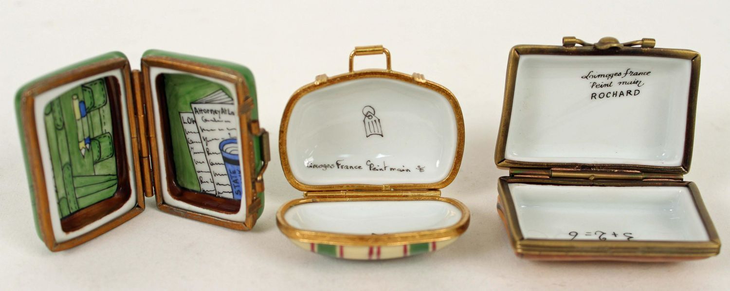 7 Peint Main Limoges Boxes, Suitcases, Etc. (1) Leather briefcase box. (1) Plaid travel case. (1) Green suitcase. (1) Needle trinket box. (1) Concerto Moderato box. (1) Red bell pepper. Measures 1 1/2 ". (1) Avocado. Measures 3" long. Every box is signed Limoges France, Peint Main. Condition- Boxes are in good condition. See photos.