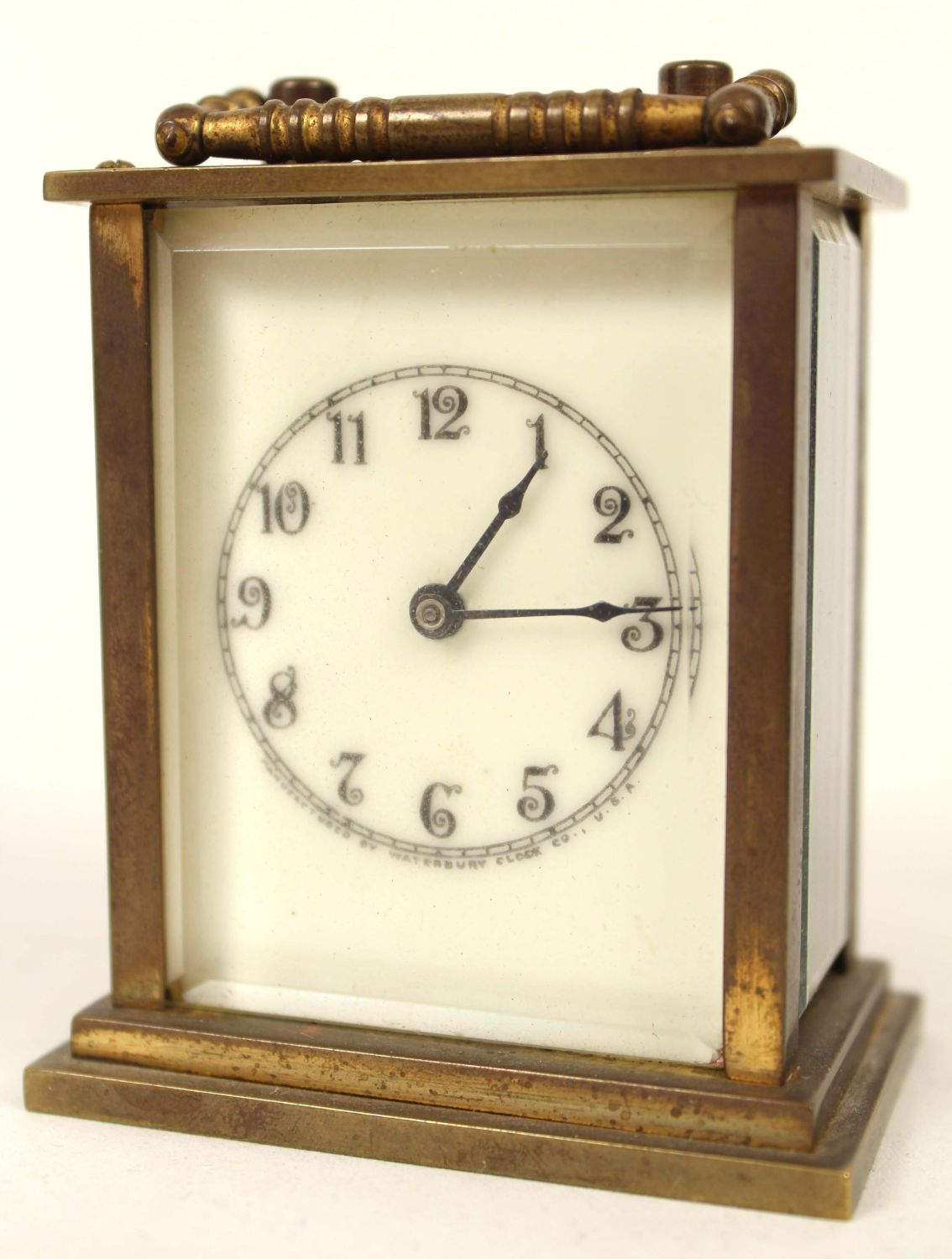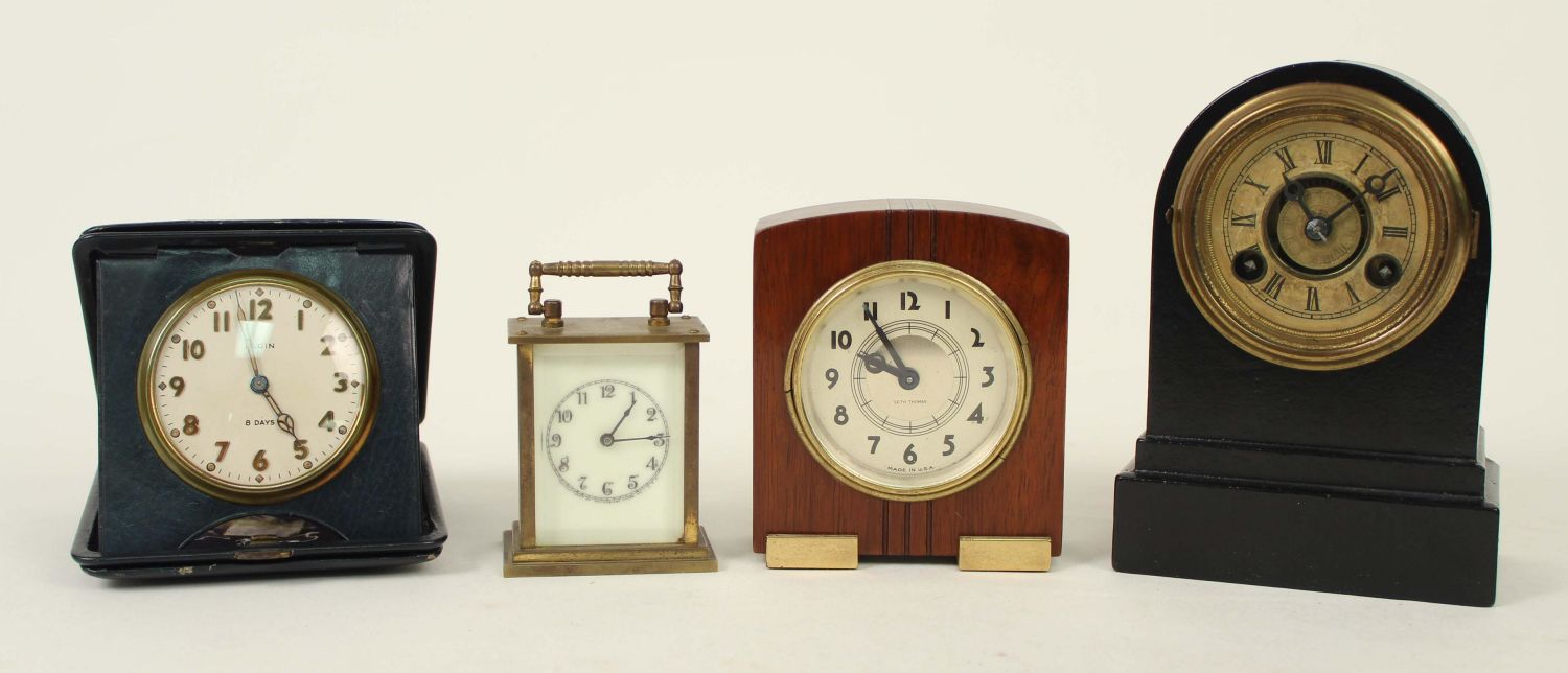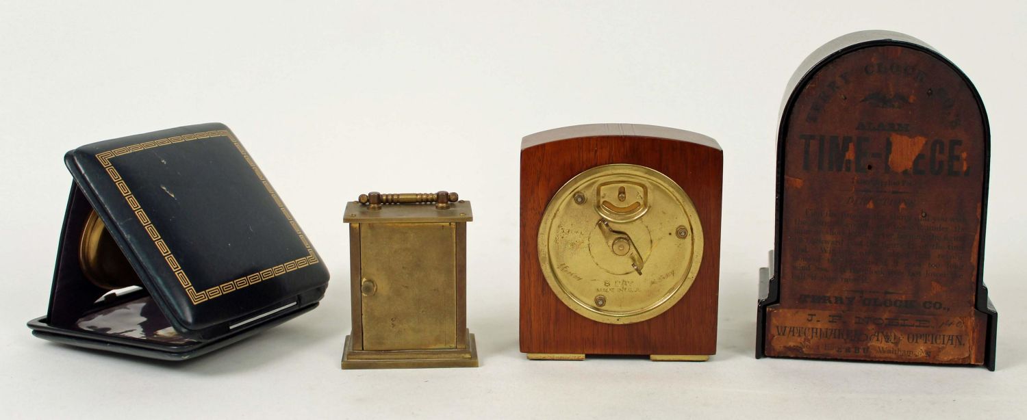 Four Small 1869 – 1950 Clocks Terry, Seth Thomas Etc.(1) Antique brass and glass Waterbury travel clock, measures 3 1/2" H. X 2 1/2" W. X 1 1/2" D. (1) Terry Clock Co. black iron alarm clock C. 1869. This clock measures 6" H. X 4 1/2" W. X 2 1/2" D. The clock has most of the original mid 19th Century label. (1) 1930’s Seth Thomas Art Deco, mahogany and gilt metal desk clock. Measures 4 1/4" H. X 3 1/2" W. X 2" D. (1) Elgin Travel clock in leather folding travel case, C. 1950. The clock looks to need repairs and does not appear to run. Measures 4" X 4 1/4". Condition – These clocks are believed to be in running order. Auction company does not guarantee the clocks to run. The clocks do not come with keys.