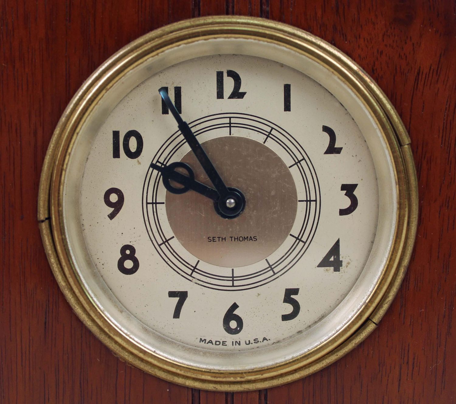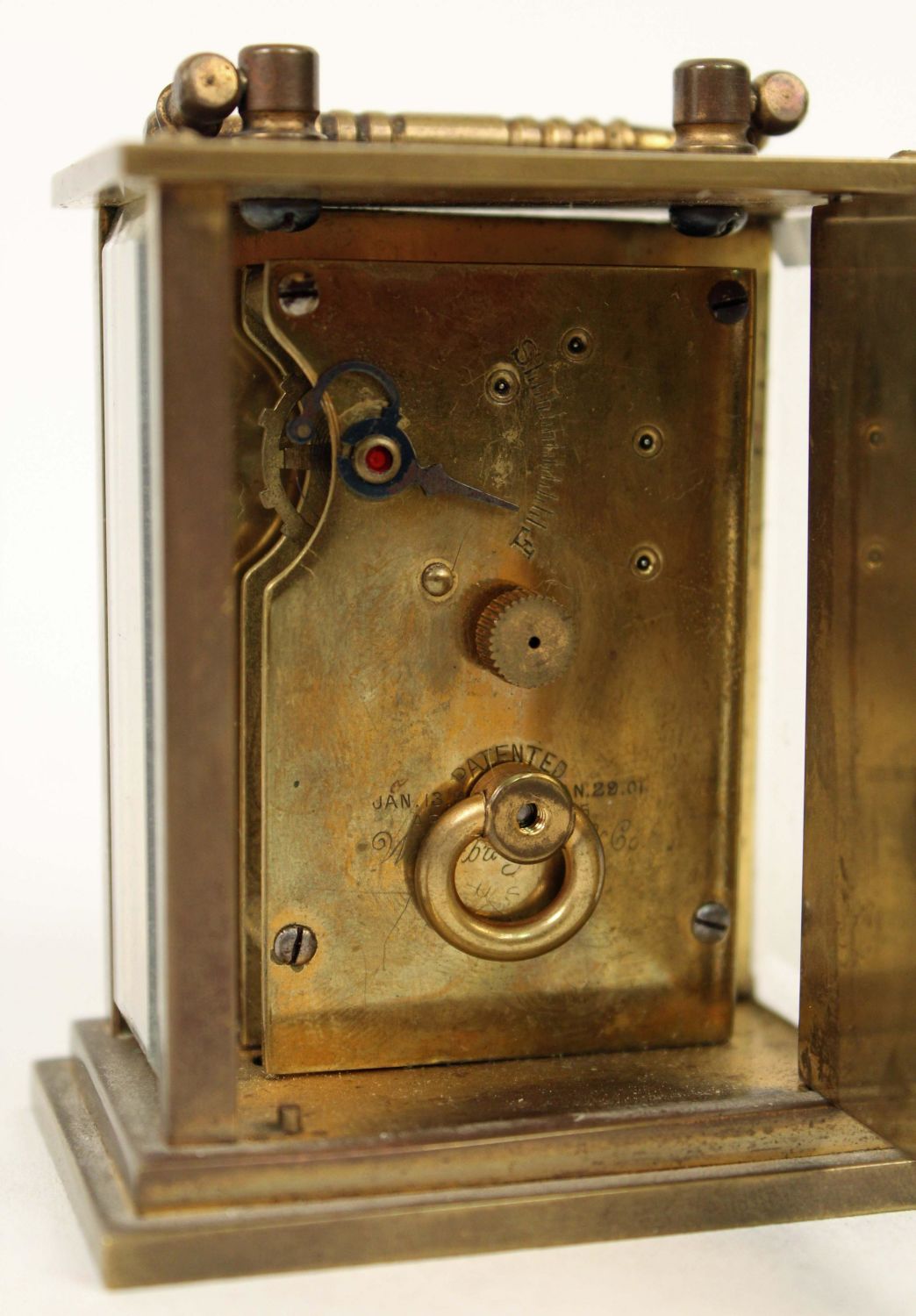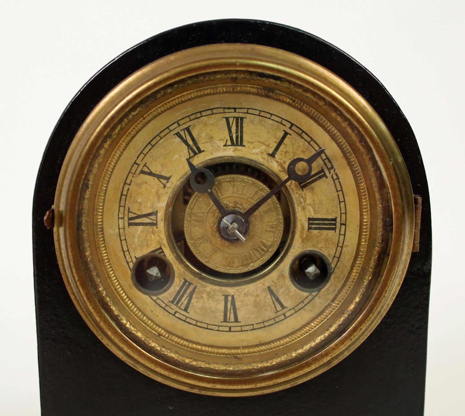 Four Small 1869 – 1950 Clocks Terry, Seth Thomas Etc.(1) Antique brass and glass Waterbury travel clock, measures 3 1/2" H. X 2 1/2" W. X 1 1/2" D. (1) Terry Clock Co. black iron alarm clock C. 1869. This clock measures 6" H. X 4 1/2" W. X 2 1/2" D. The clock has most of the original mid 19th Century label. (1) 1930’s Seth Thomas Art Deco, mahogany and gilt metal desk clock. Measures 4 1/4" H. X 3 1/2" W. X 2" D. (1) Elgin Travel clock in leather folding travel case, C. 1950. The clock looks to need repairs and does not appear to run. Measures 4" X 4 1/4". Condition – These clocks are believed to be in running order. Auction company does not guarantee the clocks to run. The clocks do not come with keys.