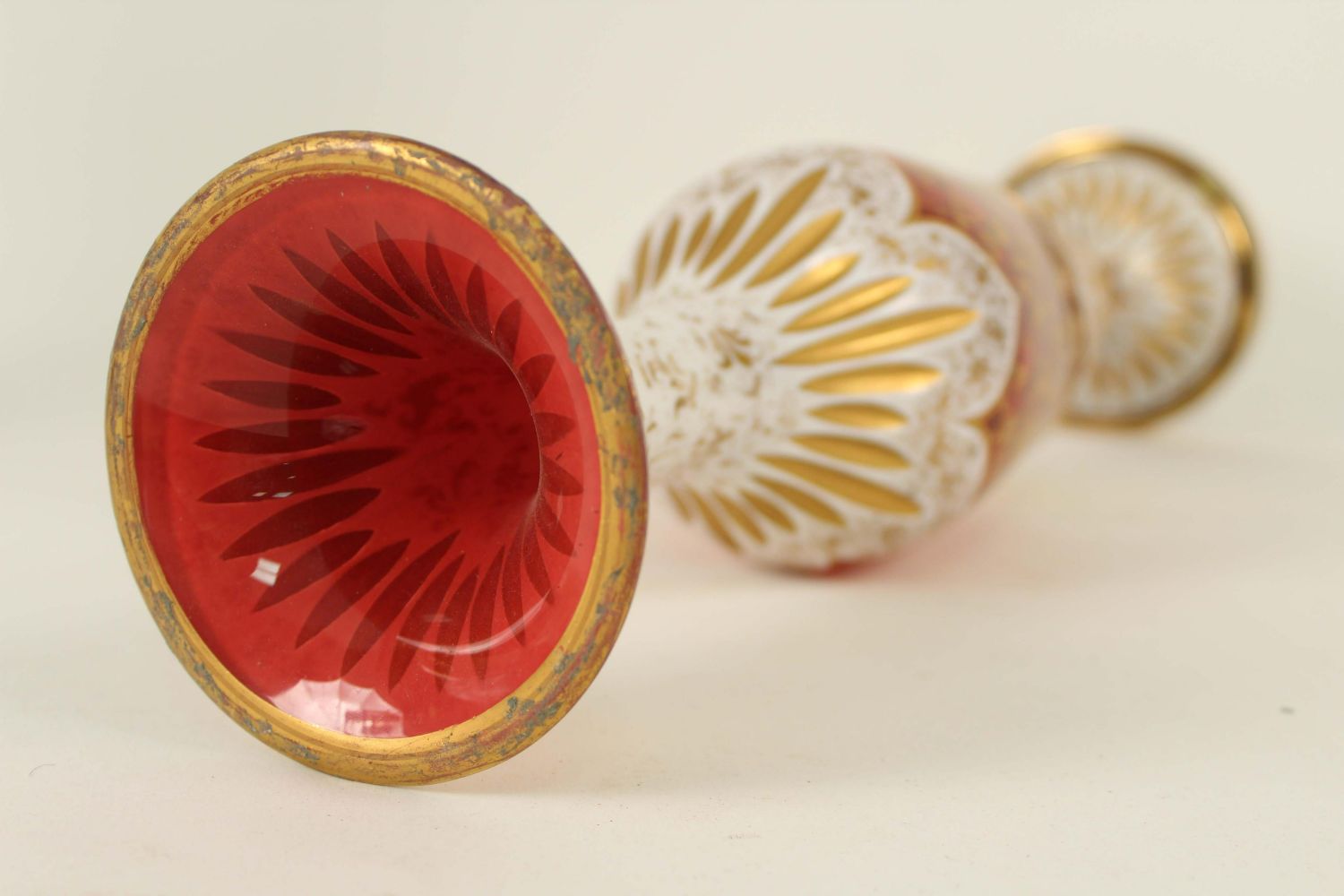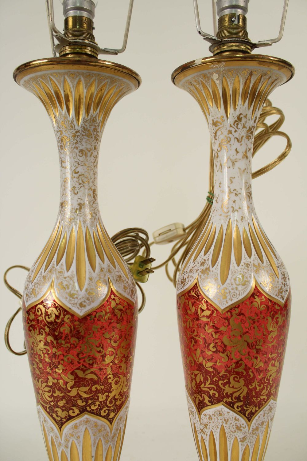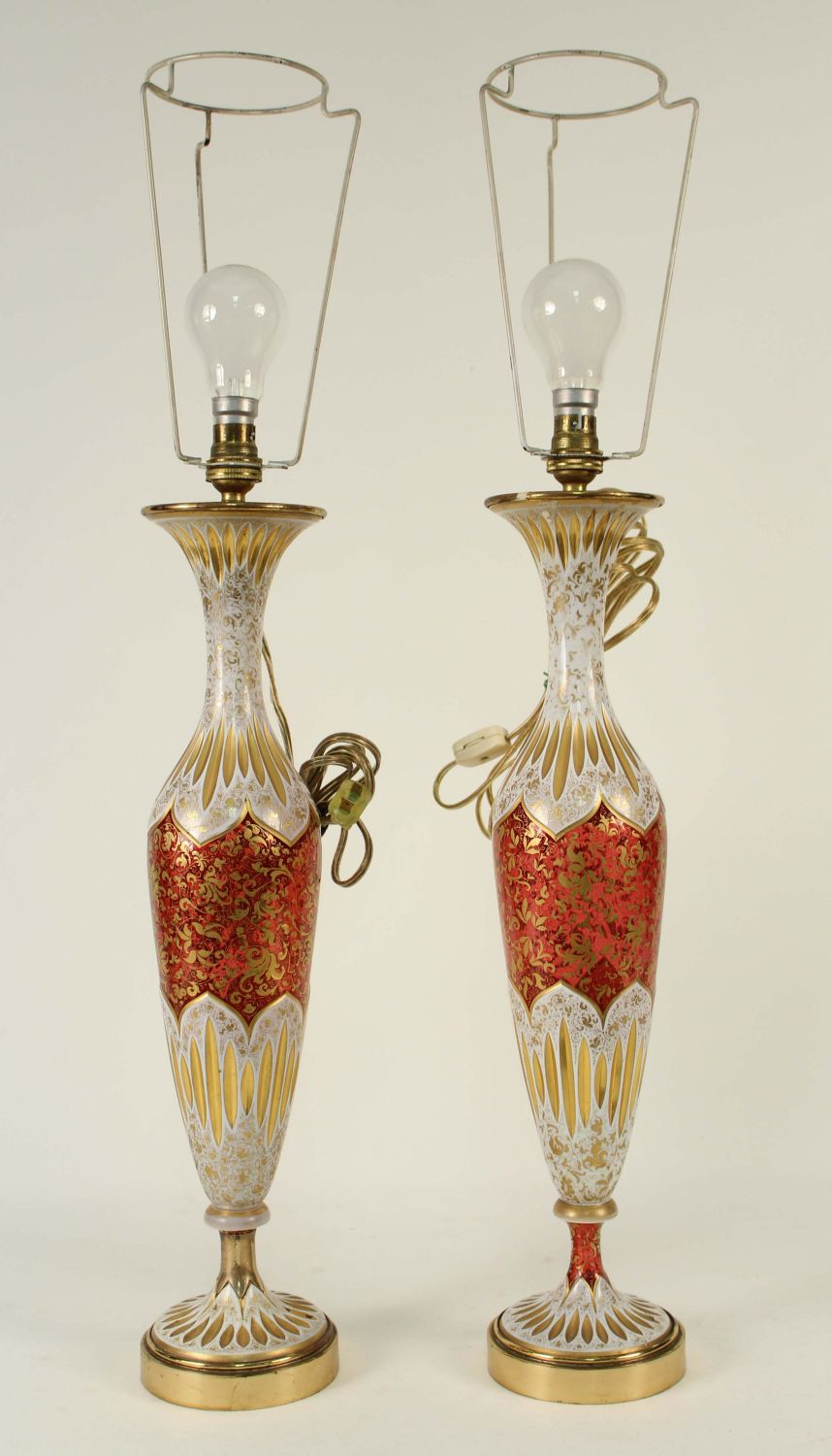 Pair of Bohemian White Cut To Cranberry Glass Vases with Gilt Decoration. The vases are profusely decorated in a Moser style. The vases measure 18 3/4" H. Both vase have gold plated bases attached. One lamp has a fitter attached (Unknown Adhesive) to the top for lamp with socket and shade bracket. The lamp fitting for the second lamp is no longer attached to vase. One vase lower stem has a damage repair with a scalloped collar. (See Photos). The lamps come with two older shades with some damage. Condition – Good over condition with the following exceptions. Both vase have gold plated bases attached. One lamp has a fitter attached (Unknown Adhesive) to the top for lamp with socket and shade bracket. The lamp fitting for the second lamp is no longer attached to vase. One vase lower stem has a damage repair with a scalloped collar. (See Photos). The lamps come with two older shades with some damage.