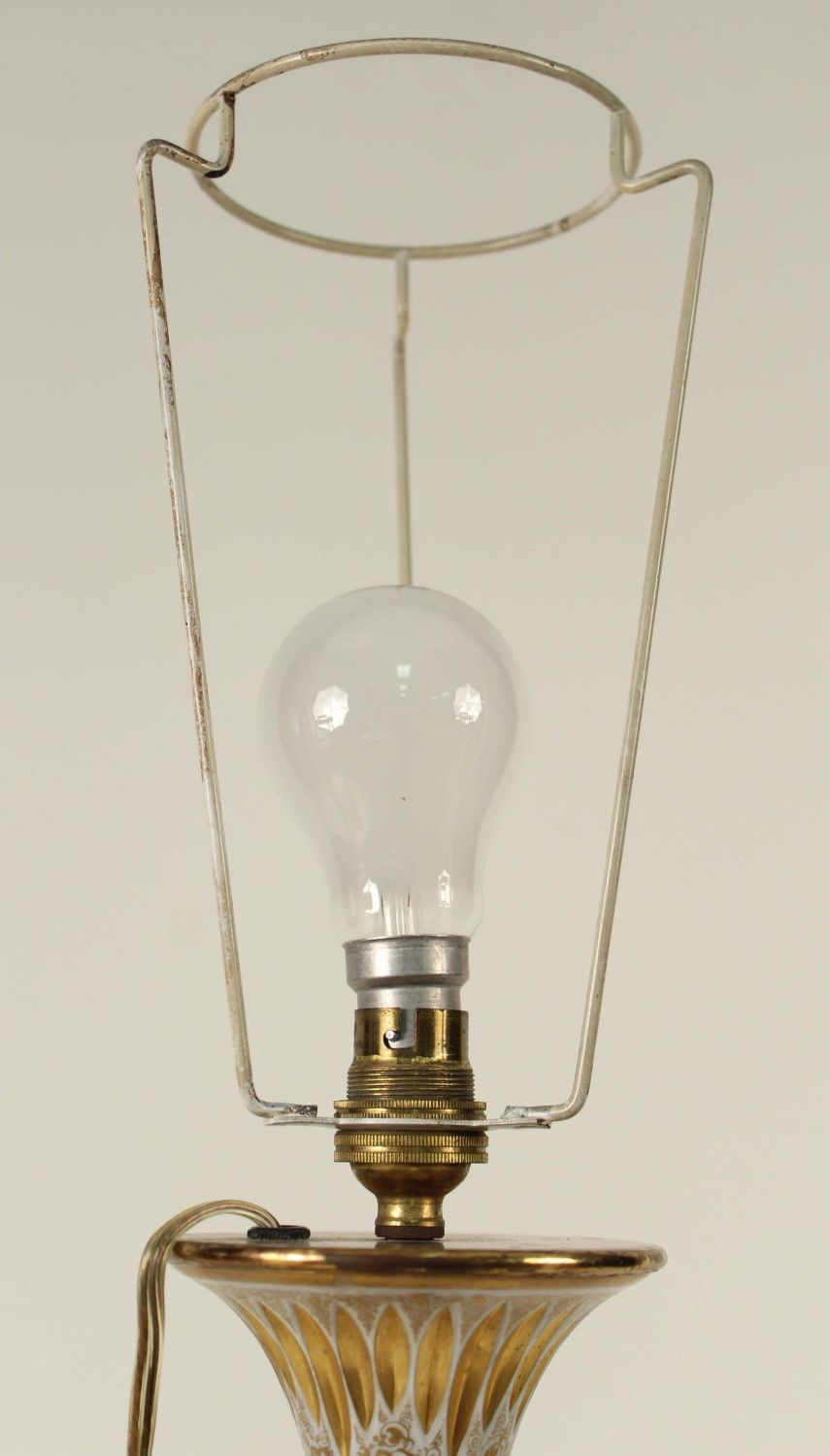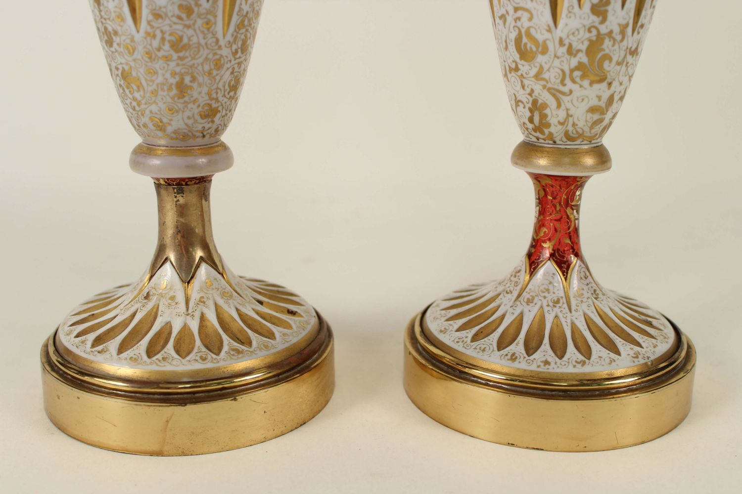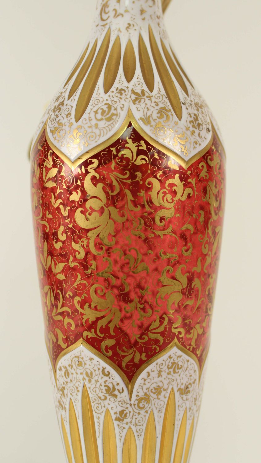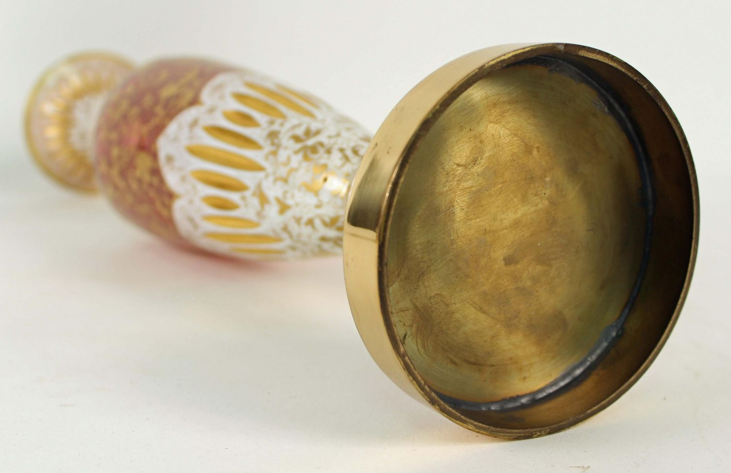 Pair of Bohemian White Cut To Cranberry Glass Vases with Gilt Decoration. The vases are profusely decorated in a Moser style. The vases measure 18 3/4" H. Both vase have gold plated bases attached. One lamp has a fitter attached (Unknown Adhesive) to the top for lamp with socket and shade bracket. The lamp fitting for the second lamp is no longer attached to vase. One vase lower stem has a damage repair with a scalloped collar. (See Photos). The lamps come with two older shades with some damage. Condition – Good over condition with the following exceptions. Both vase have gold plated bases attached. One lamp has a fitter attached (Unknown Adhesive) to the top for lamp with socket and shade bracket. The lamp fitting for the second lamp is no longer attached to vase. One vase lower stem has a damage repair with a scalloped collar. (See Photos). The lamps come with two older shades with some damage.