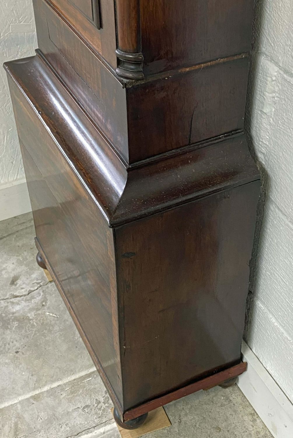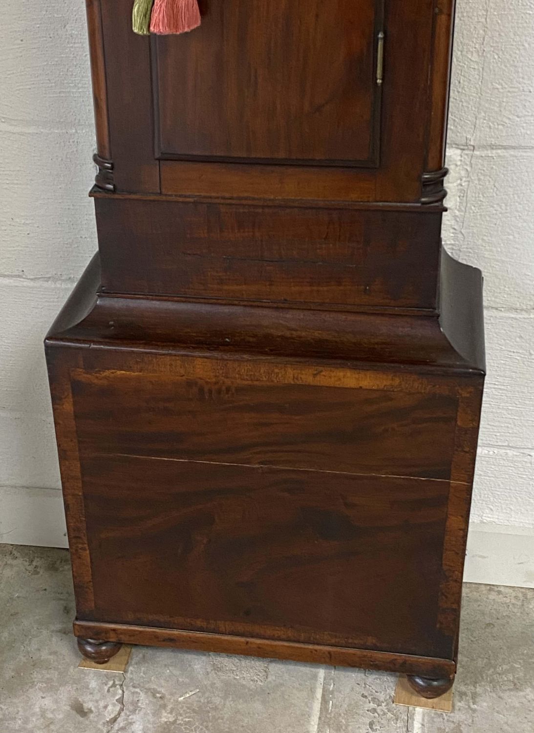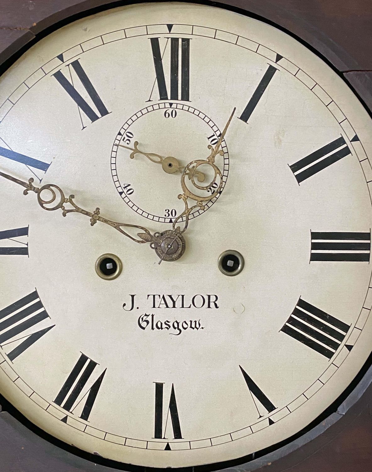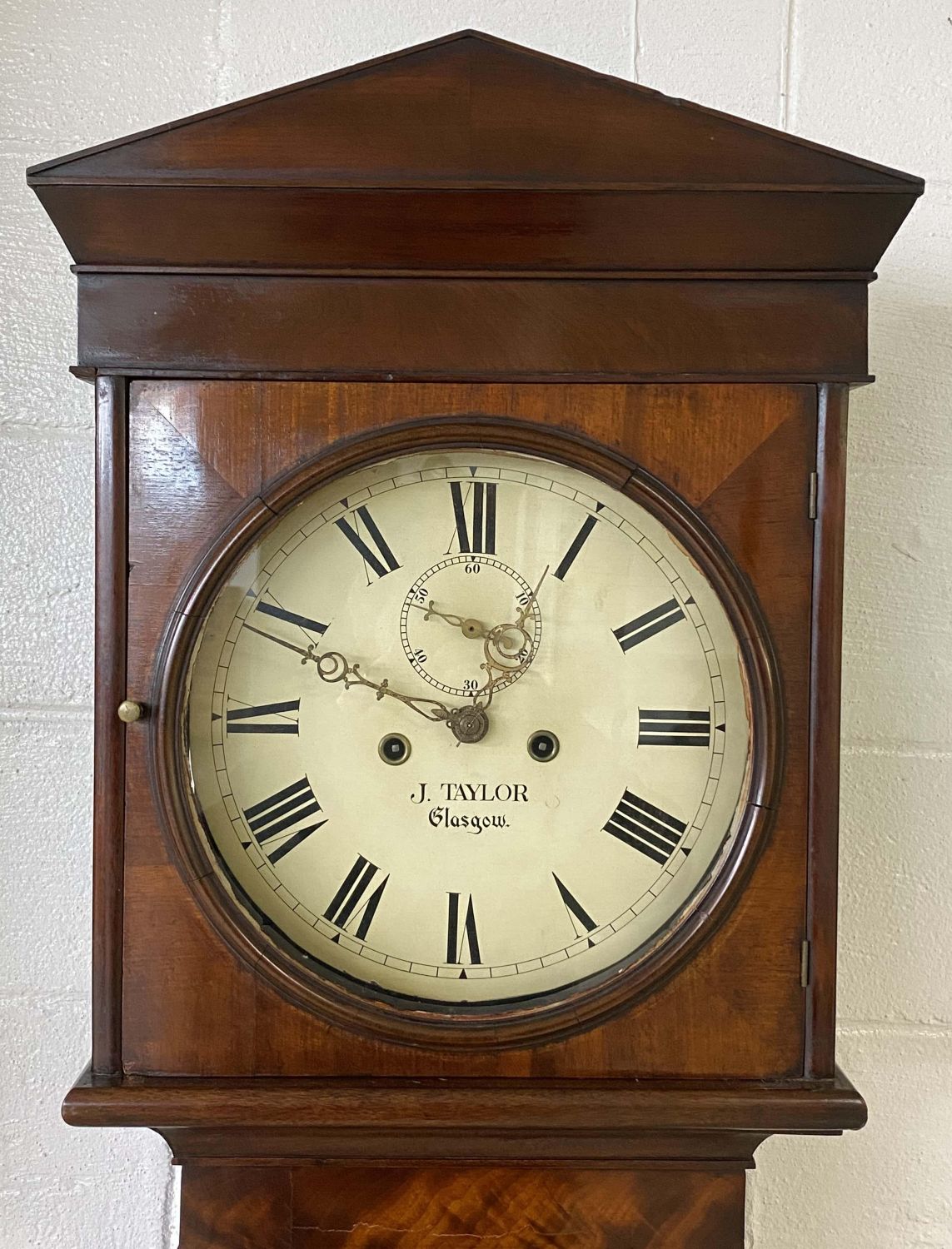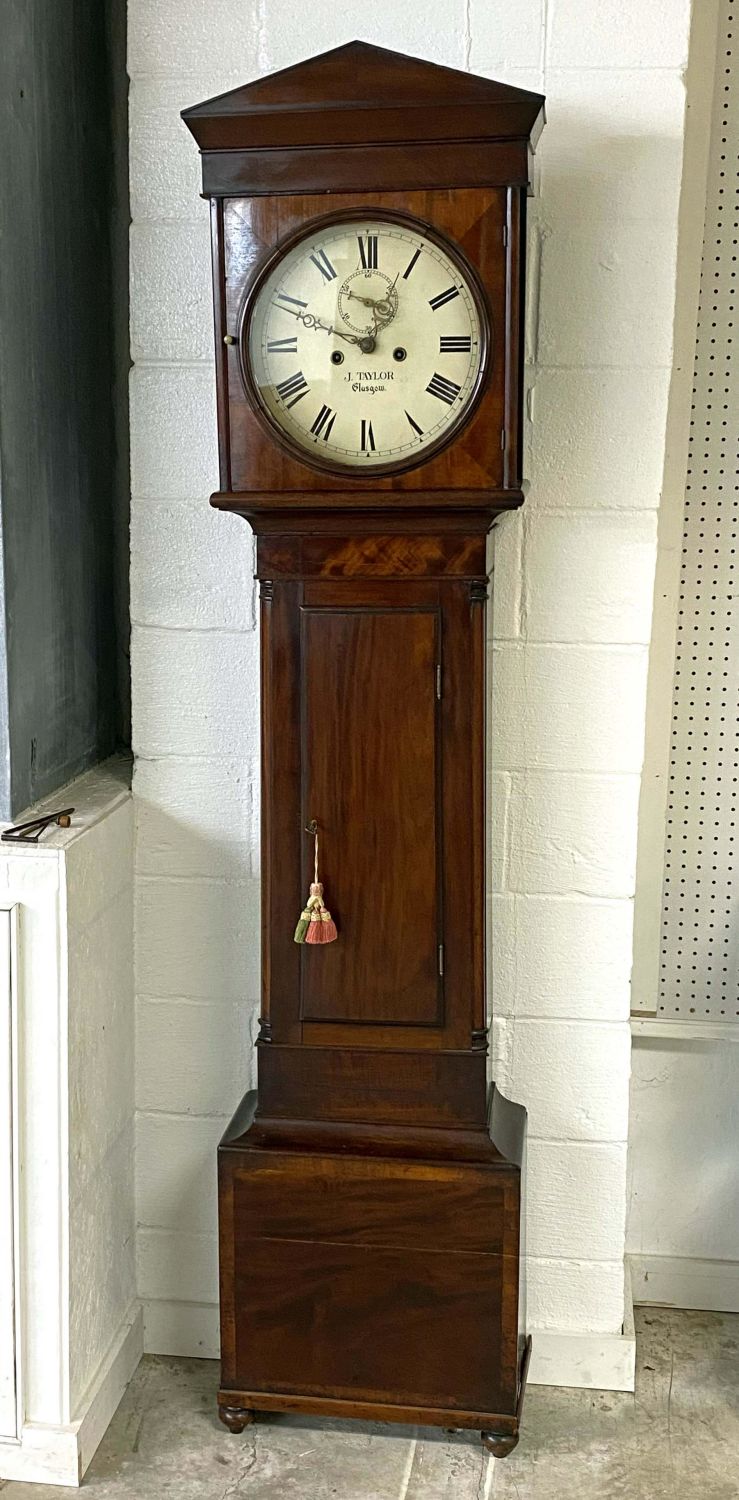 Scottish Tall Case Clock, Early 19th Century. The dial is signed J. Taylor, Glasgow. Mahogany case with time and strike. The clock has a gilt and polychrome metal pendulum with two heavy steel weights. Measures 80" H. X 19" W. X 9" D. Condition – Very nice mahogany case with some old repairs, minor flaws and separations. Believed to possibly be in running order. Clocks of this age very often require setup by a professional. Auction company does not guarantee this clock to run. Does come with a key. Believed to be in running order. Auction company does not guarantee this clock to run. Does come with a key and pendulum.