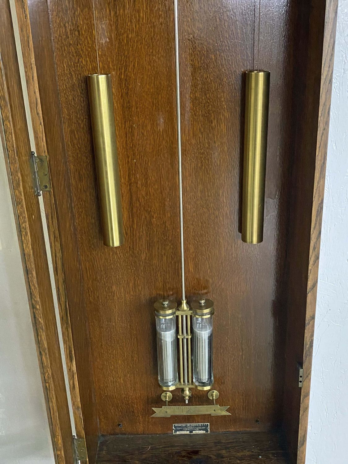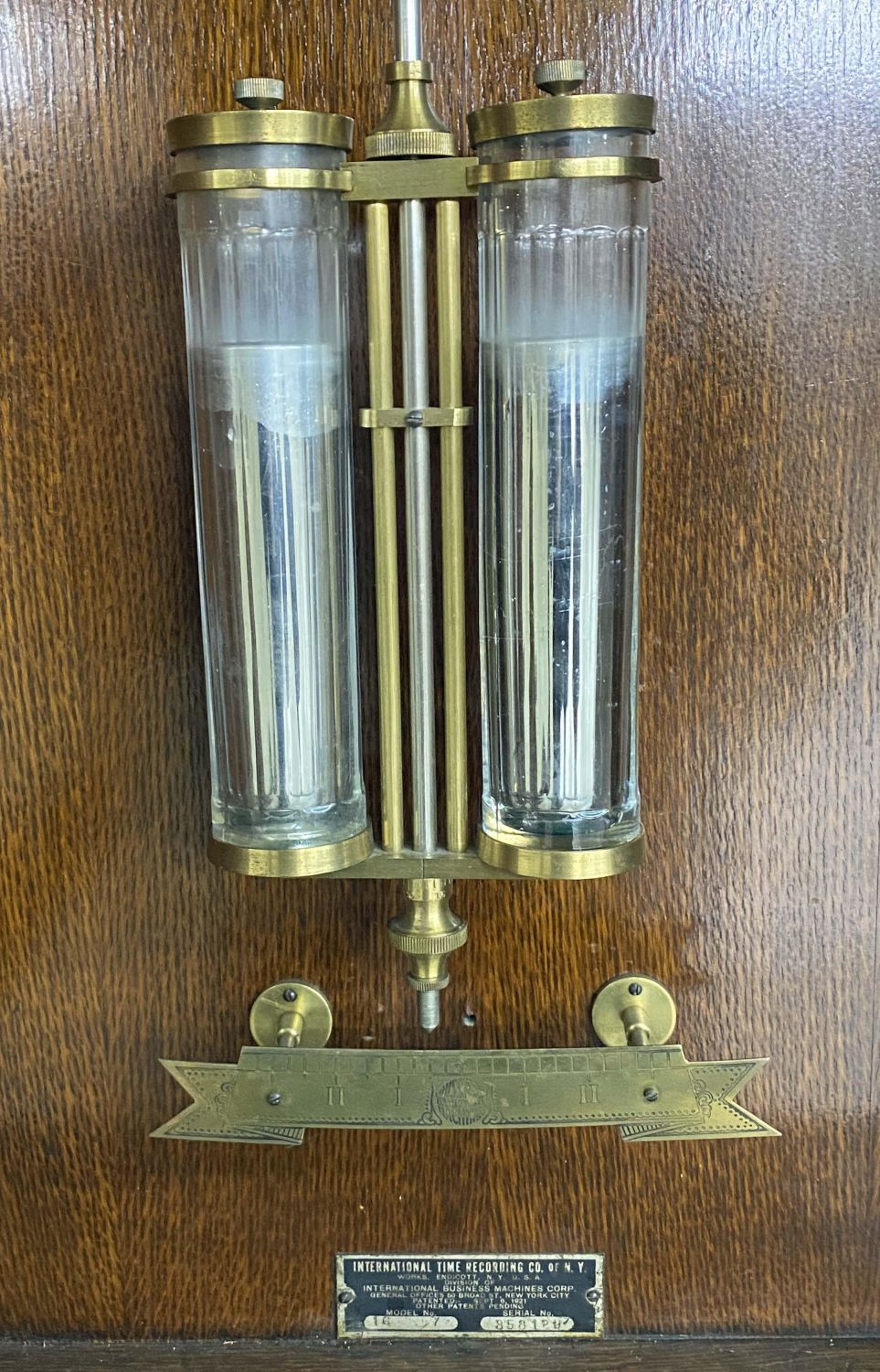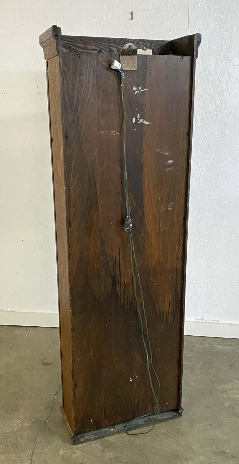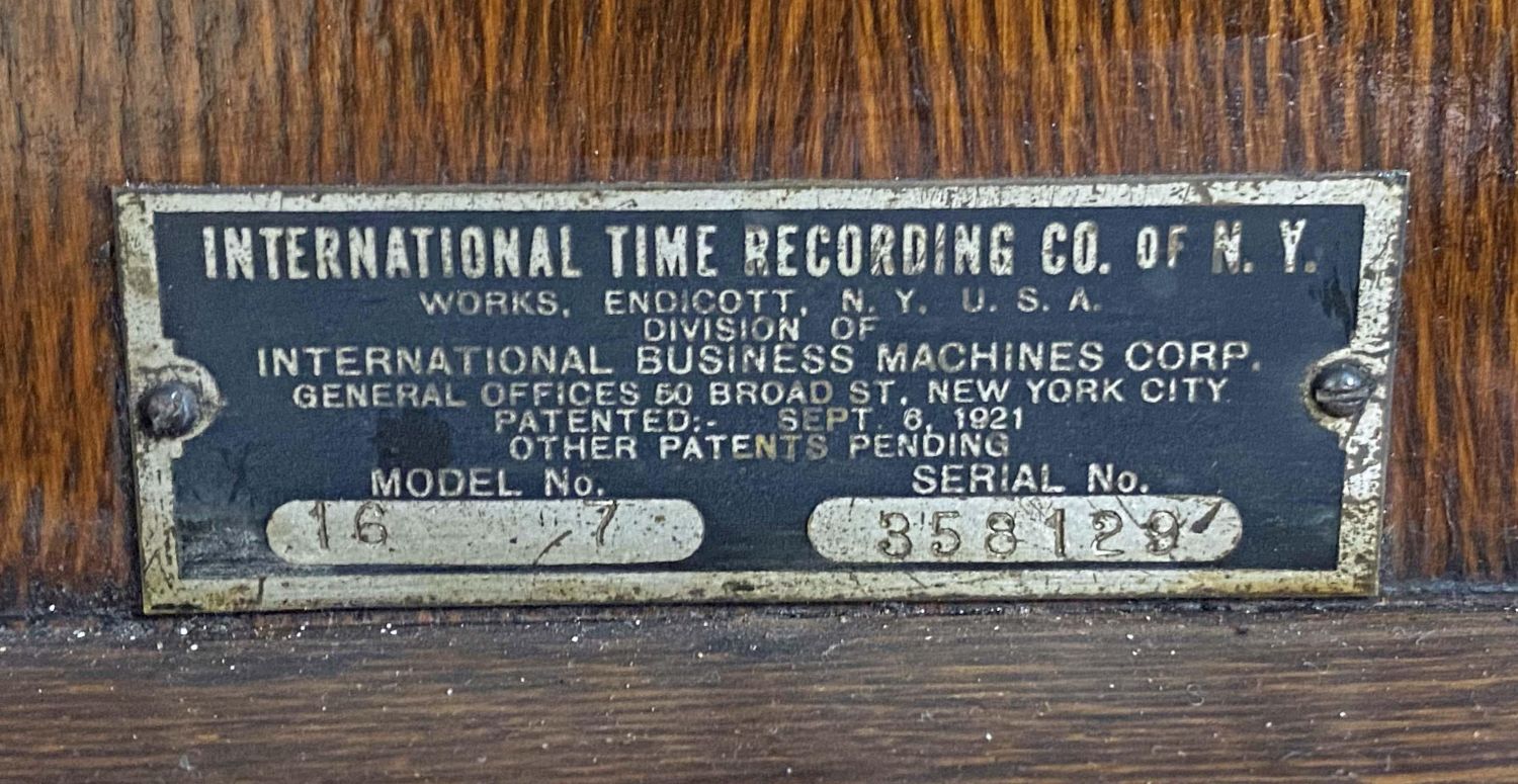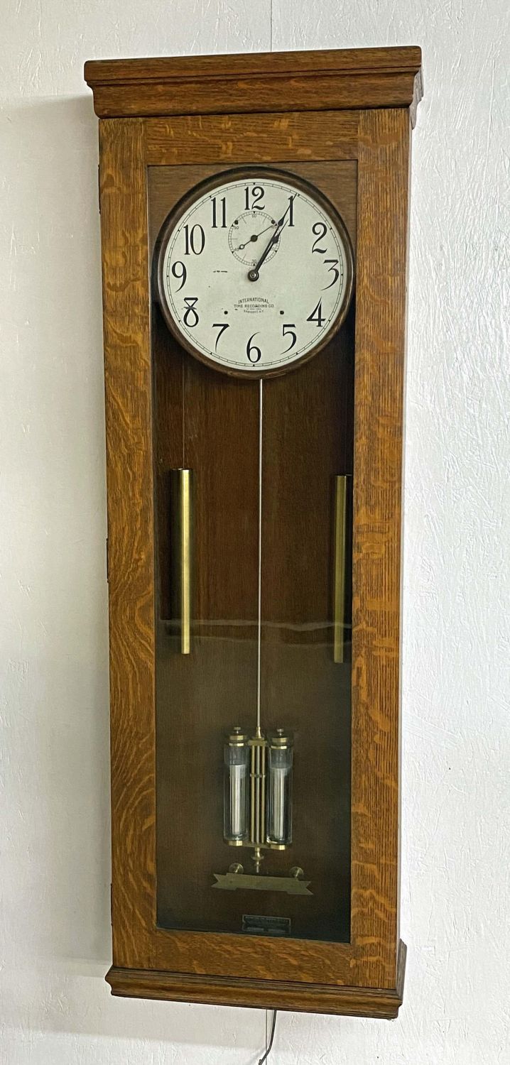 International Time Recording Model 16, Circa 1930 . One of the most accurate time clocks available at the time. The #16 was commissioned by the Santa Fe Railroad. The clock has the original GE electric motor and is a self winding electric weight clock. The clock self winds every two to three days and is accurate to within 10 seconds per month. The oak cased clock measures 62 3/4" high x 21" wide x 8 3/8" deep. This clock will not be sold to international buyers or buyers located in states, municipalities Etc. that prohibit the sale or importation of Mercury. The presence of mercury in this lot will require the winning buyer or buyer’s agent to pick up the clock at our auction house. We will not ship this clock. Auctioneers have not attempted to test or start the clock. Condition – Believed to be in running order. The clock was running when removed from home. Auctioneers have not attempted to test or start the clock. Auction company does not guarantee this clock to run. Does come with a key. This clock will not be sold to international buyers or buyers located in states, municipalities Etc. that prohibit the sale or importation of Mercury. The presence of mercury in this lot will require the winning buyer or buyer’s agent to pick up the clock at our auction house. We will not ship this clock.