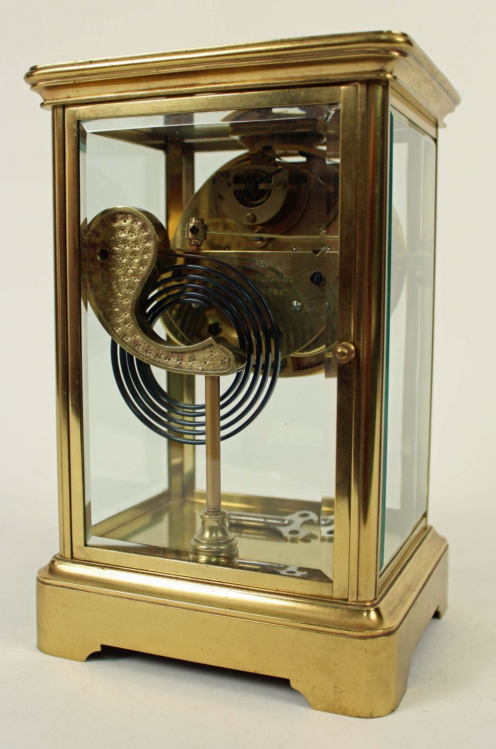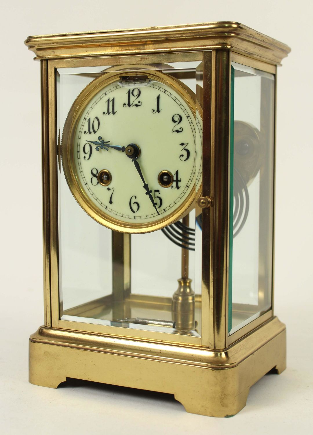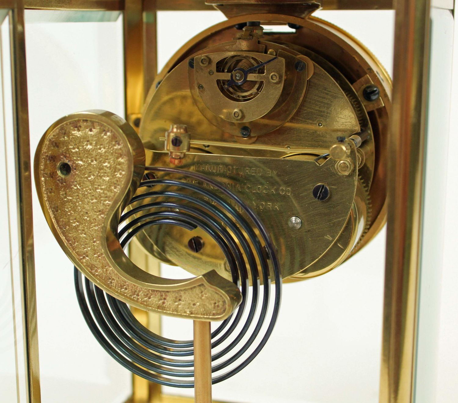 Ansonia Crystal Regulator Clock. Brass case with beveled glass doors and panels. The clock runs and keeps time. This clock does not appear to need a pendulum. Comes with winding key. Measures 9 3/4" H. X 6 1/4" W. X 5 1/4" D. Condition – Good condition. The back door glass has a chip in the upper right corner. See Photos.