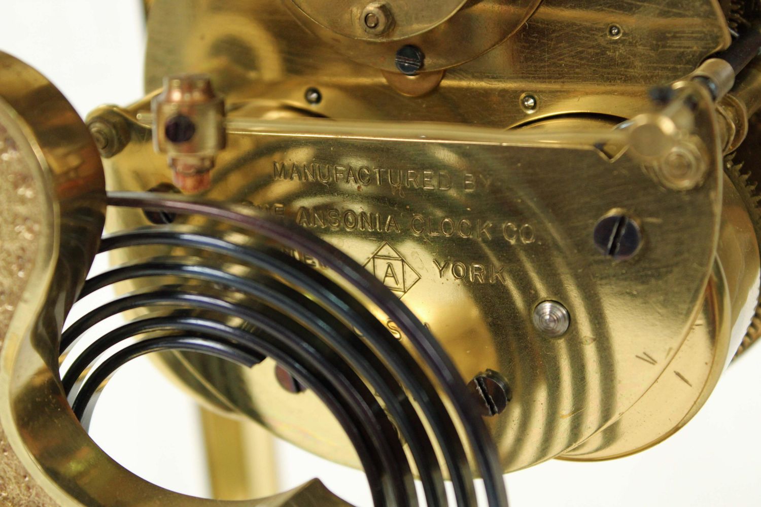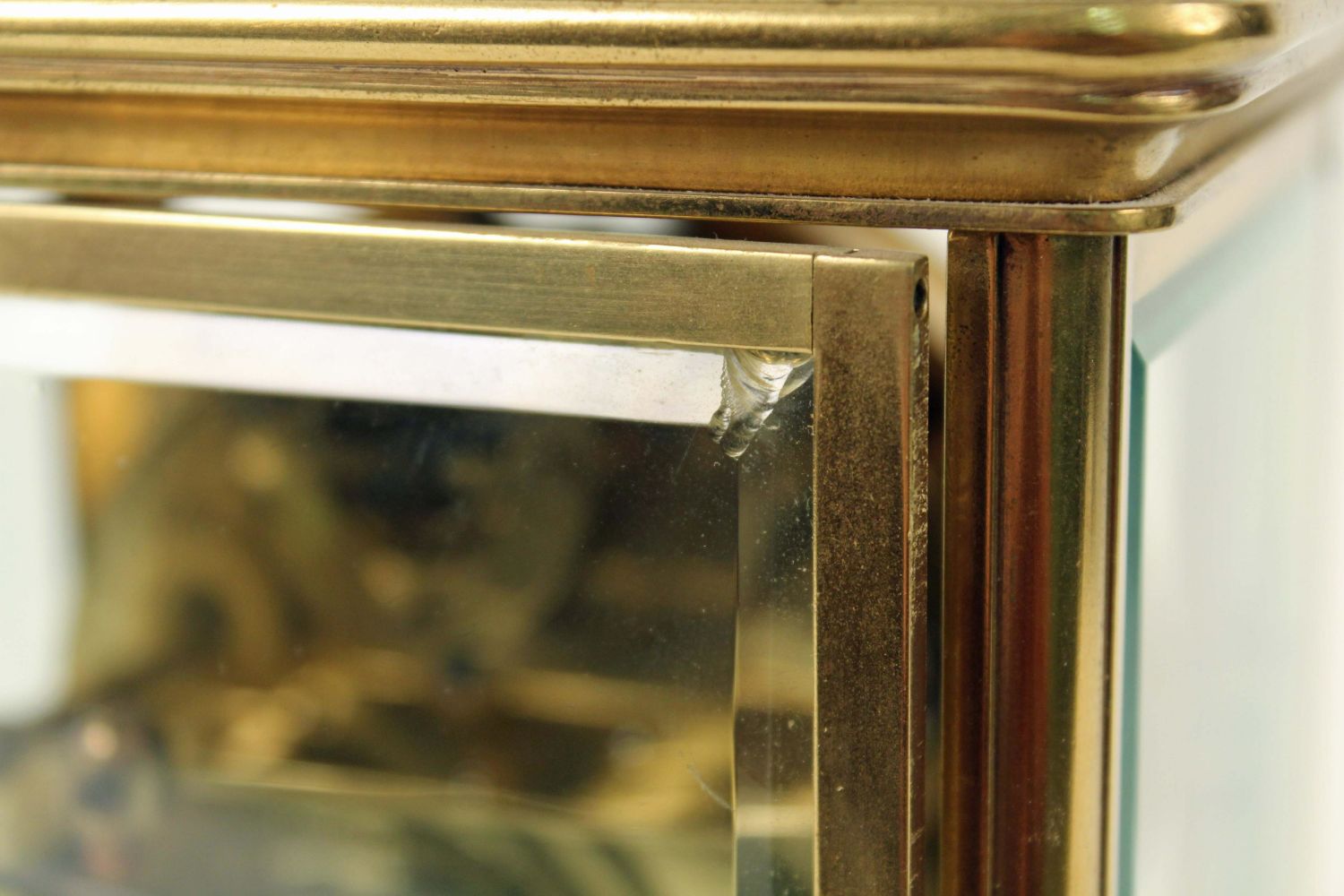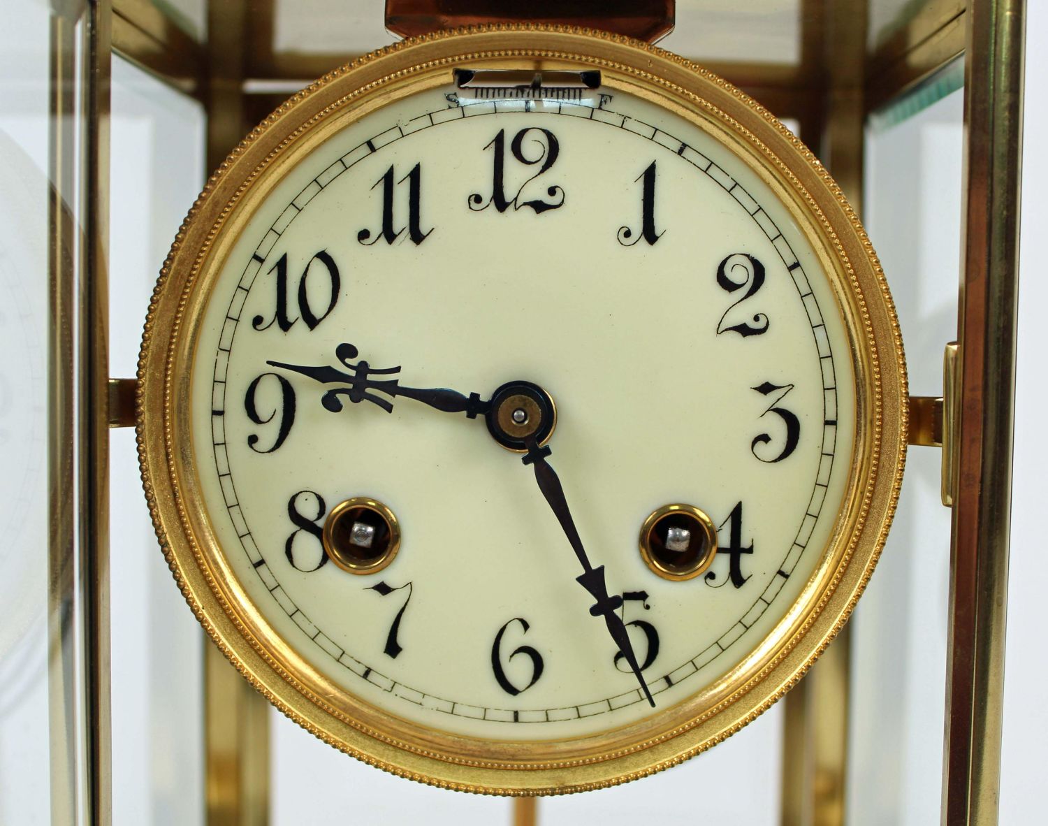 Ansonia Crystal Regulator Clock. Brass case with beveled glass doors and panels. The clock runs and keeps time. This clock does not appear to need a pendulum. Comes with winding key. Measures 9 3/4" H. X 6 1/4" W. X 5 1/4" D. Condition – Good condition. The back door glass has a chip in the upper right corner. See Photos.
