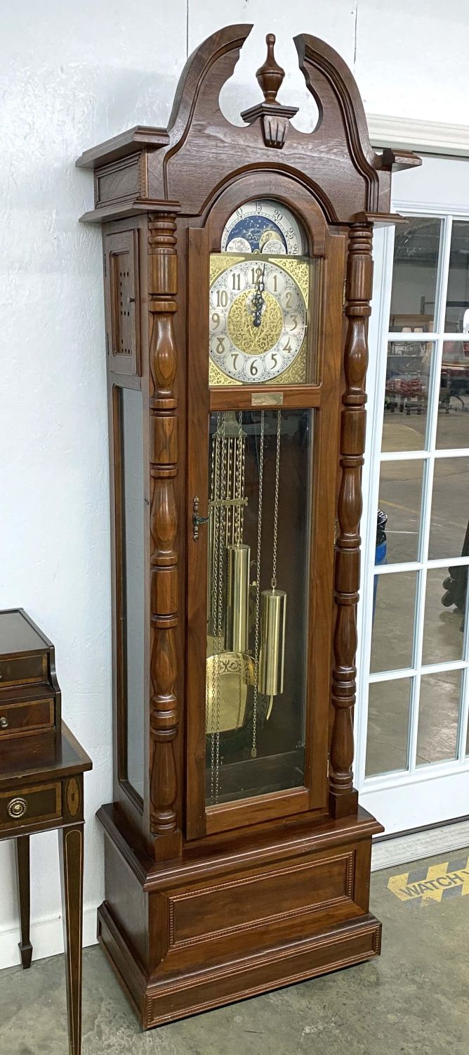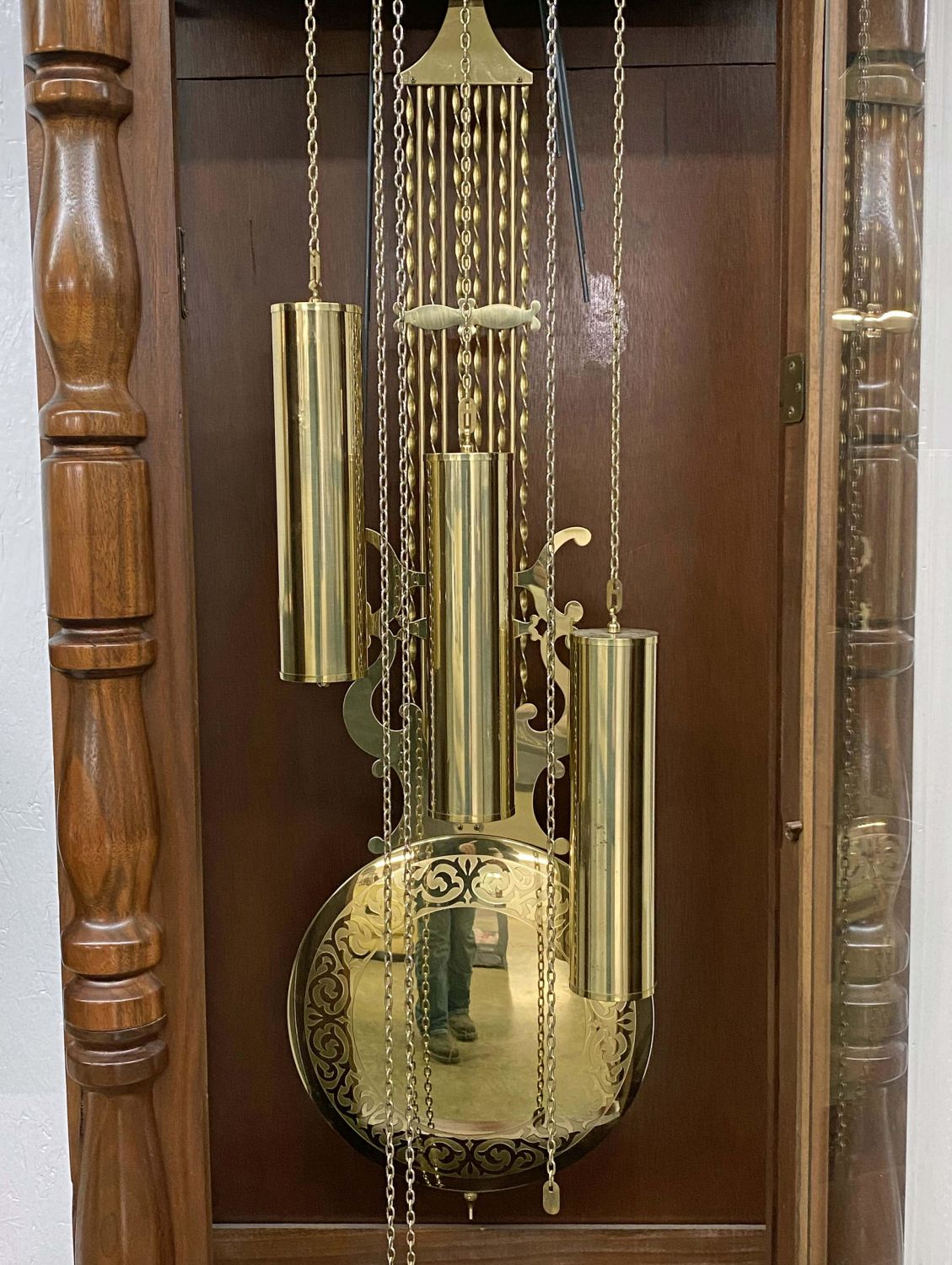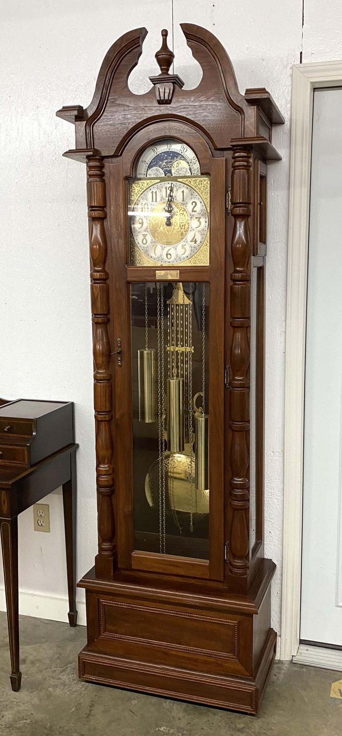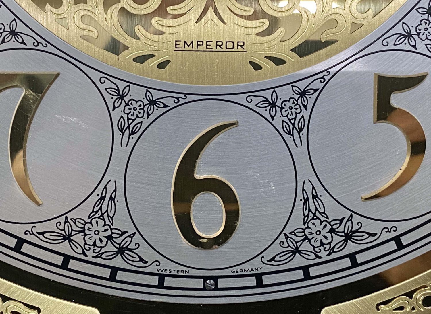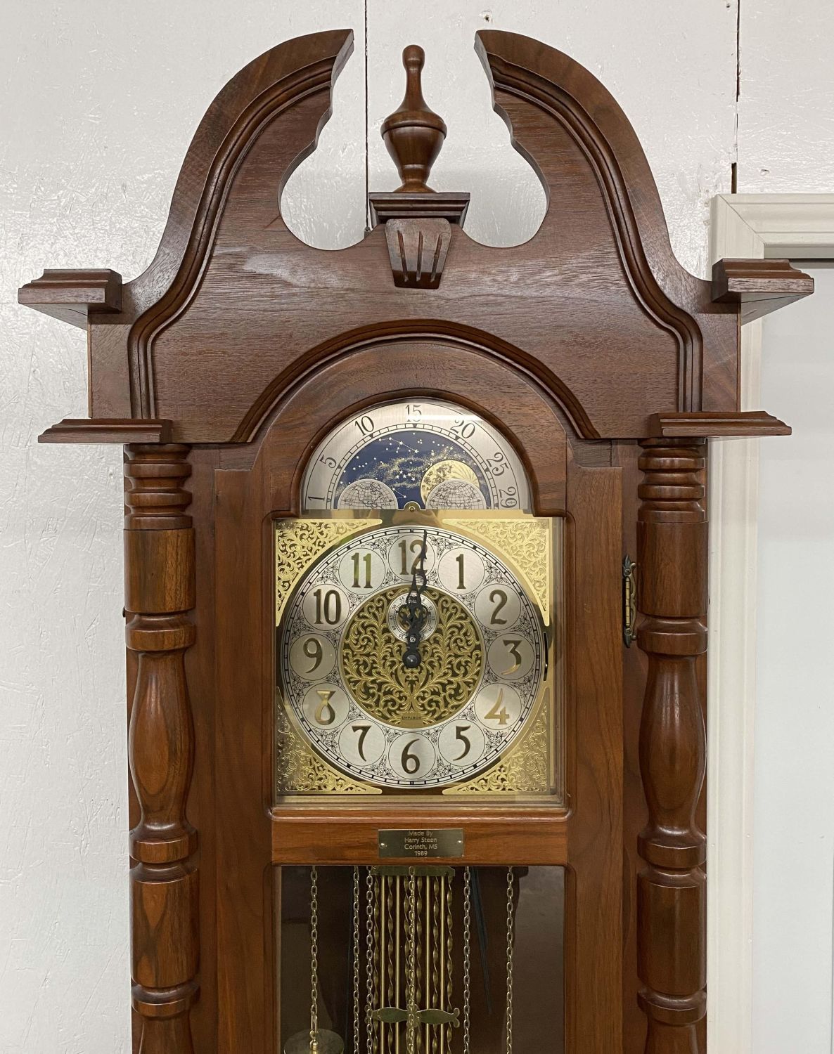 Emperor West German Grandfather Clock with Custom Built Walnut Case by Harry Steen, Corinth, Mississippi 1989. The clock has three weights, large brass pendulum, engraved brass name plate and custom case. The clock measures 83 1/2" H. X 25 1/2" W. X 13 1/2" Deep. Condition – The clock runs and keeps time. Case is in good condition.