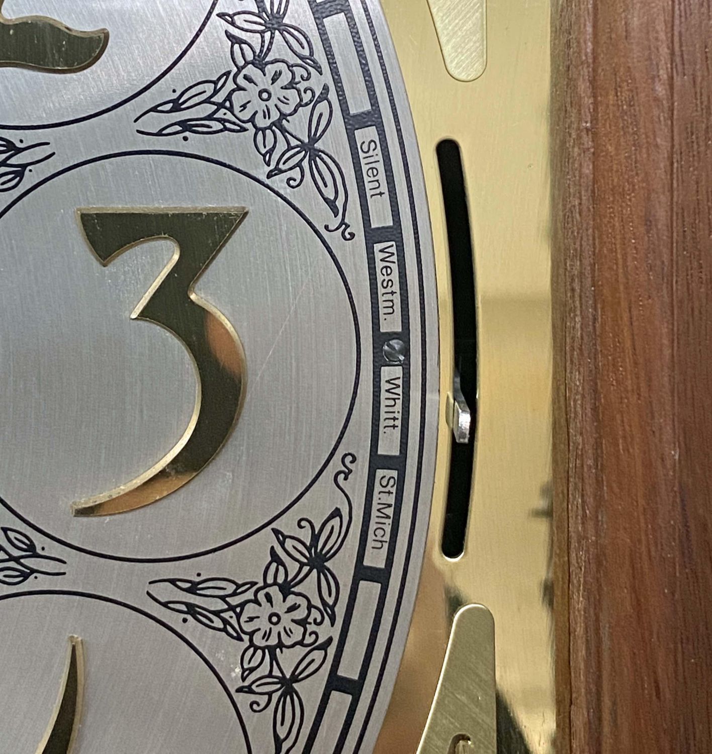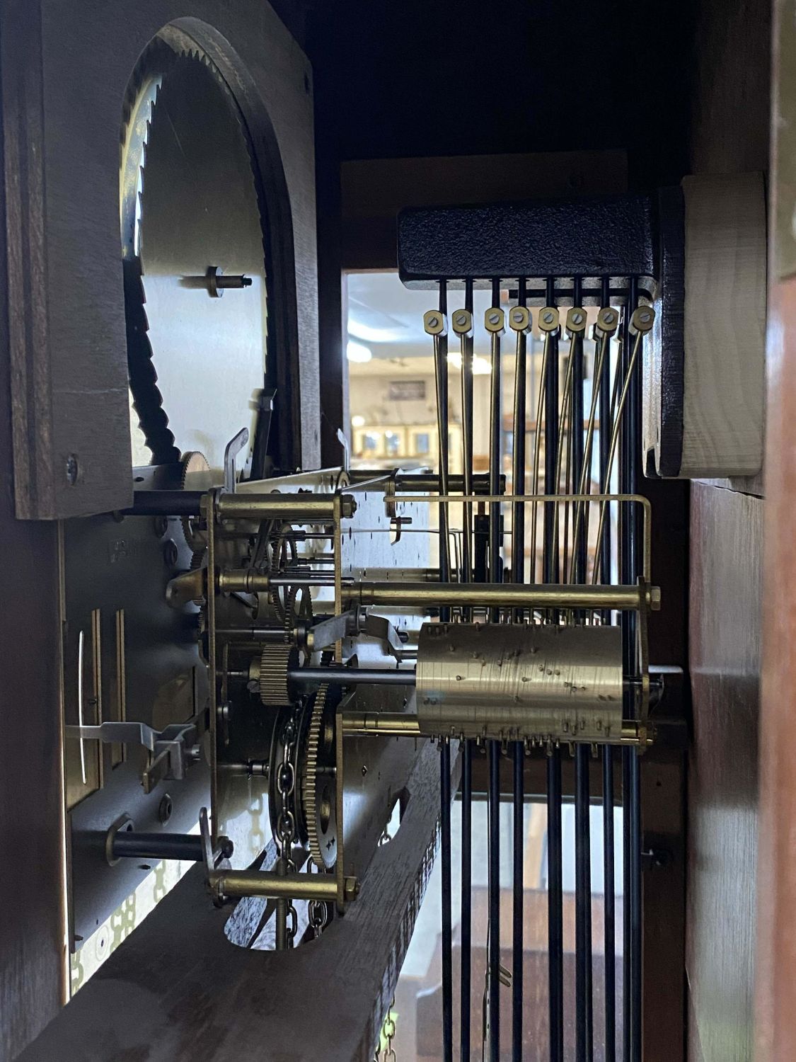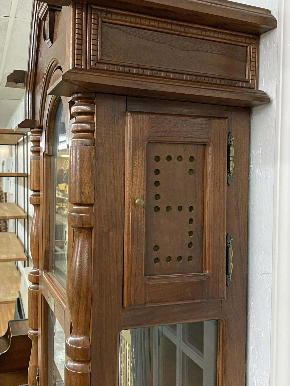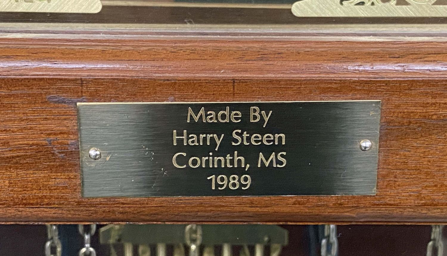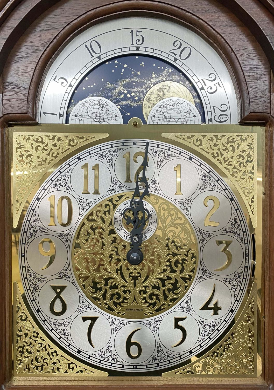 Emperor West German Grandfather Clock with Custom Built Walnut Case by Harry Steen, Corinth, Mississippi 1989. The clock has three weights, large brass pendulum, engraved brass name plate and custom case. The clock measures 83 1/2" H. X 25 1/2" W. X 13 1/2" Deep. Condition – The clock runs and keeps time. Case is in good condition.