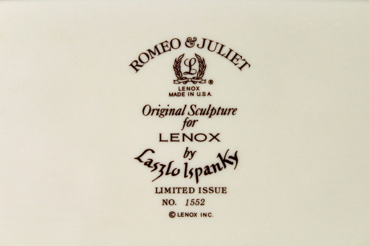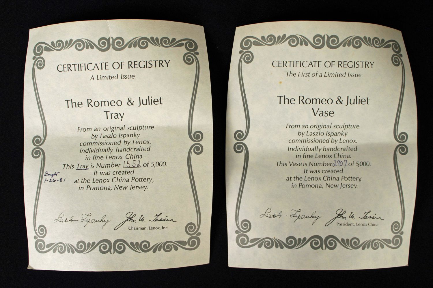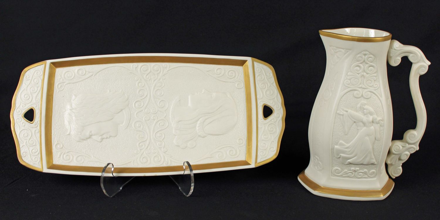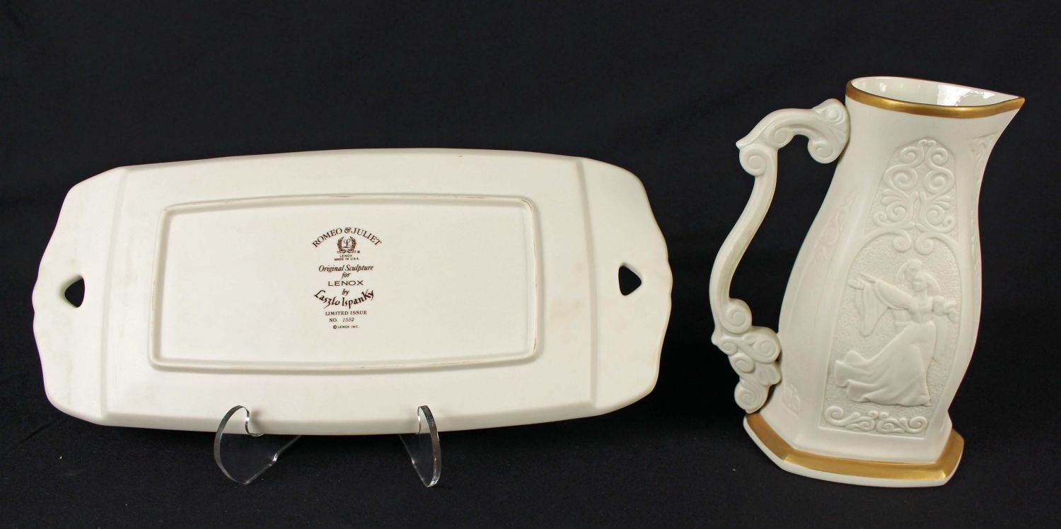 Lenox China Romeo & Juliet Pitcher and Tray From an Original Sculpture by Laszlo Ispanky Commissioned by Lenox. Both pieces have the original Certificate of Registry and are both 1 of 5,000 issued. The pitcher measures 9" H. Tray measures 7 3/8" X 16 1/4". Condition – Both pieces are in good condition and damage free.